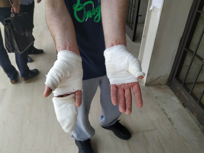 Στο Δικαστικό παρίσταται και το θύμα της επίθεσης με τον συνήγορο του κ. Μπούκα. Στη φωτογραφία εικονίζονται τα χέρια του 38χρονου που φέρουν τραύματα από την επίθεση και εγκαύματα από τους πυρσούς και τα καπνογόνα που έριξαν οι δράστες στη διάρκεια της επίθεσης.