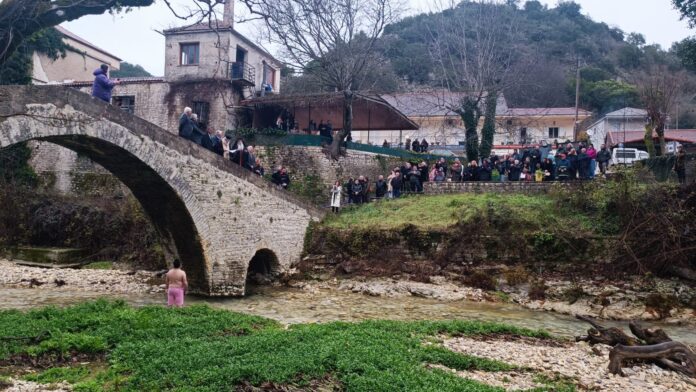 Ο εορτασμός ξεκίνησε το πρωί με την τέλεση της Θείας Λειτουργίας στον Ιερό Ναό Αγ. Γεωργίου και ακολούθησε ο αγιασμός των υδάτων με την τελετή κατάδυσης του Τιμίου Σταυρού στο γεφύρι Βροσίνας, όπου και φέτος ένας τολμηρός, ο Νίκος Νικολάτος, βούτηξε στα παγωμένα νερά του ποταμού και έπιασε τον Σταυρό.