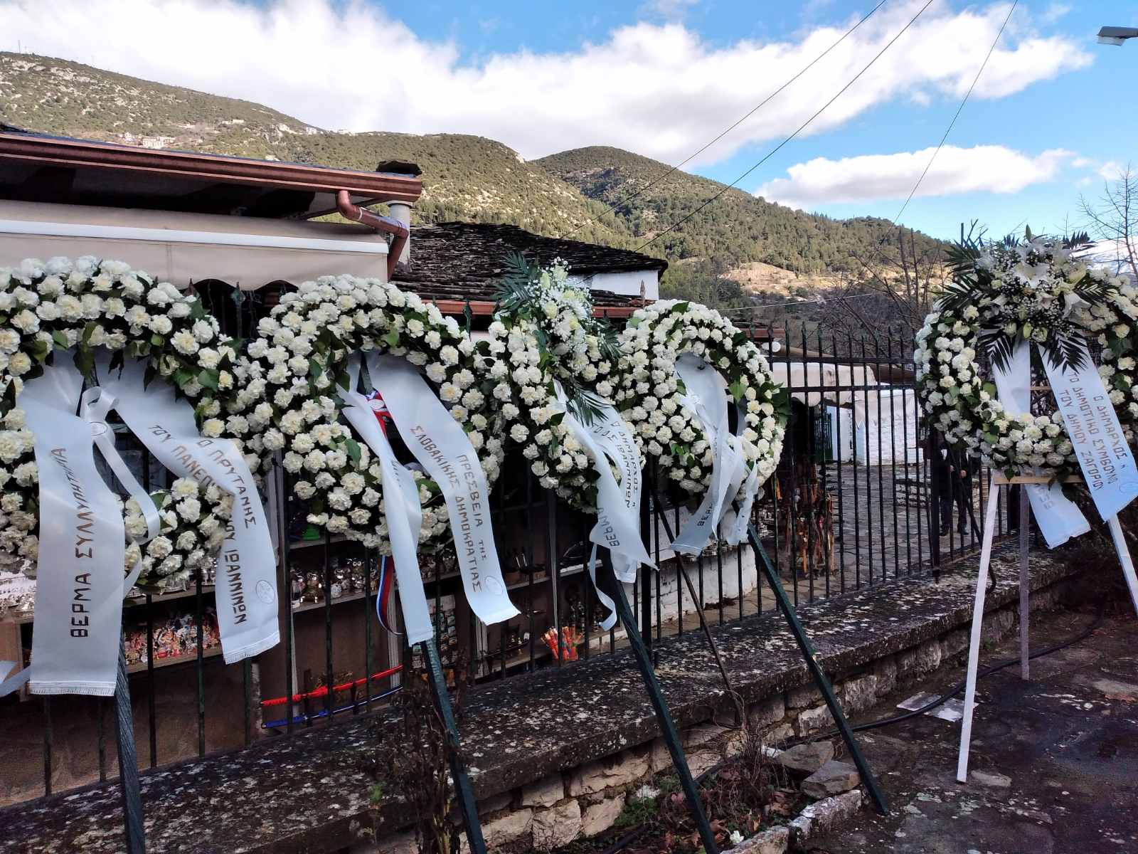 Πολλοί συγκινήθηκαν και δάκρυσαν όταν ένας φίλος του Καρόλου Παπούλια, ο Παναγιώτης Τσούνης από την Πωγωνιανή – το χωριό όπου ο εκλιπών έζησε τα μαθητικά του χρόνια, τα δύσκολα χρόνια της Κατοχής – έφερε τρία κλωνάρια δάφνης για να τον αποχαιρετήσει. Όπως μας είπε, ήταν από το μνημείο 3 φίλων του, που είχαν εκτελεστεί από τους Γερμανούς το 1943. «Στον Κάρολο. Η Πωγωνιανή αποχαιρετά το παλικάρι της», είναι η αφιέρωση πάνω στα κλαδιά της δάφνης.