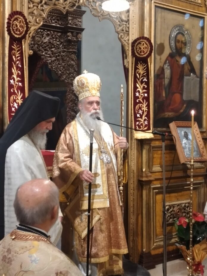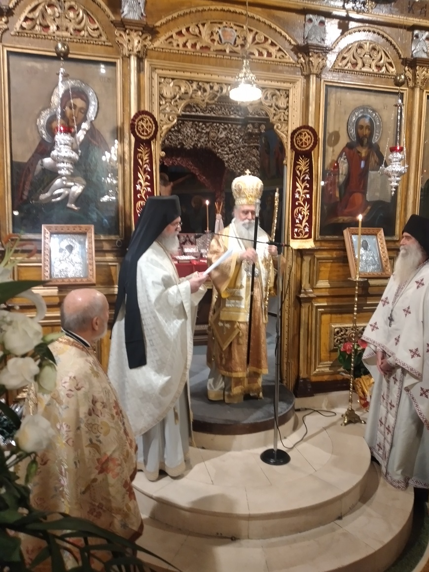 Μετά το πέρας της Θείας Λειτουργίας, ο Ηγούμενος του Μετοχίου πατέρας Πάμφιλος υποδέχθηκε με θερμά λόγια τον Αρχιεπίσκοπο και ευχήθηκε να πετύχει στο δύσκολο και θεάρεστο έργο που αναλαμβάνει, δίνοντάς του και ένα δώρο, αντιπροσωπευτικό δείγμα της τέχνης της αργυροχοΐας των Ιωαννίνων. Ακολούθησε η τοποθέτηση του Αρχιεπισκόπου Σινά Συμεών που αναφέρθηκε σε αυτούς τους δύσκολους καιρούς για τη Μονή Σινά και την Ορθοδοξία σε περιοχές της Μέσης Ανατολής και της Αραβίας, εκεί που όπως είπε, τίποτε δε θυμίζει τον Δυτικό κόσμο, αλλά που οι προκλήσεις είναι καθημερινές και σε πολλά επίπεδα και όχι μόνο, σε πνευματικό.