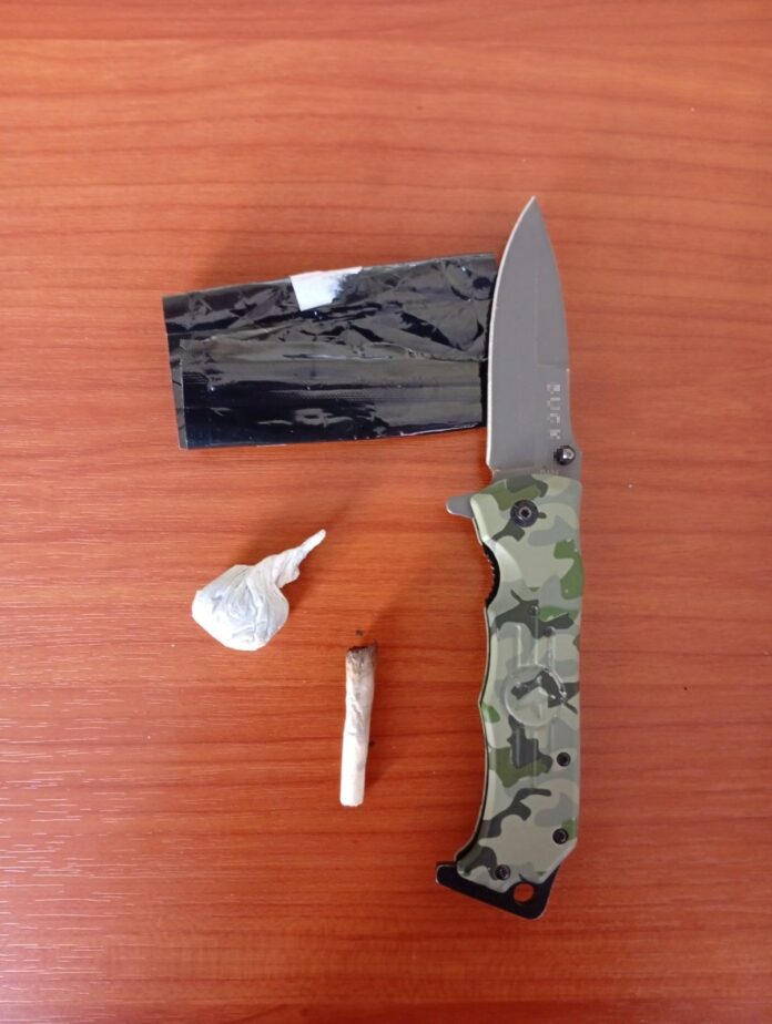 Κατά την έρευνα που επακολούθησε στο κατάλυμα καθώς και στη μόνιμη κατοικία τού ημεδαπού, βρέθηκαν και κατασχέθηκαν μικροποσότητες ακατέργαστης κάνναβης και αναδιπλούμενο μαχαίρι μήκους 20 εκατοστών.