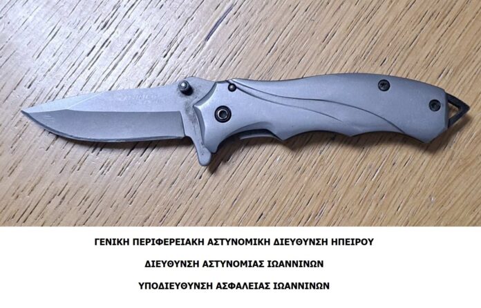 Συνελήφθη το βράδυ της Δευτέρας στα Ιωάννινα από αστυνομικούς της Ομάδας Πρόληψης και Καταστολής Εγκληματικότητας (Ο.Π.Κ.Ε.) της Υποδιεύθυνσης Ασφάλειας Ιωαννίνων ημεδαπός, διότι κατά τον αστυνομικό έλεγχο βρέθηκε στην κατοχή του και κατασχέθηκε αναδιπλούμενο μαχαίρι, μήκους 16 εκατοστών.