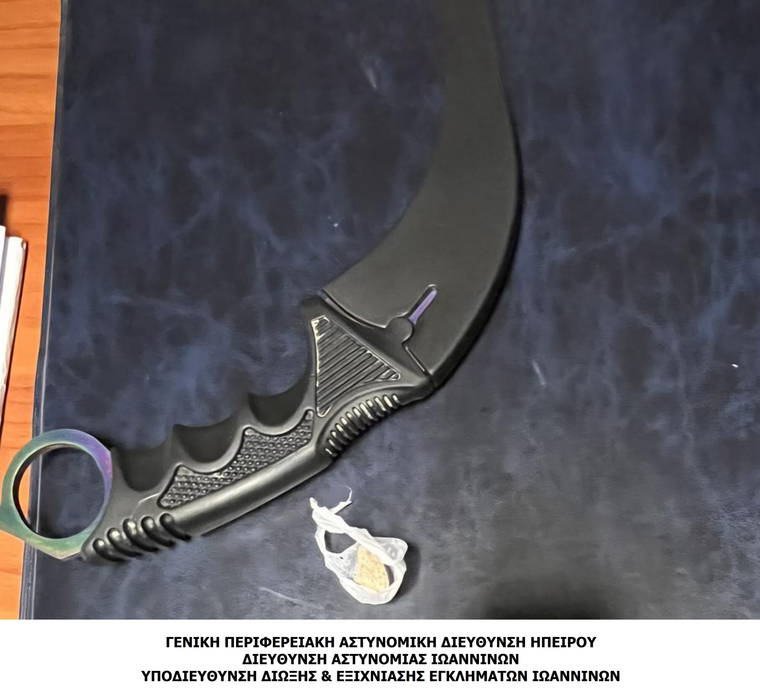 Σε έρευνα που ακολούθησε πάνω του αλλά και στην οικία του, εντοπίστηκαν και κατασχέθηκαν 14,2 γραμμάρια ακατέργαστης κάνναβης, ένα ναρκωτικό δισκίο καθώς και μαχαίρι τύπου «karambit» με μήκος 19 εκατοστά.