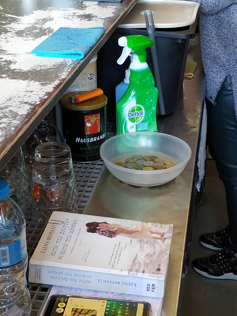 Ένα μπουκάλι από ρούμι γέμισε με αντισηπτικό διάλυμα και με την προσθήκη βαποριζατέρ, είναι έτοιμο προς χρήση, ενώ οι συναλλαγές με κέρματα γίνονται αυστηρά αφού τα νομίσματα «πέσουν» στο μπολ που είναι γεμάτο με αντισηπτικό. Η λεπτομέρεια της δεύτερης φωτογραφίας φυσικά, δεν είναι το Dettol, αλλά το βιβλίο ακριβώς δίπλα, για τις ώρες που δεν έχει κίνηση!