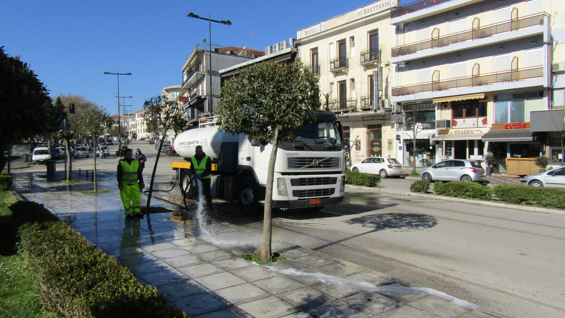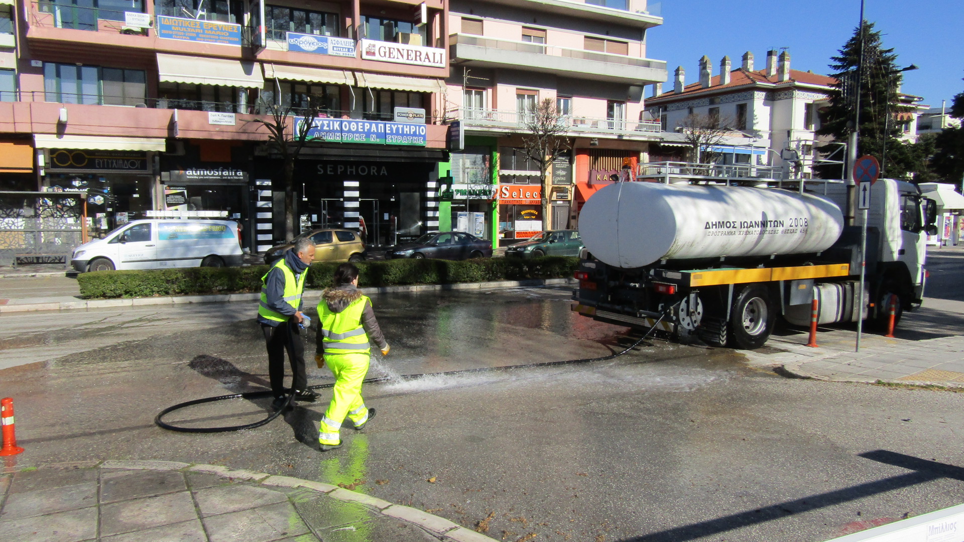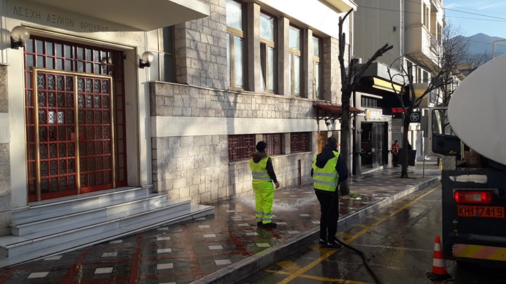 Το ειδικό υδροφόρο όχημα πλένει δρόμους, πεζοδρόμια και κοινόχρηστους χώρους και στη συνέχεια ακολουθεί απολύμανση.