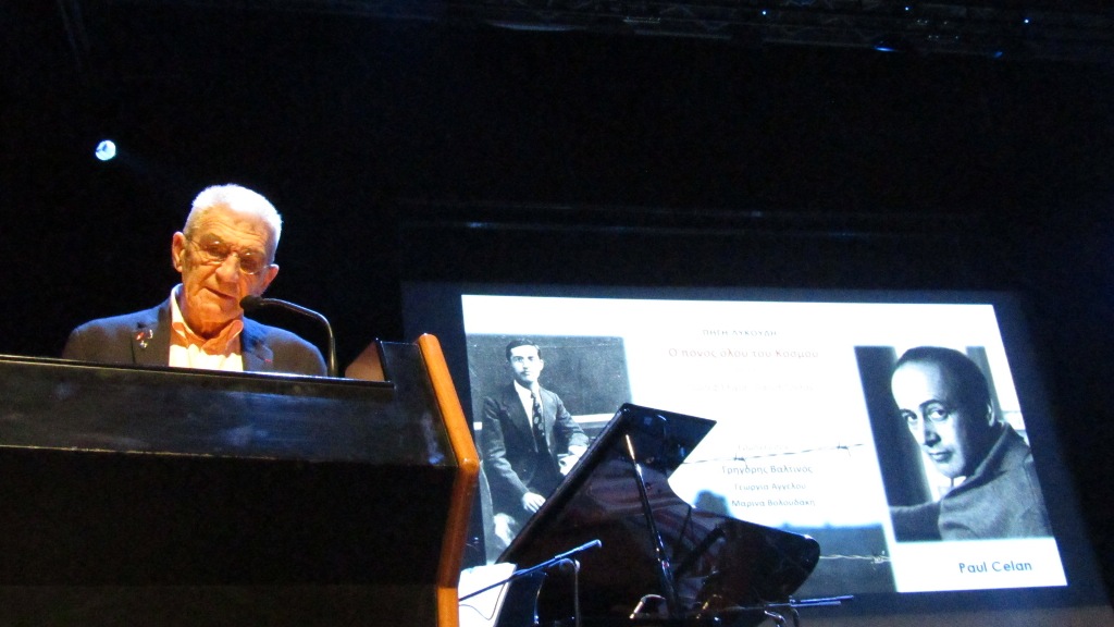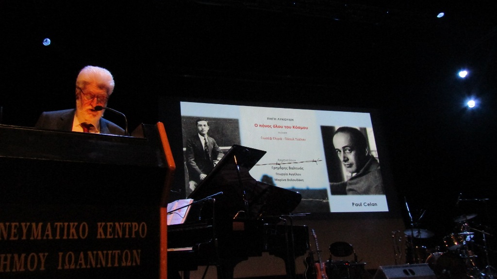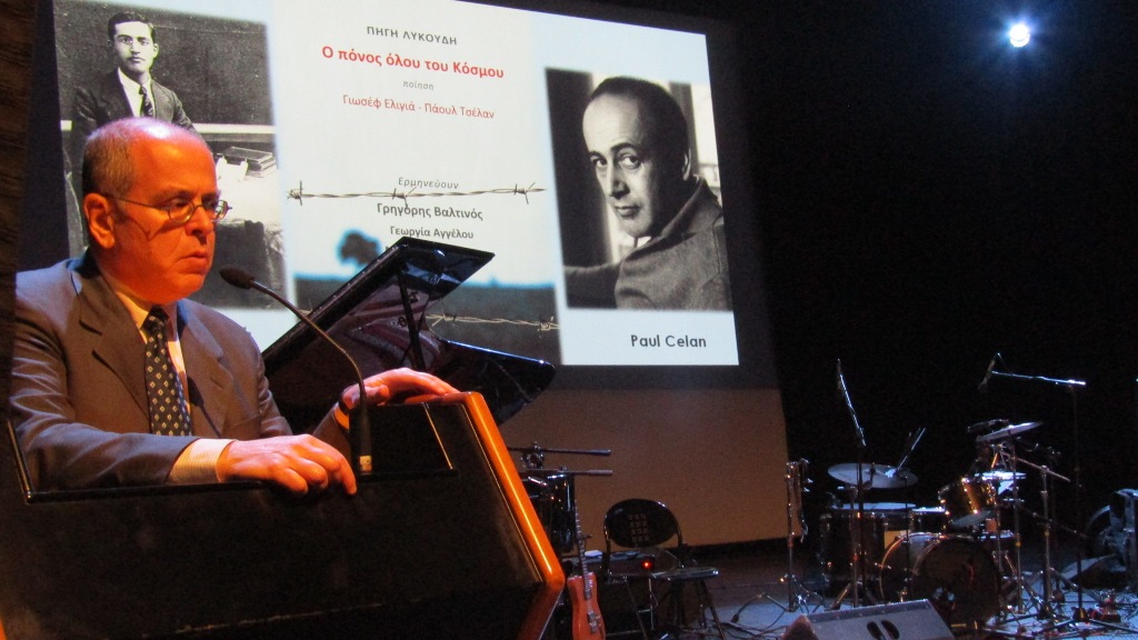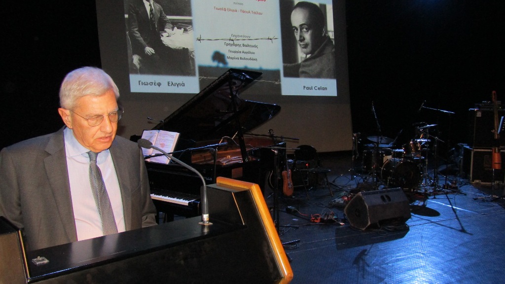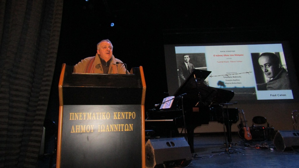 Ευχαριστώ και την κ. Λυκούδη για το εμβληματικό μουσικό έργο της –τη μελοποίηση για πρώτη φορά ποιημάτων του Γιαννιωτοεβραίου ποιητή Γιωσέφ Ελιγιά που πέραν του ποιητικού του έργου αποτέλεσε τη γέφυρα μεταξύ δυο πολιτισμών στους οποίους στηρίζεται ο Ευρωπαϊκός πολιτισμός αλλά και τη συγκλονιστική Φούγκα του Θανάτου του Γερμανοεβραίου ποιητή PaulCelan που επίσης μελοποιήθηκε από την κα Λυκούδη καθώς και όλους τους συντελεστές της εκδήλωσης και βέβαια τον κ. Γρηγόρη Βαλτινό που με μοναδικό τρόπο θα την αποδώσει».