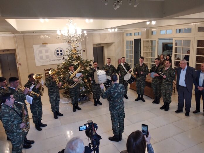 Η μπάντα της 8ηςΤ/Ξ/ΜΠ έψαλλε τα πρωτοχρονιάτικα κάλαντα στην Περιφέρεια Ηπείρου, παρουσία του Περιφερειάρχη, Αλ. Καχριμάνη, περιφερειακών συμβούλων και προσωπικού.