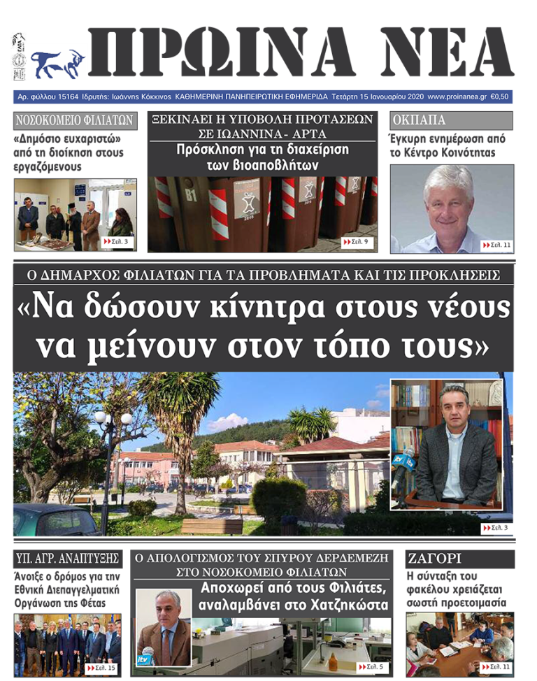 Διαβάστε στα πρωτοσέλιδα των γιαννιώτικων εφημερίδων σήμερα, Τετάρτη 15 Ιανουαρίου.