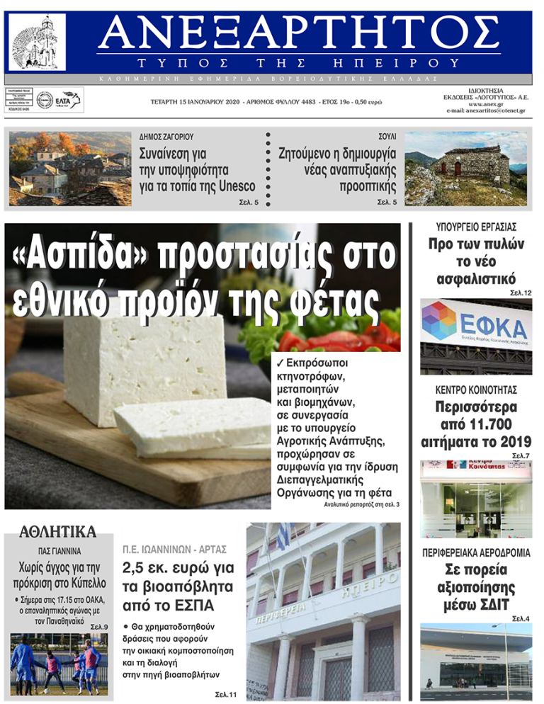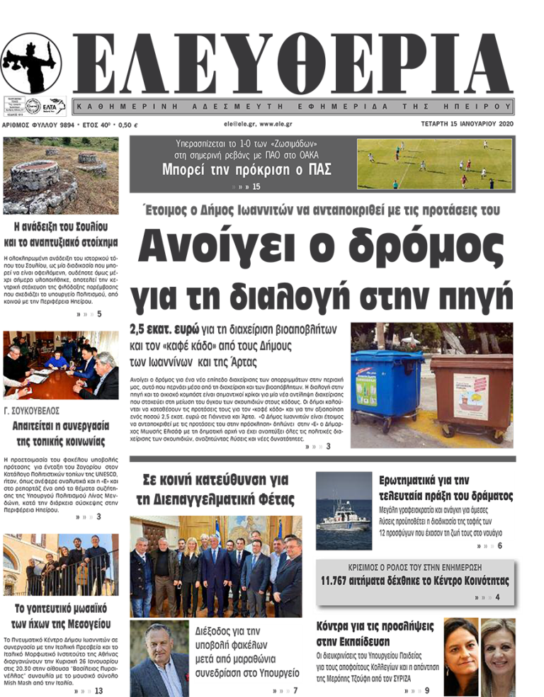 Διαβάστε στα πρωτοσέλιδα των γιαννιώτικων εφημερίδων σήμερα, Τετάρτη 15 Ιανουαρίου.