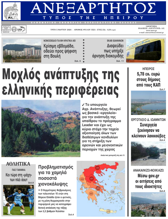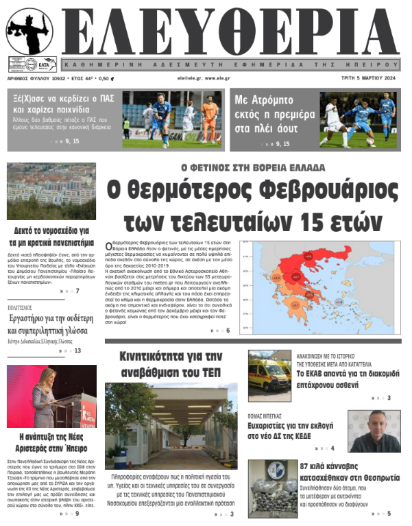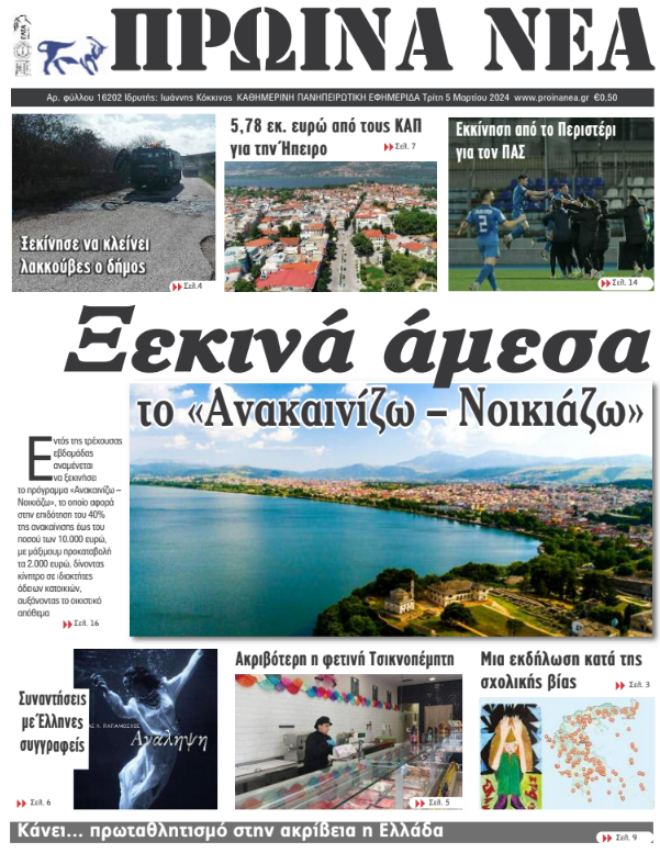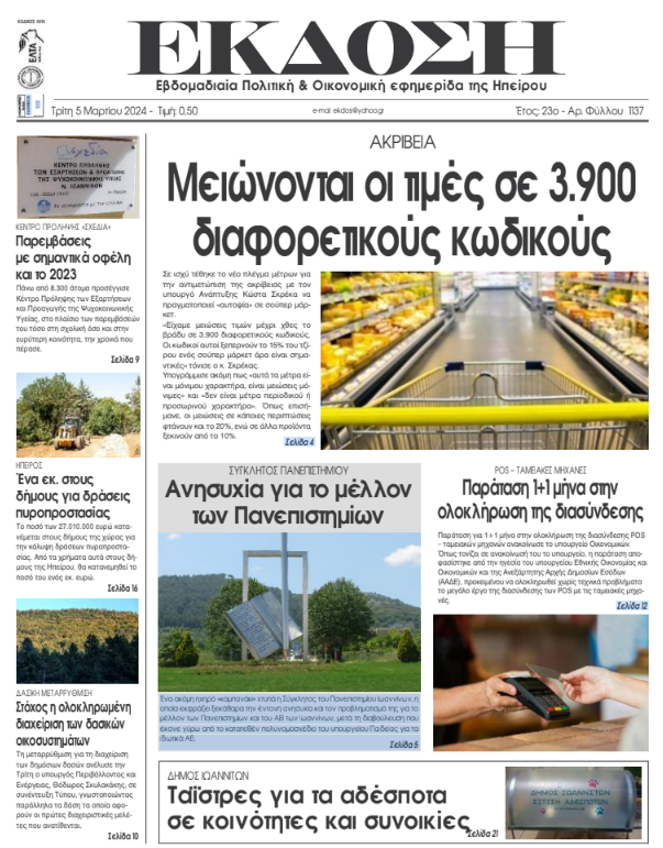 ΑρχικήΕΙΔΗΣΕΙΣΗΠΕΙΡΟΣ ΗΠΕΙΡΟΣ Τα πρωτοσέλιδα των γιαννιώτικων εφημερίδων 05.03.2024 0 FacebookTwitterWhatsAppEmailΤυπώνωViber Διαβάστε στα πρωτοσέλιδα των γιαννιώτικων εφημερίδων της Τρίτης 5 Μαρτίου TagsΓΙΑΝΝΙΩΤΙΚΕΣ ΕΦΗΜΕΡΙΔΕΣΠΡΩΤΟΣΕΛΙΔΑ FacebookTwitterWhatsAppEmailΤυπώνωViber Προηγούμενο άρθροΑπόκριες στα Γιάννενα – Το πρόγραμμα του ΔήμουΕπόμενο άρθροΗ ανάπτυξη της Νέας Αριστεράς στην Ήπειρο ΣΧΕΤΙΚΑ ΑΡΘΡΑ Τα πρωτοσέλιδα των γιαννιώτικων εφημερίδων TOP STORIES 08.11.2025 Τα πρωτοσέλιδα των γιαννιώτικων εφημερίδων ΗΠΕΙΡΟΣ 07.11.2025 Τα πρωτοσέλιδα των γιαννιώτικων εφημερίδων ΗΠΕΙΡΟΣ 06.11.2025 Τα πρωτοσέλιδα των γιαννιώτικων εφημερίδων ΗΠΕΙΡΟΣ 05.11.2025 Τα πρωτοσέλιδα των γιαννιώτικων εφημερίδων ΗΠΕΙΡΟΣ 04.11.2025 Τα πρωτοσέλιδα των γιαννιώτικων εφημερίδων TOP STORIES 01.11.2025 ΣΤΗΝ ΙΔΙΑ ΚΑΤΗΓΟΡΙΑ Τα πρωτοσέλιδα των γιαννιώτικων εφημερίδων TOP STORIES 08.11.2025 Μαθητές του 5ου Γυμνασίου Ιωαννίνων στην κορυφή του Μιτσικελίου ΗΠΕΙΡΟΣ 07.11.2025 Επίτιμος Διδάκτορας του Τμήματος Φιλολογίας ο Γιώργος Κεχαγιόγλου ΗΠΕΙΡΟΣ 07.11.2025 Οι ναυαγοσωστικές δαπάνες «πνίγουν» τους δήμους ΗΠΕΙΡΟΣ 07.11.2025 Ενημερωτική ημερίδα στα Ιωάννινα για τη δωρεά και μεταμόσχευση οργάνων ΗΠΕΙΡΟΣ 07.11.2025 Εγκαίνια στο Κατάστημα Αναμνηστικών του Πανεπιστημίου Ιωαννίνων ΗΠΕΙΡΟΣ 07.11.2025 ΜΗ ΧΑΣΕΤΕ Τα πρωτοσέλιδα των γιαννιώτικων εφημερίδων Οι ναυαγοσωστικές δαπάνες «πνίγουν» τους δήμους Έκτακτο δελτίο επιδείνωσης από την ΕΜΥ – Πού θα βρέχει το επόμενο τριήμερο Μπαλωθιές τέλος στην Κρήτη – Τα μέτρα για την παράνομη οπλοκατοχή Χωρίς πινακίδες παραμένουν χιλιάδες δίκυκλα ΔΗΜΟΦΙΛΗ Κατέρρευσε στο β’ ημίχρονο ο ΠΑΣ απέναντι στον Ηρακλή Η Ευρωπαϊκή Ένωση στηρίζει την καθαρή μετάβαση Τα πρωτοσέλιδα των γιαννιώτικων εφημερίδων Γ. ΣΤΥΛΙΟΣ -Μείωση φόρων που ενισχύει το πραγματικό εισόδημα Ιταλία: Αυξάνονται οι αιωνόβιοι στη χώρα -2.000 περισσότεροι σε σχέση με πέρυσι