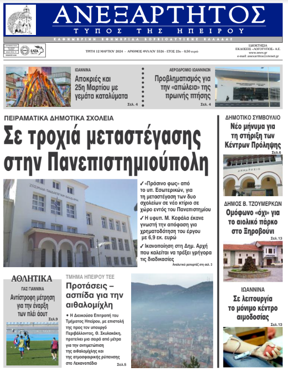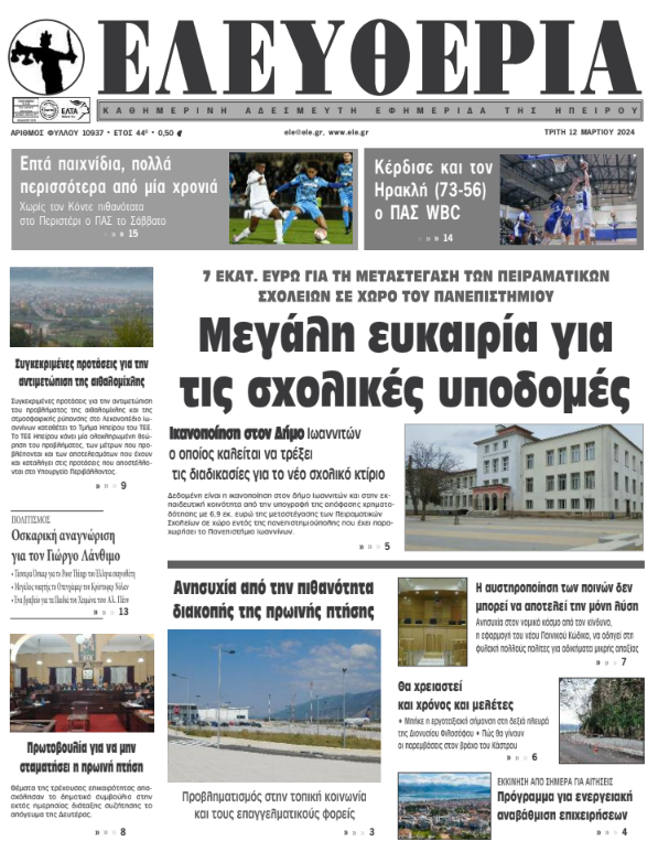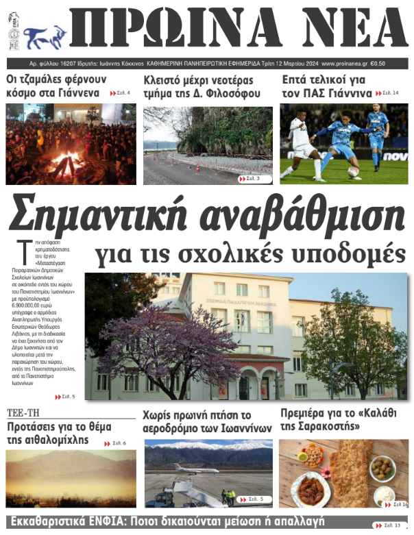 ΑρχικήΕΙΔΗΣΕΙΣΗΠΕΙΡΟΣ ΗΠΕΙΡΟΣ Τα πρωτοσέλιδα των γιαννιώτικων εφημερίδων 12.03.2024 0 FacebookTwitterWhatsAppEmailΤυπώνωViber Διαβάστε στα πρωτοσέλιδα των γιαννιώτικων εφημερίδων της Τρίτης 12 Μαρτίου TagsΓΙΑΝΝΙΩΤΙΚΕΣ ΕΦΗΜΕΡΙΔΕΣΠΡΩΤΟΣΕΛΙΔΑ FacebookTwitterWhatsAppEmailΤυπώνωViber Προηγούμενο άρθροΗΠΑ: Συνετρίβη ιδιωτικό αεροπλάνο στη Βιρτζίνια –5 νεκροί (βίντεο)Επόμενο άρθροΠρόγραμμα για ενεργειακή αναβάθμιση επιχειρήσεων ΣΧΕΤΙΚΑ ΑΡΘΡΑ Τα πρωτοσέλιδα των γιαννιώτικων εφημερίδων TOP STORIES 10.12.2025 Τα πρωτοσέλιδα των γιαννιώτικων εφημερίδων ΗΠΕΙΡΟΣ 09.12.2025 Τα πρωτοσέλιδα των γιαννιώτικων εφημερίδων ΗΠΕΙΡΟΣ 06.12.2025 Τα πρωτοσέλιδα των γιαννιώτικων εφημερίδων ΗΠΕΙΡΟΣ 05.12.2025 Τα πρωτοσέλιδα των γιαννιώτικων εφημερίδων ΗΠΕΙΡΟΣ 04.12.2025 Τα πρωτοσέλιδα των γιαννιώτικων εφημερίδων ΗΠΕΙΡΟΣ 03.12.2025 ΣΤΗΝ ΙΔΙΑ ΚΑΤΗΓΟΡΙΑ Εξαρθρώθηκε συμμορία που διακινούσε ναρκωτικά στα Γιάννενα ΗΠΕΙΡΟΣ 10.12.2025 Βρέθηκε η σορός του 63χρονου ψαρά στον Λύχνο ΗΠΕΙΡΟΣ 10.12.2025 Μήνυμα κατά της έμφυλης βίας και υπέρ της γυναικείας επιχειρηματικότητας ΗΠΕΙΡΟΣ 10.12.2025 Αποστάσεις της Περιφέρειας από τις εκτιμήσεις ζημιών στα Τζουμέρκα ΗΠΕΙΡΟΣ 10.12.2025 Μια νέα πρόταση για την ενοποίηση της πλατείας Ιωαννίνων ΗΠΕΙΡΟΣ 10.12.2025 Τα πρωτοσέλιδα των γιαννιώτικων εφημερίδων TOP STORIES 10.12.2025 ΜΗ ΧΑΣΕΤΕ Εισαγγελική παρέμβαση για τις αγροτικές κινητοποιήσεις Μια νέα πρόταση για την ενοποίηση της πλατείας Ιωαννίνων Τα πρωτοσέλιδα των γιαννιώτικων εφημερίδων Εγκρίθηκε η χωροθέτηση των νέων «έξυπνων» υποδομών Ξεκινούν οι εργασίες για την προστασία της Παμβώτιδας ΔΗΜΟΦΙΛΗ Έκτακτη σύσκεψη για τις πληρωμές των αγροτών στο Μαξίμου Μια νέα πρόταση για την ενοποίηση της πλατείας Ιωαννίνων Βρέθηκε η σορός του 63χρονου ψαρά στον Λύχνο Ώρα αποφάσεων για τον ΠΑΣ Γιάννινα Η Μπάφρα τιμά την κληρονομιά του Δυτικού Πόντου