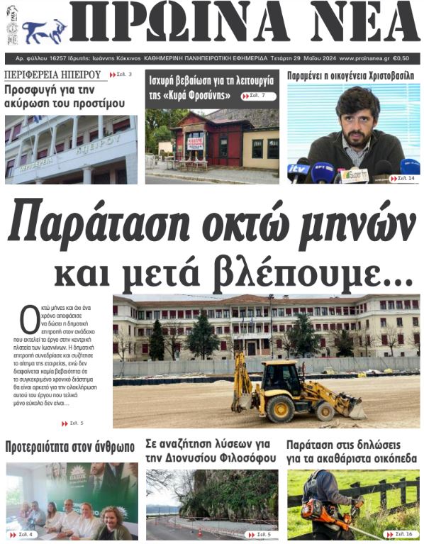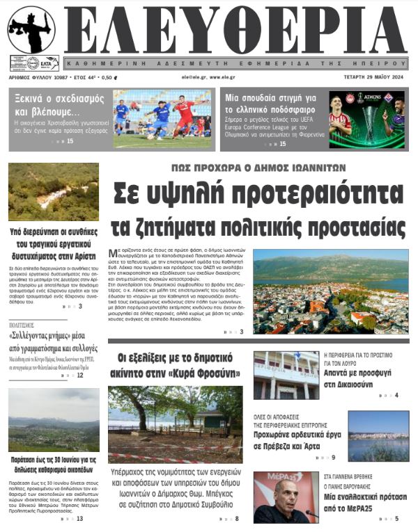 ΑρχικήΕΙΔΗΣΕΙΣΗΠΕΙΡΟΣ ΗΠΕΙΡΟΣ Τα πρωτοσέλιδα των γιαννιώτικων εφημερίδων 29.05.2024 0 FacebookTwitterWhatsAppEmailΤυπώνωViber Διαβάστε στα πρωτοσέλιδα των γιαννιώτικων εφημερίδων της Τετάρτης 29 Μαΐου TagsΓΙΑΝΝΙΩΤΙΚΕΣ ΕΦΗΜΕΡΙΔΕΣΠΡΩΤΟΣΕΛΙΔΑ FacebookTwitterWhatsAppEmailΤυπώνωViber Προηγούμενο άρθροΕυρωεκλογές 2024 -Ποιοι εργαζόμενοι δικαιούνται εκλογική άδειαΕπόμενο άρθροΥπό διερεύνηση οι συνθήκες του τραγικού εργατικού δυστυχήματος στην Αρίστη ΣΧΕΤΙΚΑ ΑΡΘΡΑ Τα πρωτοσέλιδα των γιαννιώτικων εφημερίδων TOP STORIES 13.12.2025 Τα πρωτοσέλιδα των γιαννιώτικων εφημερίδων ΗΠΕΙΡΟΣ 12.12.2025 Τα πρωτοσέλιδα των γιαννιώτικων εφημερίδων ΗΠΕΙΡΟΣ 11.12.2025 Τα πρωτοσέλιδα των γιαννιώτικων εφημερίδων ΗΠΕΙΡΟΣ 10.12.2025 Τα πρωτοσέλιδα των γιαννιώτικων εφημερίδων ΗΠΕΙΡΟΣ 09.12.2025 Τα πρωτοσέλιδα των γιαννιώτικων εφημερίδων ΗΠΕΙΡΟΣ 06.12.2025 ΣΤΗΝ ΙΔΙΑ ΚΑΤΗΓΟΡΙΑ Δ. ΑΡΤΑΙΩΝ -Αναγκαία προσαρμογή των δημοτικών τελών για το 2026 ΗΠΕΙΡΟΣ 13.12.2025 Προχωρά σε «λουκέτο» δημαρχείων η ΠΕΔ Ηπείρου – Σήμα κινδύνου για την αυτοδιοίκηση ΗΠΕΙΡΟΣ 13.12.2025 Δ. ΒΟΡΕΙΩΝ ΤΖΟΥΜΕΡΚΩΝ -Παρέμβαση για το θεσμικό πλαίσιο περί κοινωφελών περιουσιών και κληροδοτημάτων ΗΠΕΙΡΟΣ 13.12.2025 Τα πρωτοσέλιδα των γιαννιώτικων εφημερίδων TOP STORIES 13.12.2025 Ζητούνται άμεσες λύσεις για την αιθαλομίχλη – Συνεχίζεται η σιωπή του ΥΠΕΝ ΗΠΕΙΡΟΣ 12.12.2025 Μπέγκας: Άμεση ενεργοποίηση μέτρων κατά της αιθαλομίχλης – Η πόλη δεν μπορεί να περιμένει ΗΠΕΙΡΟΣ 12.12.2025 ΜΗ ΧΑΣΕΤΕ Προχωρά σε «λουκέτο» δημαρχείων η ΠΕΔ Ηπείρου – Σήμα κινδύνου για την αυτοδιοίκηση Τα πρωτοσέλιδα των γιαννιώτικων εφημερίδων Μητσοτάκης: Τη Δευτέρα περιμένω στο γραφείο μου αντιπροσωπεία αγροτών Μπέγκας: Άμεση ενεργοποίηση μέτρων κατά της αιθαλομίχλης – Η πόλη δεν μπορεί να περιμένει Έκθεση αρχιτεκτονικών προτάσεων για τη Δημοτική Αγορά Αγ. Μαρίνας ΔΗΜΟΦΙΛΗ ΑΛ. ΧΑΡΙΤΣΗΣ -“Η κυβέρνηση αφήνει τον πρωτογενή τομέα να καταρρεύσει” ΕΕ: Επ’ αόριστον πάγωμα των ρωσικών περιουσιακών στοιχείων αποφάσισαν τα κράτη-μέλη Ν. ΚΕΡΑΜΕΩΣ -“Περισσότερες συλλογικές συμβάσεις και αυξήσεις μισθών στις αρχές του 2026” Χολαργός: Στη φυλακή οι δύο δράστες της επίθεσης σε 14χρονο Ανταγωνιστικός ο ΠΑΣ, λύγισε στο τέλος του ημιχρόνου στην Καρδίτσα