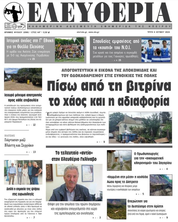 ΑρχικήΕΙΔΗΣΕΙΣΗΠΕΙΡΟΣ ΗΠΕΙΡΟΣ Τα πρωτοσέλιδα των γιαννιώτικων εφημερίδων 04.06.2024 0 FacebookTwitterWhatsAppEmailΤυπώνωViber Διαβάστε στα πρωτοσέλιδα των γιαννιώτικων εφημερίδων της Τρίτης 4 Ιουνίου TagsΓΙΑΝΝΙΩΤΙΚΕΣ ΕΦΗΜΕΡΙΔΕΣΠΡΩΤΟΣΕΛΙΔΑ FacebookTwitterWhatsAppEmailΤυπώνωViber Προηγούμενο άρθροΕργατικό ατύχημα στο Σούλι -Τραυματίστηκε οδηγός φορτηγούΕπόμενο άρθροΜουσικοχορευτικό αντάμωμα Ορφέα Λευκάδας και Πήγασου ΣΧΕΤΙΚΑ ΑΡΘΡΑ Τα πρωτοσέλιδα των γιαννιώτικων εφημερίδων ΗΠΕΙΡΟΣ 05.11.2025 Τα πρωτοσέλιδα των γιαννιώτικων εφημερίδων ΗΠΕΙΡΟΣ 04.11.2025 Τα πρωτοσέλιδα των γιαννιώτικων εφημερίδων TOP STORIES 01.11.2025 Τα πρωτοσέλιδα των γιαννιώτικων εφημερίδων ΗΠΕΙΡΟΣ 31.10.2025 Τα πρωτοσέλιδα των γιαννιώτικων εφημερίδων ΗΠΕΙΡΟΣ 30.10.2025 Τα πρωτοσέλιδα των γιαννιώτικων εφημερίδων ΗΠΕΙΡΟΣ 28.10.2025 ΣΤΗΝ ΙΔΙΑ ΚΑΤΗΓΟΡΙΑ «Άναψε πράσινο» για Σωφρονιστικό Κατάστημα στους Φιλιάτες ΗΠΕΙΡΟΣ 05.11.2025 206 πυρκαγιές με 61.000 καμένα στρέμματα στην Ήπειρο ΗΠΕΙΡΟΣ 05.11.2025 Κινητοποιήσεις για τα ΕΛΤΑ σε Μέτσοβο – Καναλάκι TOP STORIES 05.11.2025 Αντιπαράθεση στη Ζίτσα για τη στάση της αντιπολίτευσης στο Δημοτικό Συμβούλιο ΗΠΕΙΡΟΣ 05.11.2025 Δήμος Ζίτσας: Απόφαση σταθμός της δημοτική αρχής για τη συνέχιση της λειτουργίας των ΕΛ.ΤΑ. ΗΠΕΙΡΟΣ 05.11.2025 Τμηματική διακοπή κυκλοφορίας στην 28ης Οκτωβρίου λόγω εργασιών διαγράμμισης ΗΠΕΙΡΟΣ 05.11.2025 ΜΗ ΧΑΣΕΤΕ «Άναψε πράσινο» για Σωφρονιστικό Κατάστημα στους Φιλιάτες 206 πυρκαγιές με 61.000 καμένα στρέμματα στην Ήπειρο Κινητοποιήσεις για τα ΕΛΤΑ σε Μέτσοβο – Καναλάκι Δήμος Ζίτσας: Απόφαση σταθμός της δημοτική αρχής για τη συνέχιση της λειτουργίας των ΕΛ.ΤΑ. Προτάσεις του ΤΕΕ για τη συνέχιση της λειτουργίας και των έργων της Εγνατίας ΔΗΜΟΦΙΛΗ Προσωπικός Αριθμός: Εκπνέει σήμερα η προθεσμία – Αυτόματη απόδοση από αύριο Συνελήφθη οδηγός στα Ιωάννινα για επικίνδυνη οδήγηση και απείθεια Συνελήφθη αλλοδαπός στα Ιωάννινα για παράνομη κατοχή μαχαιριού Γαλλία: Αυτοκίνητο έπεσε σε πλήθος στο νησί Ολερόν Πολιτικές εξελίξεις και προσυνεδριακός διάλογος