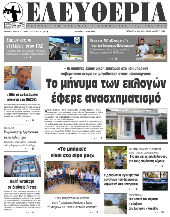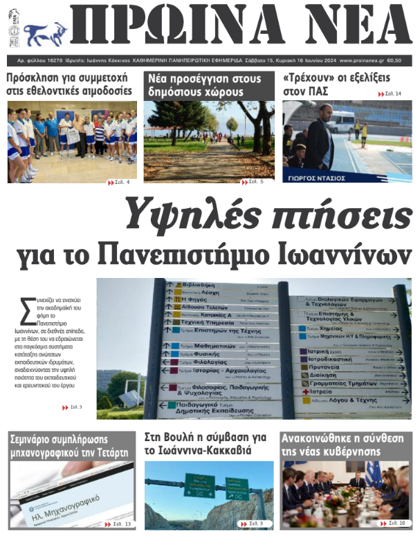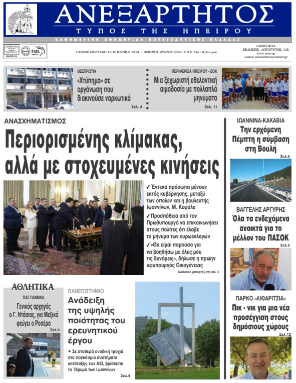 ΑρχικήΕΙΔΗΣΕΙΣΗΠΕΙΡΟΣ ΗΠΕΙΡΟΣ Τα πρωτοσέλιδα των γιαννιώτικων εφημερίδων 15.06.2024 0 FacebookTwitterWhatsAppEmailΤυπώνωViber Διαβάστε στα πρωτοσέλιδα των γιαννιώτικων εφημερίδων της 15-16 Ιουνίου TagsΓΙΑΝΝΙΩΤΙΚΕΣ ΕΦΗΜΕΡΙΔΕΣΠΡΩΤΟΣΕΛΙΔΑ FacebookTwitterWhatsAppEmailΤυπώνωViber Προηγούμενο άρθροΑΠΟ ΤΗΝ ΠΕΡΙΦΕΙΡΕΙΑ ΗΠΕΙΡΟΥ -Νέες απόπειρες απάτης για δήθεν εξόφληση λογαριασμώνΕπόμενο άρθροΜ. Κεφάλα: «Θα συνεχίσω να εργάζομαι με ζήλο» ΣΧΕΤΙΚΑ ΑΡΘΡΑ Τα πρωτοσέλιδα των γιαννιώτικων εφημερίδων TOP STORIES 24.12.2025 Τα πρωτοσέλιδα των γιαννιώτικων εφημερίδων ΗΠΕΙΡΟΣ 23.12.2025 Τα πρωτοσέλιδα των γιαννιώτικων εφημερίδων ΗΠΕΙΡΟΣ 19.12.2025 Τα πρωτοσέλιδα των γιαννιώτικων εφημερίδων ΗΠΕΙΡΟΣ 18.12.2025 Τα πρωτοσέλιδα των γιαννιώτικων εφημερίδων ΗΠΕΙΡΟΣ 17.12.2025 Τα πρωτοσέλιδα των γιαννιώτικων εφημερίδων ΗΠΕΙΡΟΣ 16.12.2025 ΣΤΗΝ ΙΔΙΑ ΚΑΤΗΓΟΡΙΑ Έντονες αντιδράσεις στα κεντρικά προκαλεί το πρωτοσέλιδο των «Πρωινών Νέων» ΗΠΕΙΡΟΣ 24.12.2025 Επιτυχημένη παρουσίαση των αποτελεσμάτων του προγράμματος GINGER για την πρόληψη της άνοιας ΗΠΕΙΡΟΣ 24.12.2025 Ηλεκτρονική βεβαίωση παραβάσεων από τη Δημοτική Αστυνομία Ιωαννίνων ΗΠΕΙΡΟΣ 24.12.2025 Χριστουγεννιάτικες μελωδίες και ευχές στο Δημαρχείο Ιωαννίνων ΗΠΕΙΡΟΣ 24.12.2025 Ιωάννινα: Συνελήφθη ιδιοκτήτης καταστήματος για διάθεση αλκοόλ σε ανηλίκους ΗΠΕΙΡΟΣ 24.12.2025 Τα πρωτοσέλιδα των γιαννιώτικων εφημερίδων TOP STORIES 24.12.2025 ΜΗ ΧΑΣΕΤΕ Έντονες αντιδράσεις στα κεντρικά προκαλεί το πρωτοσέλιδο των «Πρωινών Νέων» Λήγει στις 31 Δεκεμβρίου η προθεσμία για τα τέλη κυκλοφορίας 2026 Χριστουγεννιάτικη έξοδος με αυξημένη κίνηση και αγροτικά μπλόκα Ανοιχτά τα καταστήματα την παραμονή Χριστουγέννων Κακοκαιρία τα Χριστούγεννα – Ισχυρά φαινόμενα σε πολλές περιοχές ΔΗΜΟΦΙΛΗ Επίδομα θέρμανσης: Καταβλήθηκε η πρώτη δόση σε 1,17 εκατ. νοικοκυριά Ληστείες σε βάρος ανηλίκων που έλεγαν τα κάλαντα Φάμελλος: «Το φετινό χριστουγεννιάτικο τραπέζι είναι έως 30% ακριβότερο από πέρσι» Γεραπετρίτης: Ανοικτοί δίαυλοι με την Τουρκία για αποτροπή εντάσεων Κυκλοφόρησε το πρώτο παιδικό βιβλίο της Αθηνάς Γεωργοπούλου