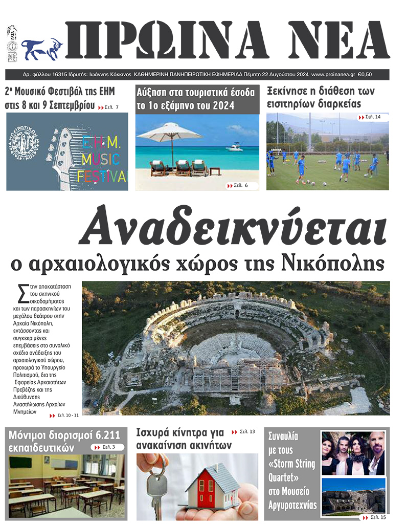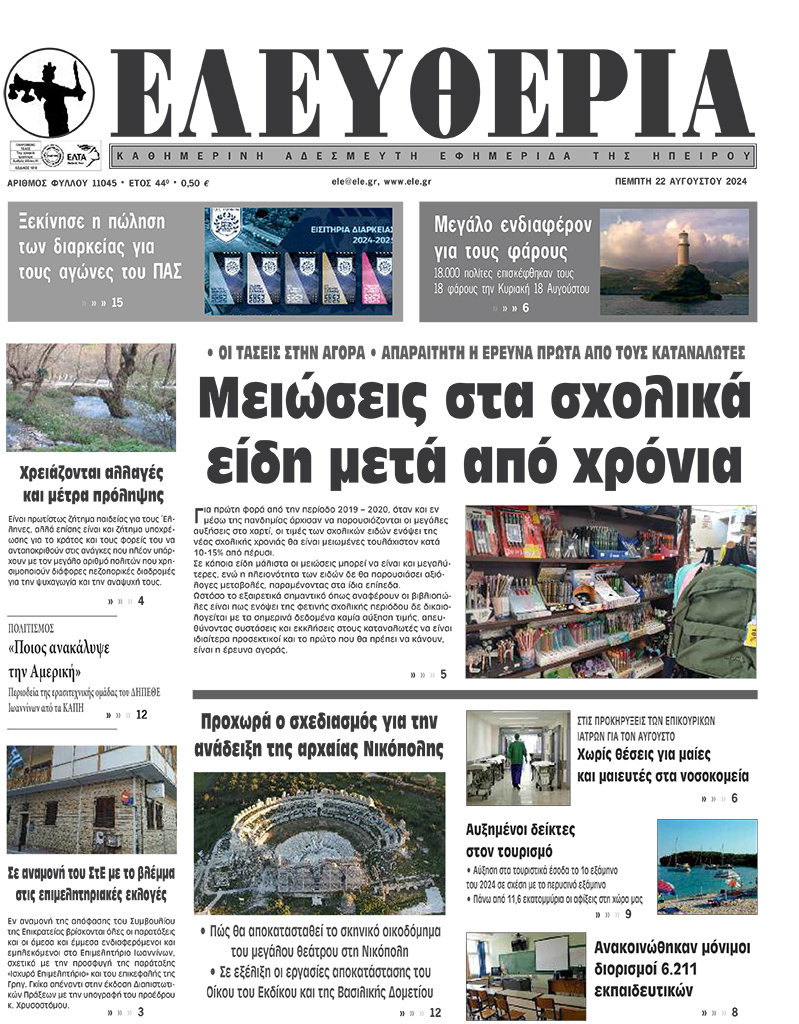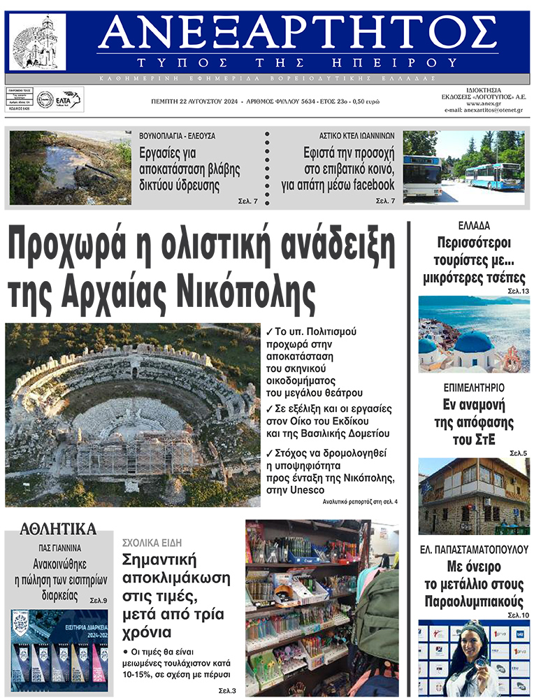 ΑρχικήΕΙΔΗΣΕΙΣΗΠΕΙΡΟΣ ΗΠΕΙΡΟΣ Τα πρωτοσέλιδα των γιαννιώτικων εφημερίδων 22.08.2024 0 FacebookTwitterWhatsAppEmailΤυπώνωViber Διαβάστε στα πρωτοσέλιδα των γιαννιώτικων εφημερίδων της Πέμπτης 22 Αυγούστου TagsΓΙΑΝΝΙΩΤΙΚΕΣ ΕΦΗΜΕΡΙΔΕΣΠΡΩΤΟΣΕΛΙΔΑ FacebookTwitterWhatsAppEmailΤυπώνωViber Προηγούμενο άρθροAκίνητα: Στα κινητά τηλέφωνα όλα τα στοιχεία μέσω Gov.gr WalletΕπόμενο άρθροΠροχωρά ο σχεδιασμός για την ανάδειξη της αρχαίας Νικόπολης ΣΧΕΤΙΚΑ ΑΡΘΡΑ Τα πρωτοσέλιδα των γιαννιώτικων εφημερίδων TOP STORIES 08.11.2025 Τα πρωτοσέλιδα των γιαννιώτικων εφημερίδων ΗΠΕΙΡΟΣ 07.11.2025 Τα πρωτοσέλιδα των γιαννιώτικων εφημερίδων ΗΠΕΙΡΟΣ 06.11.2025 Τα πρωτοσέλιδα των γιαννιώτικων εφημερίδων ΗΠΕΙΡΟΣ 05.11.2025 Τα πρωτοσέλιδα των γιαννιώτικων εφημερίδων ΗΠΕΙΡΟΣ 04.11.2025 Τα πρωτοσέλιδα των γιαννιώτικων εφημερίδων TOP STORIES 01.11.2025 ΣΤΗΝ ΙΔΙΑ ΚΑΤΗΓΟΡΙΑ Στις 22 Νοεμβρίου η τελετή ενθρόνισης του Μητροπολίτη Κόνιτσας ΗΠΕΙΡΟΣ 09.11.2025 Τα πρωτοσέλιδα των γιαννιώτικων εφημερίδων TOP STORIES 08.11.2025 Μαθητές του 5ου Γυμνασίου Ιωαννίνων στην κορυφή του Μιτσικελίου ΗΠΕΙΡΟΣ 07.11.2025 Επίτιμος Διδάκτορας του Τμήματος Φιλολογίας ο Γιώργος Κεχαγιόγλου ΗΠΕΙΡΟΣ 07.11.2025 Οι ναυαγοσωστικές δαπάνες «πνίγουν» τους δήμους ΗΠΕΙΡΟΣ 07.11.2025 Ενημερωτική ημερίδα στα Ιωάννινα για τη δωρεά και μεταμόσχευση οργάνων ΗΠΕΙΡΟΣ 07.11.2025 ΜΗ ΧΑΣΕΤΕ Τα πρωτοσέλιδα των γιαννιώτικων εφημερίδων Οι ναυαγοσωστικές δαπάνες «πνίγουν» τους δήμους Έκτακτο δελτίο επιδείνωσης από την ΕΜΥ – Πού θα βρέχει το επόμενο τριήμερο Μπαλωθιές τέλος στην Κρήτη – Τα μέτρα για την παράνομη οπλοκατοχή Χωρίς πινακίδες παραμένουν χιλιάδες δίκυκλα ΔΗΜΟΦΙΛΗ ΑΠΟ 14 ΝΟΕΜΒΡΙΟΥ -Ξεκινούν οι αιτήσεις για την «Πρώιμη Παιδική Παρέμβαση» Με αυτόματο τρόπο ο Προσωπικός Αριθμός Στις 22 Νοεμβρίου η τελετή ενθρόνισης του Μητροπολίτη Κόνιτσας Λευκάδα: Άνδρας καταδικάστηκε σε φυλάκιση για επίθεση στην πρώην σύντροφό του