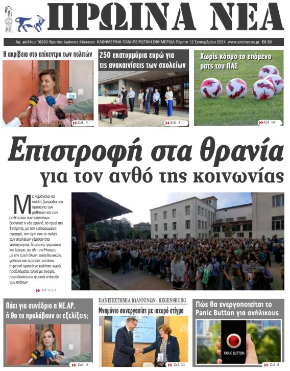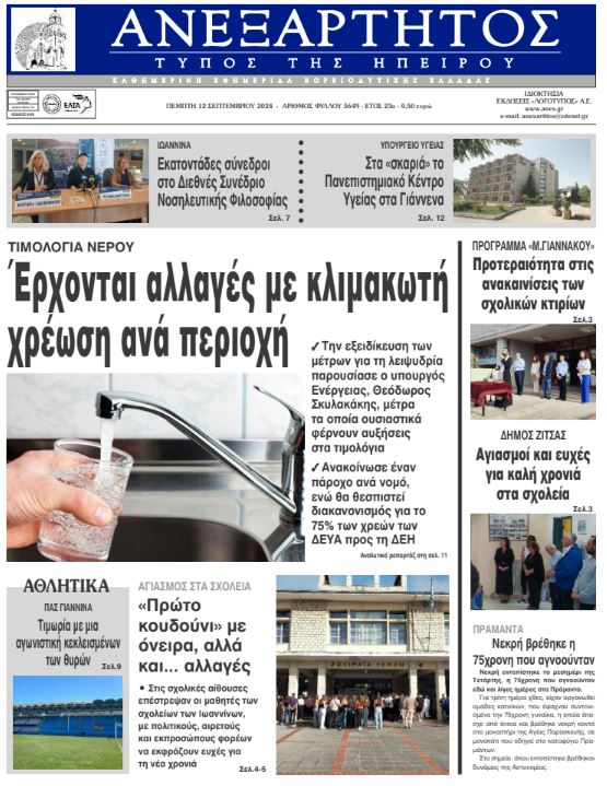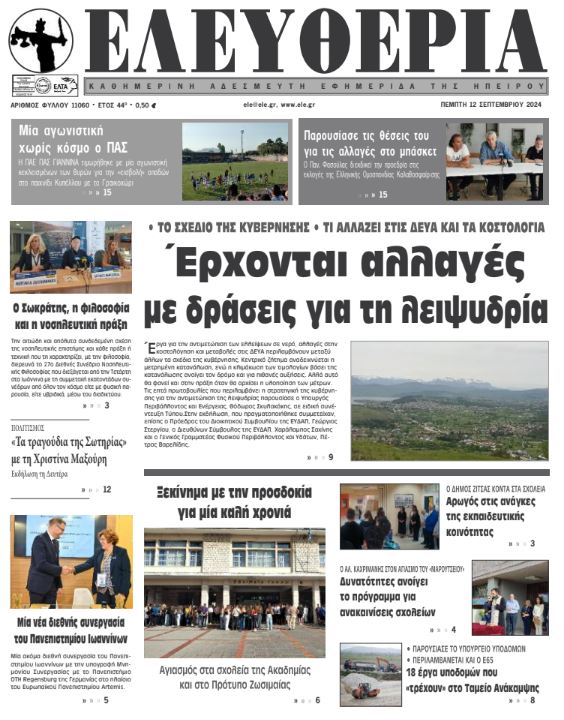 ΑρχικήΕΙΔΗΣΕΙΣΗΠΕΙΡΟΣ ΗΠΕΙΡΟΣ Τα πρωτοσέλιδα των γιαννιώτικων εφημερίδων 12.09.2024 0 FacebookTwitterWhatsAppEmailΤυπώνωViber Διαβάστε στα πρωτοσέλιδα των γιαννιώτικων εφημερίδων της Πέμπτης 12 Σεπτεμβρίου TagsΓΙΑΝΝΙΩΤΙΚΕΣ ΕΦΗΜΕΡΙΔΕΣΠΡΩΤΟΣΕΛΙΔΑ FacebookTwitterWhatsAppEmailΤυπώνωViber Προηγούμενο άρθροΝεκρή βρέθηκε η 75χρονη που αγνοούνταν στα ΠράμανταΕπόμενο άρθροΡεκόρ μόνιμων διορισμών νέων εκπαιδευτικών ΣΧΕΤΙΚΑ ΑΡΘΡΑ Τα πρωτοσέλιδα των γιαννιώτικων εφημερίδων TOP STORIES 28.10.2025 Τα πρωτοσέλιδα των γιαννιώτικων εφημερίδων ΗΠΕΙΡΟΣ 25.10.2025 Τα πρωτοσέλιδα των γιαννιώτικων εφημερίδων ΗΠΕΙΡΟΣ 24.10.2025 Τα πρωτοσέλιδα των γιαννιώτικων εφημερίδων ΗΠΕΙΡΟΣ 23.10.2025 Τα πρωτοσέλιδα των γιαννιώτικων εφημερίδων ΗΠΕΙΡΟΣ 22.10.2025 Τα πρωτοσέλιδα των γιαννιώτικων εφημερίδων ΗΠΕΙΡΟΣ 21.10.2025 ΣΤΗΝ ΙΔΙΑ ΚΑΤΗΓΟΡΙΑ Δήμος Κόνιτσας: Με λαμπρότητα ο εορτασμός της Εθνικής Επετείου της 28ης Οκτωβρίου ΗΠΕΙΡΟΣ 29.10.2025 Δυναμική αντίδραση για την αποτροπή «λουκέτου» στα ΕΛΤΑ Πραμάντων ΗΠΕΙΡΟΣ 29.10.2025 Με λαμπρότητα ο εορτασμός της Εθνικής Επετείου της 28ης Οκτωβρίου στον Δήμο Ζίτσας ΗΠΕΙΡΟΣ 29.10.2025 Τιμητική εκδήλωση για τον Παγκόσμιο Πρωταθλητή Στέφανο Ντούσκο ΗΠΕΙΡΟΣ 29.10.2025 Ο Δήμος Ζηρού για τη μεταφορά και ταφή αποβλήτων στη Γέφυρα Καλογήρου ΗΠΕΙΡΟΣ 29.10.2025 Μπέγκας: Η πράσινη μετάβαση είναι μαραθώνιος συνεργασίας ΗΠΕΙΡΟΣ 29.10.2025 ΜΗ ΧΑΣΕΤΕ «Ανοργάνωτο» βαρομετρικό χαμηλό έρχεται την Παρασκευή Απόβλητα από την Κέρκυρα ενταφιάζονταν στην Ήπειρο – Τρεις συλλήψεις, δώδεκα άτομα καταζητούνται Με λαμπρότητα η παρέλαση για την επέτειο του «ΟΧΙ» Τα πρωτοσέλιδα των γιαννιώτικων εφημερίδων Οι ήρωες πεσόντες που ακόμη περιμένουν… ΔΗΜΟΦΙΛΗ «Ανοργάνωτο» βαρομετρικό χαμηλό έρχεται την Παρασκευή Αναβίωσε το έθιμο της Γουρουνοχαράς στη Φούρκα Ειδικοί εκτιμούν ότι υπάρχουν περίπου 200 φυλές που δεν έχουν έρθει σε επαφή με τον υπόλοιπο κόσμο Βραζιλία: Αιματηρή αστυνομική επιχείρηση στις φαβέλες του Ρίο Σε 9 περιοχές οι ελάχιστες θερμοκρασίες έπεσαν κάτω από το μηδέν
