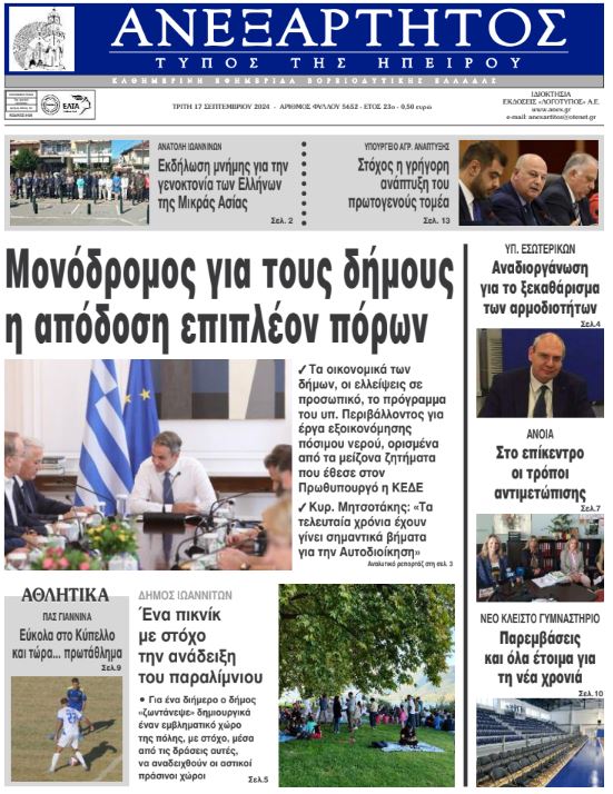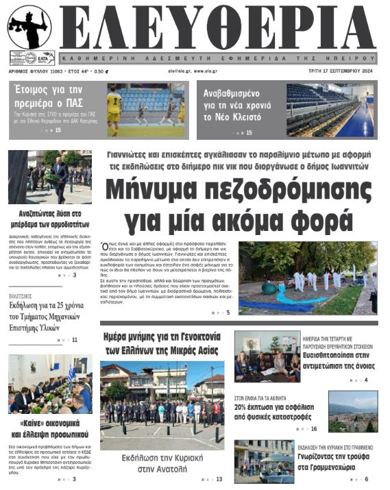 ΑρχικήΕΙΔΗΣΕΙΣΗΠΕΙΡΟΣ ΗΠΕΙΡΟΣ Τα πρωτοσέλιδα των γιαννιώτικων εφημερίδων 17.09.2024 0 FacebookTwitterWhatsAppEmailΤυπώνωViber Διαβάστε στα πρωτοσέλιδα των γιαννιώτικων εφημερίδων της Τρίτης 17 Σεπτεμβρίου TagsΓΙΑΝΝΙΩΤΙΚΕΣ ΕΦΗΜΕΡΙΔΕΣΠΡΩΤΟΣΕΛΙΔΑ FacebookTwitterWhatsAppEmailΤυπώνωViber Προηγούμενο άρθροΠρεμιέρα σήμερα για το Ψηφιακό ΦροντιστήριοΕπόμενο άρθροΈτοιμος για την πρεμιέρα ο ΠΑΣ ΣΧΕΤΙΚΑ ΑΡΘΡΑ Τα πρωτοσέλιδα των γιαννιώτικων εφημερίδων TOP STORIES 06.11.2025 Τα πρωτοσέλιδα των γιαννιώτικων εφημερίδων ΗΠΕΙΡΟΣ 05.11.2025 Τα πρωτοσέλιδα των γιαννιώτικων εφημερίδων ΗΠΕΙΡΟΣ 04.11.2025 Τα πρωτοσέλιδα των γιαννιώτικων εφημερίδων TOP STORIES 01.11.2025 Τα πρωτοσέλιδα των γιαννιώτικων εφημερίδων ΗΠΕΙΡΟΣ 31.10.2025 Τα πρωτοσέλιδα των γιαννιώτικων εφημερίδων ΗΠΕΙΡΟΣ 30.10.2025 ΣΤΗΝ ΙΔΙΑ ΚΑΤΗΓΟΡΙΑ Επιστροφή των εργαζομένων του «Γαλαξία» στις θέσεις τους ΗΠΕΙΡΟΣ 06.11.2025 Διαμαρτυρία των εργαζόμενων σε τουρισμό – επισιτισμό ΗΠΕΙΡΟΣ 06.11.2025 Καταγγελία της ΕΙΝΗ για τα «εντέλλεσθε» της 6ης ΥΠΕ ΗΠΕΙΡΟΣ 06.11.2025 Τα πρωτοσέλιδα των γιαννιώτικων εφημερίδων TOP STORIES 06.11.2025 «Άναψε πράσινο» για Σωφρονιστικό Κατάστημα στους Φιλιάτες ΗΠΕΙΡΟΣ 05.11.2025 206 πυρκαγιές με 61.000 καμένα στρέμματα στην Ήπειρο ΗΠΕΙΡΟΣ 05.11.2025 ΜΗ ΧΑΣΕΤΕ Τα πρωτοσέλιδα των γιαννιώτικων εφημερίδων «Άναψε πράσινο» για Σωφρονιστικό Κατάστημα στους Φιλιάτες 206 πυρκαγιές με 61.000 καμένα στρέμματα στην Ήπειρο Κινητοποιήσεις για τα ΕΛΤΑ σε Μέτσοβο – Καναλάκι Δήμος Ζίτσας: Απόφαση σταθμός της δημοτική αρχής για τη συνέχιση της λειτουργίας των ΕΛ.ΤΑ. ΔΗΜΟΦΙΛΗ Μαρινάκης: Ο Νοέμβριος, μήνας πληρωμών για τους αγρότες – – Μειώσεις φόρων για όλους με το νέο φορολογικό Περιορίζονται οι βροχές και ανεβαίνει η θερμοκρασία Συντάξεις Δεκεμβρίου: Πότε θα γίνει η πληρωμή τους – Αναλυτικά οι ημερομηνίες Εκδήλωση στην Ήπειρο για την Ευρωπαϊκή Ημέρα Γλωσσών «Λογιοσύνης Ακολουθία» στο Ίδρυμα Γκανή