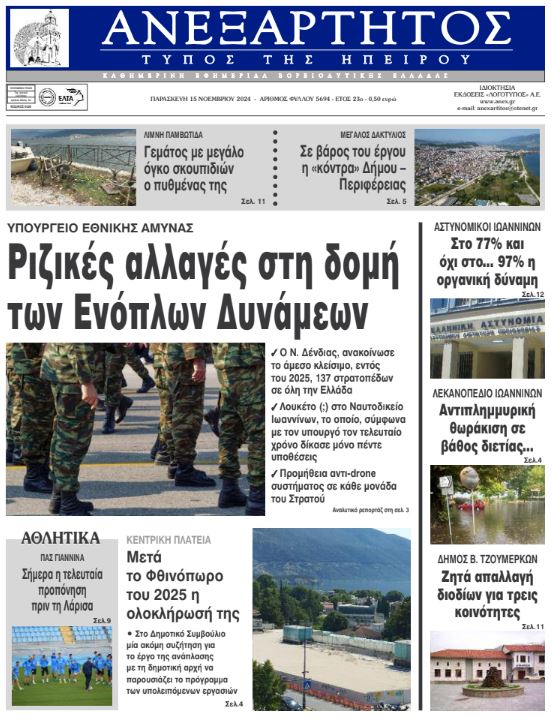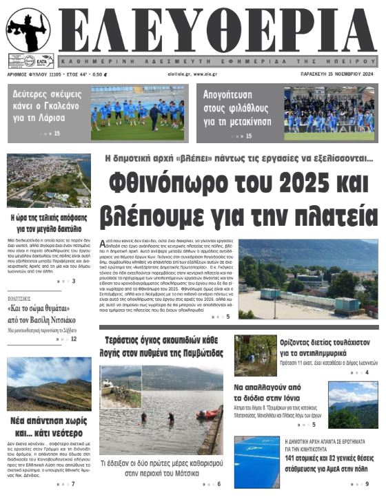 ΑρχικήΕΙΔΗΣΕΙΣΗΠΕΙΡΟΣ ΗΠΕΙΡΟΣ Τα πρωτοσέλιδα των γιαννιώτικων εφημερίδων 15.11.2024 0 FacebookTwitterWhatsAppEmailΤυπώνωViber Διαβάστε στα πρωτοσέλιδα των γιαννιώτικων εφημερίδων της Παρασκευής 25 Νοεμβρίου TagsΓΙΑΝΝΙΩΤΙΚΕΣ ΕΦΗΜΕΡΙΔΕΣΠΡΩΤΟΣΕΛΙΔΑ FacebookTwitterWhatsAppEmailΤυπώνωViber Προηγούμενο άρθροΗ ώρα της τελικής απόφασης για τον μεγάλο δακτύλιοΕπόμενο άρθροΔεύτερες σκέψεις κάνει ο Γκαλεάνο για τη Λάρισα ΣΧΕΤΙΚΑ ΑΡΘΡΑ Τα πρωτοσέλιδα των γιαννιώτικων εφημερίδων TOP STORIES 21.11.2025 Τα πρωτοσέλιδα των γιαννιώτικων εφημερίδων TOP STORIES 20.11.2025 Τα πρωτοσέλιδα των γιαννιώτικων εφημερίδων ΗΠΕΙΡΟΣ 19.11.2025 Τα πρωτοσέλιδα των γιαννιώτικων εφημερίδων ΗΠΕΙΡΟΣ 18.11.2025 Τα πρωτοσέλιδα των γιαννιώτικων εφημερίδων ΗΠΕΙΡΟΣ 15.11.2025 Τα πρωτοσέλιδα των γιαννιώτικων εφημερίδων ΗΠΕΙΡΟΣ 14.11.2025 ΣΤΗΝ ΙΔΙΑ ΚΑΤΗΓΟΡΙΑ Ημέρα Ενόπλων Δυνάμεων με αποκαλυπτήρια προτομών ΗΠΕΙΡΟΣ 21.11.2025 Έρευνες για φόλες στα Τζουμέρκα μετά τον θάνατο κυνηγετικών σκύλων ΗΠΕΙΡΟΣ 21.11.2025 Σε δημόσια πρόσκληση για την αξιοποίηση του Ξενία Ηγουμενίτσας προχωρά η ΕΤΑΔ ΗΠΕΙΡΟΣ 21.11.2025 Ήχησε το «112» στα Ιωάννινα ΗΠΕΙΡΟΣ 21.11.2025 Υπερχείλιση του Αράχθου στην Πλάκα – Φερτά υλικά κάλυψαν τη γέφυρα Μπέλεϋ ΗΠΕΙΡΟΣ 21.11.2025 Σε κατάσταση έκτακτης ανάγκης Ζηρός, Ζαγόρι και Φιλιάτες ΗΠΕΙΡΟΣ 21.11.2025 ΜΗ ΧΑΣΕΤΕ Ημέρα Ενόπλων Δυνάμεων με αποκαλυπτήρια προτομών Ήχησε το «112» στα Ιωάννινα Υπερχείλιση του Αράχθου στην Πλάκα – Φερτά υλικά κάλυψαν τη γέφυρα Μπέλεϋ Σε κατάσταση έκτακτης ανάγκης Ζηρός, Ζαγόρι και Φιλιάτες Βροχές ενάμιση μήνα μέσα σε 48 ώρες στην Ήπειρο ΔΗΜΟΦΙΛΗ Ημέρα Ενόπλων Δυνάμεων με αποκαλυπτήρια προτομών Μάχη με το χρόνο για τη νέα φιλοσοφία Παρουσιάζοντας τα μέτρα βιοασφάλειας για την ευλογιά των αιγοπροβάτων 21 Νοεμβρίου – Ημέρα των Ενόπλων Δυνάμεων Κατολισθήσεις στον Δήμο Βορ. Τζουμέρκων – Έκκληση για προσοχή