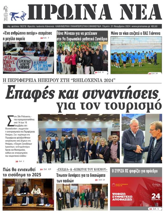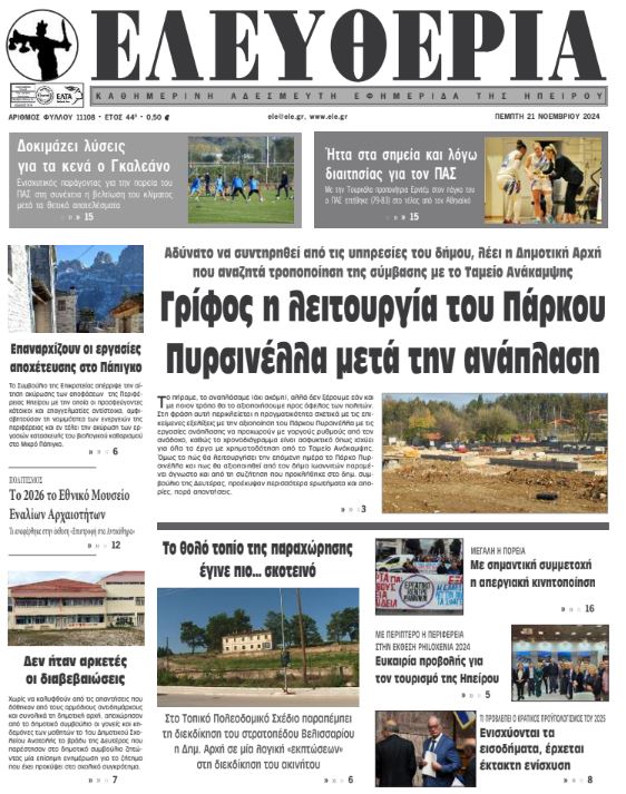 ΑρχικήΕΙΔΗΣΕΙΣΗΠΕΙΡΟΣ ΗΠΕΙΡΟΣ Τα πρωτοσέλιδα των γιαννιώτικων εφημερίδων 21.11.2024 0 FacebookTwitterWhatsAppEmailΤυπώνωViber Διαβάστε στα πρωτοσέλιδα των γιαννιώτικων εφημερίδων της Πέμπτης 21 Νοεμβρίου TagsΓΙΑΝΝΙΩΤΙΚΕΣ ΕΦΗΜΕΡΙΔΕΣΠΡΩΤΟΣΕΛΙΔΑ FacebookTwitterWhatsAppEmailΤυπώνωViber Προηγούμενο άρθροΑνεμοστρόβιλος «σαρώνει» καλλιέργειες στην Ηλεία (βίντεο)Επόμενο άρθροΜε μεγάλη συμμετοχή η απεργιακή κινητοποίηση ΣΧΕΤΙΚΑ ΑΡΘΡΑ Τα πρωτοσέλιδα των γιαννιώτικων εφημερίδων ΗΠΕΙΡΟΣ 13.12.2025 Τα πρωτοσέλιδα των γιαννιώτικων εφημερίδων ΗΠΕΙΡΟΣ 12.12.2025 Τα πρωτοσέλιδα των γιαννιώτικων εφημερίδων ΗΠΕΙΡΟΣ 11.12.2025 Τα πρωτοσέλιδα των γιαννιώτικων εφημερίδων ΗΠΕΙΡΟΣ 10.12.2025 Τα πρωτοσέλιδα των γιαννιώτικων εφημερίδων ΗΠΕΙΡΟΣ 09.12.2025 Τα πρωτοσέλιδα των γιαννιώτικων εφημερίδων ΗΠΕΙΡΟΣ 06.12.2025 ΣΤΗΝ ΙΔΙΑ ΚΑΤΗΓΟΡΙΑ Το 8ο Δημοτικό Σχολείο Άρτας αναβαθμίζεται σε Πειραματικό ΗΠΕΙΡΟΣ 15.12.2025 Ο Δήμος Ζίτσας καλωσόρισε τα Χριστούγεννα ΗΠΕΙΡΟΣ 15.12.2025 Σύλληψη αλλοδαπού φυγόποινου στην Πρέβεζα ΗΠΕΙΡΟΣ 15.12.2025 «Μαγικοί σελιδοδείκτες» στους μαθητές της Α’ Δημοτικού από τον δήμο Ιωαννιτών ΗΠΕΙΡΟΣ 15.12.2025 Το «Κοινό των Ηπειρωτών» στηρίζει αγρότες και κτηνοτρόφους ΗΠΕΙΡΟΣ 15.12.2025 Δωρεά ζωής από ασθενή της ΜΕΘ του ΠΓΝΙ ΗΠΕΙΡΟΣ 15.12.2025 ΜΗ ΧΑΣΕΤΕ Τέλη κυκλοφορίας: Λήγει η προθεσμία στις 31 Δεκεμβρίου – Οδηγός ΑΑΔΕ για πληρωμή και συχνές απορίες Ποιοι συμμετέχουν στην 24ωρη πανελλαδική απεργία της Τρίτης Εθνικό πένθος στην Αυστραλία μετά την τρομοκρατική επίθεση στο Μποντάι Πληρωμές από τον e-ΕΦΚΑ και τη ΔΥΠΑ έως τις 19 Δεκεμβρίου Σαρωτικοί έλεγχοι επιστροφών ΦΠΑ από την ΑΑΔΕ ΔΗΜΟΦΙΛΗ Δωρεά ζωής από ασθενή της ΜΕΘ του ΠΓΝΙ Πληρωμές από τον e-ΕΦΚΑ και τη ΔΥΠΑ έως τις 19 Δεκεμβρίου Το 8ο Δημοτικό Σχολείο Άρτας αναβαθμίζεται σε Πειραματικό Σαρωτικοί έλεγχοι επιστροφών ΦΠΑ από την ΑΑΔΕ Εξαρθρώθηκε διεθνές κύκλωμα διακίνησης κοκαΐνης με ελληνική εμπλοκή