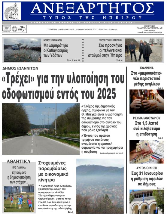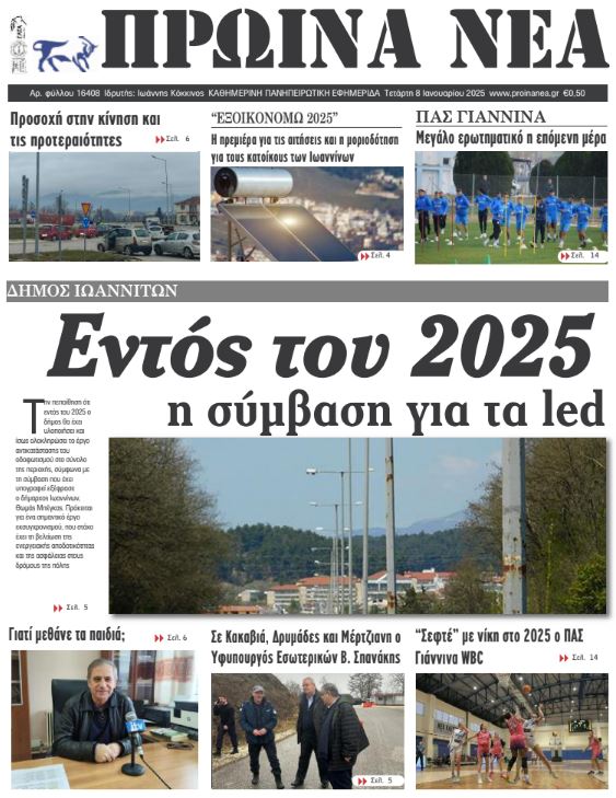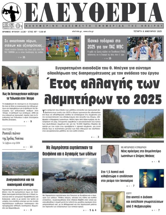 ΑρχικήΕΙΔΗΣΕΙΣΗΠΕΙΡΟΣ ΗΠΕΙΡΟΣ Τα πρωτοσέλιδα των γιαννιώτικων εφημερίδων 08.01.2025 0 FacebookTwitterWhatsAppEmailΤυπώνωViber Διαβάστε στα πρωτοσέλιδα των γιαννιώτικων εφημερίδων της Τετάρτης 8 Ιανουαρίου 2025 TagsΓΙΑΝΝΙΩΤΙΚΕΣ ΕΦΗΜΕΡΙΔΕΣΠΡΩΤΟΣΕΛΙΔΑ FacebookTwitterWhatsAppEmailΤυπώνωViber Προηγούμενο άρθροΈτος αλλαγής των λαμπτήρων το 2025Επόμενο άρθροΤα του Καίσαρος… ΣΧΕΤΙΚΑ ΑΡΘΡΑ Τα πρωτοσέλιδα των γιαννιώτικων εφημερίδων TOP STORIES 28.11.2025 Τα πρωτοσέλιδα των γιαννιώτικων εφημερίδων ΗΠΕΙΡΟΣ 27.11.2025 Τα πρωτοσέλιδα των γιαννιώτικων εφημερίδων ΗΠΕΙΡΟΣ 26.11.2025 Τα πρωτοσέλιδα των γιαννιώτικων εφημερίδων ΗΠΕΙΡΟΣ 25.11.2025 Τα πρωτοσέλιδα των γιαννιώτικων εφημερίδων ΗΠΕΙΡΟΣ 22.11.2025 Τα πρωτοσέλιδα των γιαννιώτικων εφημερίδων ΗΠΕΙΡΟΣ 21.11.2025 ΣΤΗΝ ΙΔΙΑ ΚΑΤΗΓΟΡΙΑ Διαγωνισμός για έργα ενεργειακής αναβάθμισης στο ΠΓΝΙ ΗΠΕΙΡΟΣ 28.11.2025 Εισροή νερού σε δύο χειρουργικές αίθουσες στο νοσοκομείο «Χατζηκώστα» ΗΠΕΙΡΟΣ 28.11.2025 Άρτα: Αλλοδαπός έκλεψε 850 ευρώ από ηλικιωμένο ΗΠΕΙΡΟΣ 28.11.2025 Κοινός τόπος η ανάγκη εξάλειψης της βίας κατά των γυναικών ΗΠΕΙΡΟΣ 28.11.2025 Νέες κατολισθήσεις στα Τζουμέρκα μετά την κακοκαιρία ΗΠΕΙΡΟΣ 28.11.2025 Εμφανίστηκε ξανά η εποχική λίμνη Βρέλλη ΗΠΕΙΡΟΣ 28.11.2025 ΜΗ ΧΑΣΕΤΕ Σήμερα η επιστροφή ενοικίου στους δικαιούχους Σήμερα η «Black Friday»: Τι πρέπει να προσέξετε στις αγορές σας Νέες κατολισθήσεις στα Τζουμέρκα μετά την κακοκαιρία Εμφανίστηκε ξανά η εποχική λίμνη Βρέλλη Επιδόματα και προσλήψεις στο συνέδριο δικαστικών υπαλλήλων ΔΗΜΟΦΙΛΗ Ένταση και καταγγελίες στο Επιμελητήριο Ιωαννίνων Καρέ – καρέ η επιχείρηση της Θηροφυλακής για τις «φόλες» στο Ξηροβούνι Χονγκ Κονγκ: Στους 128 ανέρχονται οι νεκροί – Οργή για τη φονικότερη πυρκαγιά των τελευταίων 70 ετών Τελικές δοκιμές πριν τον ΠΑΟΚ Β’ υπό την απειλή αφαίρεσης βαθμών Κοινός τόπος η ανάγκη εξάλειψης της βίας κατά των γυναικών