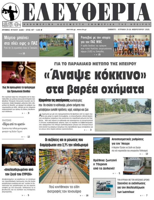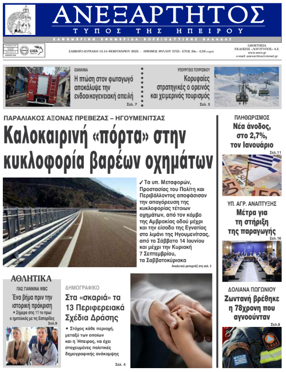 Διαβάστε στα πρωτοσέλιδα των γιαννιώτικων εφημερίδων 15-16 Φεβρουαρίου 2025