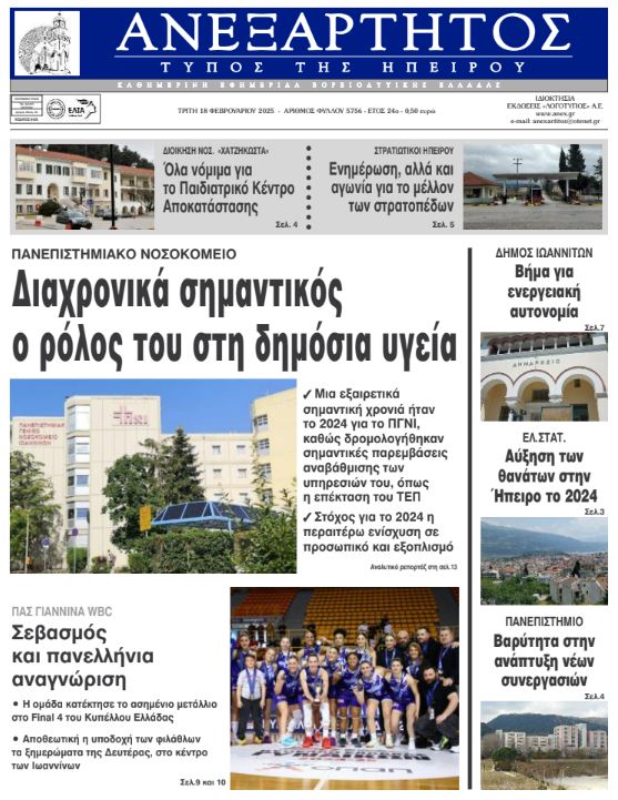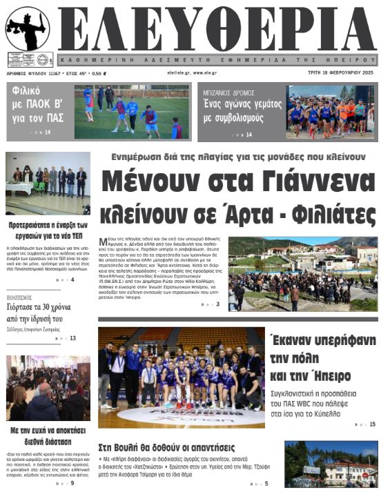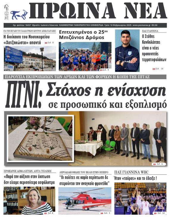 ΑρχικήΕΙΔΗΣΕΙΣΗΠΕΙΡΟΣ ΗΠΕΙΡΟΣ Τα πρωτοσέλιδα των γιαννιώτικων εφημερίδων 19.02.2025 0 FacebookTwitterWhatsAppEmailΤυπώνωViber Διαβάστε στα πρωτοσέλιδα των γιαννιώτικων εφημερίδων της Τρίτης 18 Φεβρουαρίου 2025 TagsΓΙΑΝΝΙΩΤΙΚΕΣ ΕΦΗΜΕΡΙΔΕΣΠΡΩΤΟΣΕΛΙΔΑ FacebookTwitterWhatsAppEmailΤυπώνωViber Προηγούμενο άρθροΗ οικογένεια των ΜΜΕ της Ηπείρου θρηνεί για την απώλεια του Μαρ. ΓεωργούλαΕπόμενο άρθροΠροτεραιότητα η έναρξη των εργασιών για το νέο ΤΕΠ ΣΧΕΤΙΚΑ ΑΡΘΡΑ Τα πρωτοσέλιδα των γιαννιώτικων εφημερίδων TOP STORIES 17.12.2025 Τα πρωτοσέλιδα των γιαννιώτικων εφημερίδων ΗΠΕΙΡΟΣ 16.12.2025 Τα πρωτοσέλιδα των γιαννιώτικων εφημερίδων ΗΠΕΙΡΟΣ 13.12.2025 Τα πρωτοσέλιδα των γιαννιώτικων εφημερίδων ΗΠΕΙΡΟΣ 12.12.2025 Τα πρωτοσέλιδα των γιαννιώτικων εφημερίδων ΗΠΕΙΡΟΣ 11.12.2025 Τα πρωτοσέλιδα των γιαννιώτικων εφημερίδων ΗΠΕΙΡΟΣ 10.12.2025 ΣΤΗΝ ΙΔΙΑ ΚΑΤΗΓΟΡΙΑ Έκκληση για αιμοπετάλια και αίμα από τον Σύλλογο Εκπαιδευτικών Ιωαννίνων ΗΠΕΙΡΟΣ 17.12.2025 Αιφνιδιαστικοί έλεγχοι του ΟΠΕΚΕΠΕ σε κτηνοτροφικές μονάδες στους Λιγκιάδες ΗΠΕΙΡΟΣ 17.12.2025 Θετική η απόφαση του Δ.Σ. Φιλιατών για νέο σωφρονιστικό κατάστημα ΗΠΕΙΡΟΣ 17.12.2025 Διαγραφές φοιτητών στο Πανεπιστήμιο Ιωαννίνων – Κάλεσμα για συγκέντρωση ΗΠΕΙΡΟΣ 17.12.2025 Τα δύο «πρόσωπα» του παραλίμνιου μετώπου ΗΠΕΙΡΟΣ 17.12.2025 Έκκληση για τήρηση της καθαριότητας τις ημέρες των εορτών ΗΠΕΙΡΟΣ 17.12.2025 ΜΗ ΧΑΣΕΤΕ Νέα μέτρα για το στεγαστικό – Επιδότηση ανακαινίσεων και κίνητρα για εργαζόμενους εκτός αστικών κέντρων Τα δύο «πρόσωπα» του παραλίμνιου μετώπου Ιστορικό υψηλό σε δωρεές οργάνων και μεταμοσχεύσεις ΠΓΝΙ: Απόφαση-σταθμός για τους εργαζόμενους ορισμένου χρόνου – Στο τραπέζι η μονιμοποίηση Ηχηρό μήνυμα για την απόδοση των πόρων στους δήμους ΔΗΜΟΦΙΛΗ Στο τραπέζι λύσεις και προοπτικές – κρίσιμα μέτωπα εντός κι εκτός γηπέδου 9χρονος στο νοσοκομείο μετά από επικίνδυνο challenge Τσίμαρης: Σοβαρός κίνδυνος αποκλεισμού των τοπικών ΚΤΕΛ και αποδιάρθρωσης της αστικής συγκοινωνίας Στο Προεδρικό Μέγαρο ο Γραμματέας της Αποκεντρωμένης Διοίκησης Ηπείρου – Δυτικής Μακεδονίας Συνελήφθη στη Θεσσαλονίκη Έλληνας καταζητούμενος στη Γερμανία για φοροδιαφυγή ύψους 29,6 εκατ. ευρώ