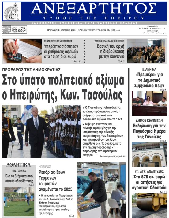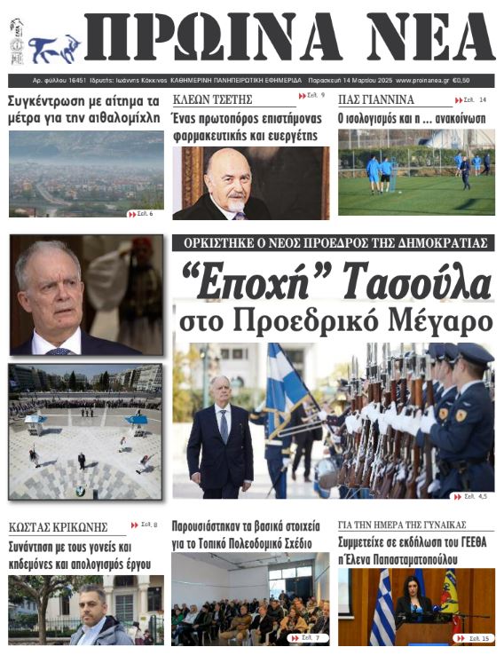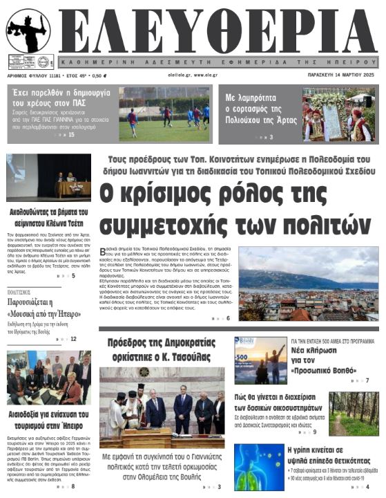 ΑρχικήΕΙΔΗΣΕΙΣΗΠΕΙΡΟΣ ΗΠΕΙΡΟΣ Τα πρωτοσέλιδα των γιαννιώτικων εφημερίδων 14.03.2025 0 FacebookTwitterWhatsAppEmailΤυπώνωViber Διαβάστε στα πρωτοσέλδια των γιαννιώτικων εφημερίδων της Παρασκευής 14 Μαρτίου 2025 TagsΓΙΑΝΝΙΩΤΙΚΕΣ ΕΦΗΜΕΡΙΔΕΣΠΡΩΤΟΣΕΛΙΔΑ FacebookTwitterWhatsAppEmailΤυπώνωViber Προηγούμενο άρθροBoυλή: Κατατέθηκε το «mystreet», η εφαρμογή καταγγελιών για την αυθαίρετη χρήση κοινόχρηστων χώρωνΕπόμενο άρθροΣυνέδριο του Συλλόγου Palso για τις ξένες γλώσσες και τη συμπερίληψη ΣΧΕΤΙΚΑ ΑΡΘΡΑ Τα πρωτοσέλιδα των γιαννιώτικων εφημερίδων TOP STORIES 06.11.2025 Τα πρωτοσέλιδα των γιαννιώτικων εφημερίδων ΗΠΕΙΡΟΣ 05.11.2025 Τα πρωτοσέλιδα των γιαννιώτικων εφημερίδων ΗΠΕΙΡΟΣ 04.11.2025 Τα πρωτοσέλιδα των γιαννιώτικων εφημερίδων TOP STORIES 01.11.2025 Τα πρωτοσέλιδα των γιαννιώτικων εφημερίδων ΗΠΕΙΡΟΣ 31.10.2025 Τα πρωτοσέλιδα των γιαννιώτικων εφημερίδων ΗΠΕΙΡΟΣ 30.10.2025 ΣΤΗΝ ΙΔΙΑ ΚΑΤΗΓΟΡΙΑ Επιστροφή των εργαζομένων του «Γαλαξία» στις θέσεις τους ΗΠΕΙΡΟΣ 06.11.2025 Διαμαρτυρία των εργαζόμενων σε τουρισμό – επισιτισμό ΗΠΕΙΡΟΣ 06.11.2025 Καταγγελία της ΕΙΝΗ για τα «εντέλλεσθε» της 6ης ΥΠΕ ΗΠΕΙΡΟΣ 06.11.2025 Τα πρωτοσέλιδα των γιαννιώτικων εφημερίδων TOP STORIES 06.11.2025 «Άναψε πράσινο» για Σωφρονιστικό Κατάστημα στους Φιλιάτες ΗΠΕΙΡΟΣ 05.11.2025 206 πυρκαγιές με 61.000 καμένα στρέμματα στην Ήπειρο ΗΠΕΙΡΟΣ 05.11.2025 ΜΗ ΧΑΣΕΤΕ Υπεγράφη συμφωνία Energean, ExxonMobil και Helleniq Energy για γεώτρηση υδρογονανθράκων στο Ιόνιο Τα πρωτοσέλιδα των γιαννιώτικων εφημερίδων «Άναψε πράσινο» για Σωφρονιστικό Κατάστημα στους Φιλιάτες 206 πυρκαγιές με 61.000 καμένα στρέμματα στην Ήπειρο Κινητοποιήσεις για τα ΕΛΤΑ σε Μέτσοβο – Καναλάκι ΔΗΜΟΦΙΛΗ Τα του Καίσαρος… Τζούφη: Ο Γράμμος είναι περιοχή Natura που απαιτεί διαφάνεια και σεβασμό Παρίστανε την αστυνομικό και απέσπασε 100.000 ευρώ από 57χρονη Βορίζια: Συνελήφθη ο 43χρονος που πυροβολούσε με καλάσνικοφ Συντάξεις Δεκεμβρίου: Πότε θα γίνει η πληρωμή τους – Αναλυτικά οι ημερομηνίες