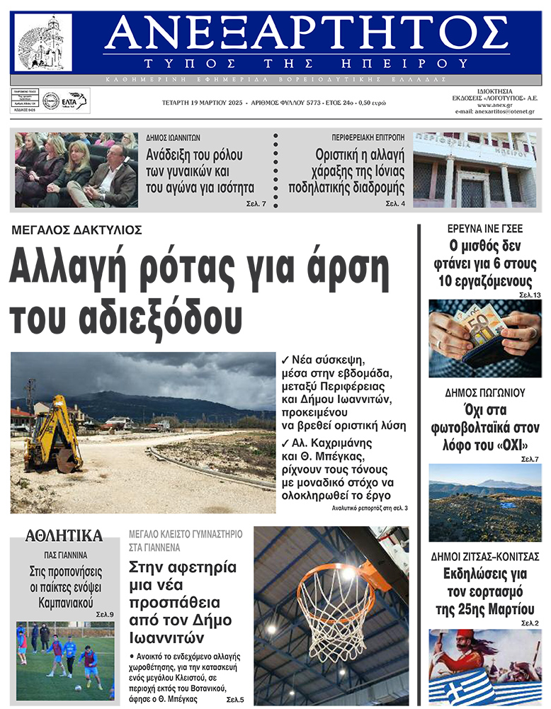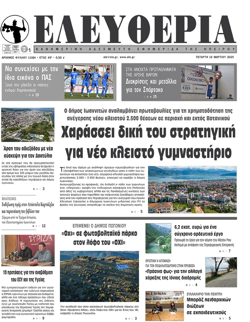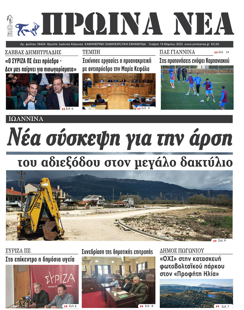 Διαβάστε στα πρωτοσέλδια των γιαννιώτικων εφημερίδων της Τετάρτης 19 Μαρτίου 2025