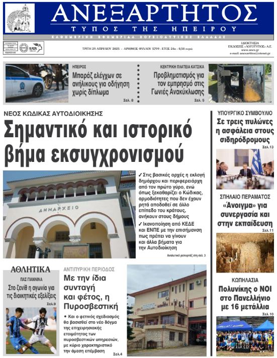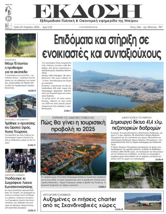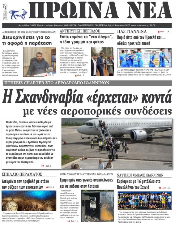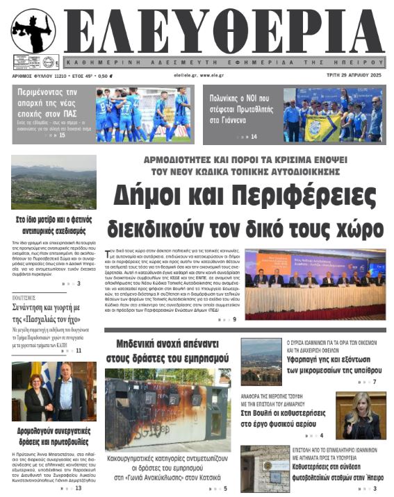 ΑρχικήΕΙΔΗΣΕΙΣΗΠΕΙΡΟΣ ΗΠΕΙΡΟΣ Τα πρωτοσέλιδα των γιαννιώτικων εφημερίδων 29.04.2025 0 FacebookTwitterWhatsAppEmailΤυπώνωViber Διαβάστε στα πρωτοσέλιδα των γιαννιώτικων εφημερίδων 29 Απριλίου 2025 TagsΓΙΑΝΝΙΩΤΙΚΕΣ ΕΦΗΜΕΡΙΔΕΣΠΡΩΤΟΣΕΛΙΔΑ FacebookTwitterWhatsAppEmailΤυπώνωViber Προηγούμενο άρθροΓιορτή της Μητέρας -Πότε γιορτάζεται και πότε καθιερώθηκεΕπόμενο άρθροΑμετάβλητος ο φετινός αντιπυρικός σχεδιασμός ΣΧΕΤΙΚΑ ΑΡΘΡΑ Τα πρωτοσέλιδα των γιαννιώτικων εφημερίδων ΗΠΕΙΡΟΣ 22.11.2025 Τα πρωτοσέλιδα των γιαννιώτικων εφημερίδων ΗΠΕΙΡΟΣ 21.11.2025 Τα πρωτοσέλιδα των γιαννιώτικων εφημερίδων TOP STORIES 20.11.2025 Τα πρωτοσέλιδα των γιαννιώτικων εφημερίδων ΗΠΕΙΡΟΣ 19.11.2025 Τα πρωτοσέλιδα των γιαννιώτικων εφημερίδων ΗΠΕΙΡΟΣ 18.11.2025 Τα πρωτοσέλιδα των γιαννιώτικων εφημερίδων ΗΠΕΙΡΟΣ 15.11.2025 ΣΤΗΝ ΙΔΙΑ ΚΑΤΗΓΟΡΙΑ Άμεση στήριξη υποσχέθηκε ο Χρ. Δήμας για τα Τζουμέρκα ΗΠΕΙΡΟΣ 24.11.2025 Ήδη σε κατάσταση έκτακτης ανάγκης ο Δήμος Βορείων Τζουμέρκων ΗΠΕΙΡΟΣ 24.11.2025 Κυκλοφοριακές ρυθμίσεις λόγω εργασιών αποκατάστασης στον Δήμο Ζηρού ΗΠΕΙΡΟΣ 24.11.2025 Σύλληψη φυγόποινου για φοροδιαφυγή ΗΠΕΙΡΟΣ 24.11.2025 Συνελήφθη αλλοδαπός με ένταλμα στη Θεσπρωτία ΗΠΕΙΡΟΣ 24.11.2025 Με νέα γραμματεία και νέο κανονισμό λειτουργίας η «Ενότητα Πολιτών Νέα Γιάννενα» ΗΠΕΙΡΟΣ 24.11.2025 ΜΗ ΧΑΣΕΤΕ Άμεση στήριξη υποσχέθηκε ο Χρ. Δήμας για τα Τζουμέρκα Έκτακτο δελτίο καιρού: Ισχυρή κακοκαιρία από την Τρίτη με βροχές και καταιγίδες Πρόοδος στις διαπραγματεύσεις για το αμερικανικό σχέδιο ειρήνης Αντίστροφη μέτρηση για το εορταστικό ωράριο Χριστουγέννων Επίδομα 250 ευρώ: Ποιοι πληρώνονται – Αναλυτικά τα κριτήρια ΔΗΜΟΦΙΛΗ Σεισμός 4,2 Ρίχτερ στην Καρδίτσα Νέα Αριστερά: Αδιαφορία της κυβέρνησης για την αντιπλημμυρική προστασία της Ηπείρου Αντίστροφη μέτρηση για το εορταστικό ωράριο Χριστουγέννων Ο Γρηγόρης Δημητριάδης ψήφισε στις εσωκομματικές εκλογές της ΝΔ μαζί με τον γιο του – Η ζεστή ανάρτηση Ισχυρό στίγμα ανανέωσης στις εσωκομματικές της ΝΔ