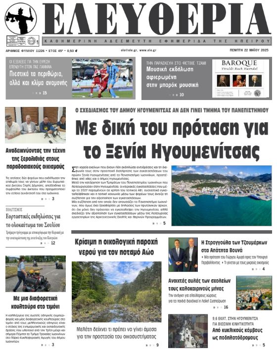 ΑρχικήΕΙΔΗΣΕΙΣΗΠΕΙΡΟΣ ΗΠΕΙΡΟΣ Τα πρωτοσέλιδα των γιαννιώτικων εφημερίδων 22.05.2025 0 FacebookTwitterWhatsAppEmailΤυπώνωViber Διαβάστε στα πρωτοσέλιδα των γιαννιώτικων εφημερίδων Πέμπτη 22 Μαΐου 2025 TagsΓΙΑΝΝΙΩΤΙΚΕΣ ΕΦΗΜΕΡΙΔΕΣΠΡΩΤΟΣΕΛΙΔΑ FacebookTwitterWhatsAppEmailΤυπώνωViber Προηγούμενο άρθροΙσχυρός σεισμός 6,1 Ρίχτερ ανοιχτά της ΚρήτηςΕπόμενο άρθροΦΠΑ: Ταχύτερες οι επιστροφές – Άμεσα τα πρόστιμα στους εκπρόθεσμους ΣΧΕΤΙΚΑ ΑΡΘΡΑ Τα πρωτοσέλιδα των γιαννιώτικων εφημερίδων TOP STORIES 19.11.2025 Τα πρωτοσέλιδα των γιαννιώτικων εφημερίδων ΗΠΕΙΡΟΣ 18.11.2025 Τα πρωτοσέλιδα των γιαννιώτικων εφημερίδων ΗΠΕΙΡΟΣ 15.11.2025 Τα πρωτοσέλιδα των γιαννιώτικων εφημερίδων ΗΠΕΙΡΟΣ 14.11.2025 Τα πρωτοσέλιδα των γιαννιώτικων εφημερίδων ΗΠΕΙΡΟΣ 13.11.2025 Τα πρωτοσέλιδα των γιαννιώτικων εφημερίδων ΗΠΕΙΡΟΣ 12.11.2025 ΣΤΗΝ ΙΔΙΑ ΚΑΤΗΓΟΡΙΑ Αντλήσεις υδάτων και κλειστοί δρόμοι στη Θεσπρωτία ΗΠΕΙΡΟΣ 19.11.2025 Ζημιές σε ηλεκτρικές συσκευές από τον κεραυνό που έπεσε σε στέγη ΗΠΕΙΡΟΣ 19.11.2025 Επίσκεψη μελών του κινήματος ΝΙΚΗΣ στη Διεύθυνση Δευτεροβάθμιας Εκπαίδευσης ΗΠΕΙΡΟΣ 19.11.2025 Ισχυρή κακοκαιρία στην Ήπειρο – Ζημιές, κατολισθήσεις και ρεκόρ βροχόπτωσης ΗΠΕΙΡΟΣ 19.11.2025 Στην Ήπειρο τα μεγαλύτερα ύψη βροχής TOP STORIES 19.11.2025 ΑΔΕΔΥ Ιωαννίνων: Τα αποτελέσματα των εκλογών για τη νέα Εκτελεστική Γραμματεία ΗΠΕΙΡΟΣ 19.11.2025 ΜΗ ΧΑΣΕΤΕ Αντλήσεις υδάτων και κλειστοί δρόμοι στη Θεσπρωτία Ζημιές σε ηλεκτρικές συσκευές από τον κεραυνό που έπεσε σε στέγη Στην Ήπειρο τα μεγαλύτερα ύψη βροχής Νέες ρυθμίσεις για υπερχρεωμένους οφειλέτες, voucher για πρόληψη της οικονομικής κατάρρευσης Στο επίκεντρο ο ρόλος των νοσηλευτών ΔΗΜΟΦΙΛΗ Τα πρωτοσέλιδα των γιαννιώτικων εφημερίδων Κάλεσμα Σιόντη για στήριξη στον ΠΑΣ εν όψει Μακεδονικού Τα υπερεπεξεργασμένα τρόφιμα αποτελούν αυξανόμενη απειλή για τη δημόσια υγεία Το πρώτο φιλί δόθηκε πριν 20 εκατ. χρόνια, εκτιμούν οι επιστήμονες Eurobank | 23 χρόνια «Μπροστά για την Παιδεία»
