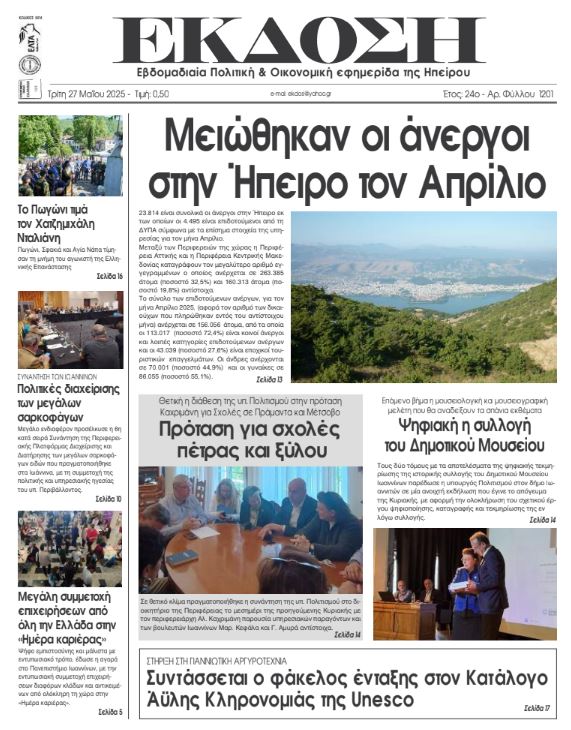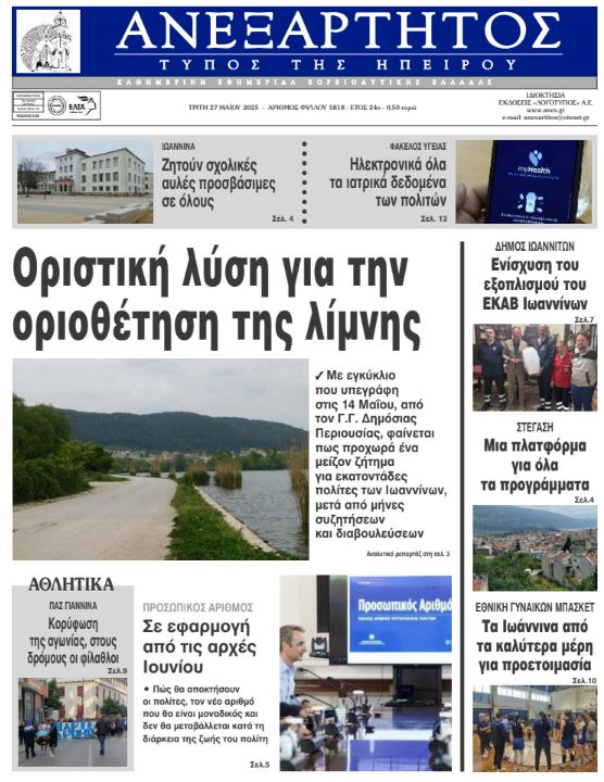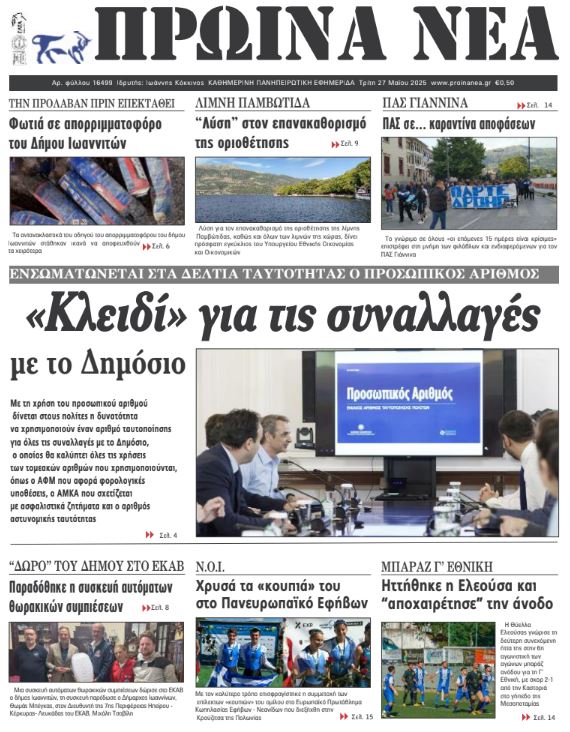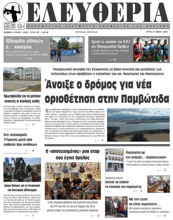 ΑρχικήΕΙΔΗΣΕΙΣΗΠΕΙΡΟΣ ΗΠΕΙΡΟΣ Τα πρωτοσέλιδα των γιαννιώτικων εφημερίδων 27.05.2025 0 FacebookTwitterWhatsAppEmailΤυπώνωViber Διαβάστε στα πρωτοσέλιδα των γιαννιώτικων εφημερίδων Τρίτη 27 Μαΐου 2025 TagsΓΙΑΝΝΙΩΤΙΚΕΣ ΕΦΗΜΕΡΙΔΕΣΠΡΩΤΟΣΕΛΙΔΑ FacebookTwitterWhatsAppEmailΤυπώνωViber Προηγούμενο άρθροΗ απάντηση Μακρόν για το χαστούκι από την ΜπριζίτΕπόμενο άρθροΑίτημα διαφάνειας για το πόρισμα ΣΧΕΤΙΚΑ ΑΡΘΡΑ Τα πρωτοσέλιδα των γιαννιώτικων εφημερίδων TOP STORIES 05.12.2025 Τα πρωτοσέλιδα των γιαννιώτικων εφημερίδων ΗΠΕΙΡΟΣ 04.12.2025 Τα πρωτοσέλιδα των γιαννιώτικων εφημερίδων ΗΠΕΙΡΟΣ 03.12.2025 Τα πρωτοσέλιδα των γιαννιώτικων εφημερίδων TOP STORIES 02.12.2025 Τα πρωτοσέλιδα των γιαννιώτικων εφημερίδων ΗΠΕΙΡΟΣ 29.11.2025 Τα πρωτοσέλιδα των γιαννιώτικων εφημερίδων ΗΠΕΙΡΟΣ 28.11.2025 ΣΤΗΝ ΙΔΙΑ ΚΑΤΗΓΟΡΙΑ Αγρότες και κτηνοτρόφοι αποκλείουν το αεροδρόμιο Ιωαννίνων (βίντεο) ΗΠΕΙΡΟΣ 07.12.2025 ΑΡΤΑ -Διακοπές κυκλοφορίας λόγω των LED ΗΠΕΙΡΟΣ 07.12.2025 Φιάσκο για την ΕΛ.ΑΣ η διαφυγή των ληστών στην Αλβανία ΗΠΕΙΡΟΣ 05.12.2025 Χρηματοδότηση 93.000€ στα ΤΟΕΒ Αράχθου και Λούρου ΗΠΕΙΡΟΣ 05.12.2025 Ηγουμενίτσα: Δύο συλλήψεις για προώθηση παράτυπων μεταναστών ΗΠΕΙΡΟΣ 05.12.2025 Κοινό μέτωπο για την προστασία του ΧΥΤΥ Βλαχέρνας και της λίμνης Πουρναρίου ΗΠΕΙΡΟΣ 05.12.2025 ΜΗ ΧΑΣΕΤΕ Αγρότες και κτηνοτρόφοι αποκλείουν το αεροδρόμιο Ιωαννίνων (βίντεο) «Ασπίδα κατά της παραπληροφόρησης ο τοπικός Τύπος» Φιάσκο για την ΕΛ.ΑΣ η διαφυγή των ληστών στην Αλβανία Τι ισχύει για το Δώρο Χριστουγέννων στους μισθωτούς του ιδιωτικού τομέα Έντονες αντιδράσεις για τη μεταφορά ζωικών αποβλήτων ΔΗΜΟΦΙΛΗ Μ. ΤΖΟΥΦΗ -“Αναγκαίο ένα σύγχρονο και δημοκρατικό πλαίσιο βιοηθικής για την τεχνητή νοημοσύνη “ Περού: Δέκα φοιτητές νεκροί από φωτιά σε εστιατόριο ΕΞΩΔΙΚΑΣΤΙΚΟΣ ΜΗΧΑΝΙΣΜΟΣ -Νέο ιστορικό ρεκόρ στις ρυθμίσεις οφειλών του Νοεμβρίου ΑΡΤΑ -Διακοπές κυκλοφορίας λόγω των LED Αγρότες και κτηνοτρόφοι αποκλείουν το αεροδρόμιο Ιωαννίνων (βίντεο)