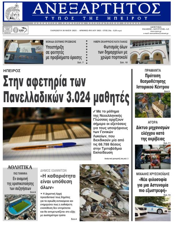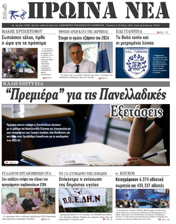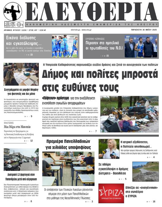 ΑρχικήΕΙΔΗΣΕΙΣΗΠΕΙΡΟΣ ΗΠΕΙΡΟΣ Τα πρωτοσέλιδα των γιαννιώτικων εφημερίδων 30.05.2025 0 FacebookTwitterWhatsAppEmailΤυπώνωViber Διαβάστε στα πρωτοσέλιδα των γιαννιώτικων εφημερίδων Παρασκευή 30 Μαΐου 2025 TagsΓΙΑΝΝΙΩΤΙΚΕΣ ΕΦΗΜΕΡΙΔΕΣΠΡΩΤΟΣΕΛΙΔΑ FacebookTwitterWhatsAppEmailΤυπώνωViber Προηγούμενο άρθροΕξαρθρώθηκε εγκληματική οργάνωση που διέπραττε διαρρήξεις οικιών σε Αττική, Ήπειρο και Δυτική ΕλλάδαΕπόμενο άρθροΤα του Καίσαρος… ΣΧΕΤΙΚΑ ΑΡΘΡΑ Τα πρωτοσέλιδα των γιαννιώτικων εφημερίδων TOP STORIES 27.11.2025 Τα πρωτοσέλιδα των γιαννιώτικων εφημερίδων ΗΠΕΙΡΟΣ 26.11.2025 Τα πρωτοσέλιδα των γιαννιώτικων εφημερίδων ΗΠΕΙΡΟΣ 25.11.2025 Τα πρωτοσέλιδα των γιαννιώτικων εφημερίδων ΗΠΕΙΡΟΣ 22.11.2025 Τα πρωτοσέλιδα των γιαννιώτικων εφημερίδων ΗΠΕΙΡΟΣ 21.11.2025 Τα πρωτοσέλιδα των γιαννιώτικων εφημερίδων TOP STORIES 20.11.2025 ΣΤΗΝ ΙΔΙΑ ΚΑΤΗΓΟΡΙΑ Στο Μέτσοβο η Ολυμπιακή Φλόγα την Παρασκευή ΗΠΕΙΡΟΣ 27.11.2025 Σύλληψη για ηχορύπανση από κατάστημα διασκέδασης ΗΠΕΙΡΟΣ 27.11.2025 Δικογραφία για απάτη 3.000 ευρώ στην Άρτα ΗΠΕΙΡΟΣ 27.11.2025 Αιτήσεις για αποζημίωση πλημμυροπαθών στον Δήμο Ζηρού – Τα δικαιολογητικά ΗΠΕΙΡΟΣ 27.11.2025 Κατολίσθηση στην Άγναντα – Ανήσυχοι οι κάτοικοι ΗΠΕΙΡΟΣ 27.11.2025 Σε ετοιμότητα Περιφέρεια και δήμοι για το νέο κύμα κακοκαιρίας ΗΠΕΙΡΟΣ 27.11.2025 ΜΗ ΧΑΣΕΤΕ Μητσοτάκης: Από Παρασκευή η επιστροφή ενοικίου για 1 εκατ. πολίτες Πότε θα καταβληθούν οι συντάξεις Ιανουαρίου Κατολίσθηση στην Άγναντα – Ανήσυχοι οι κάτοικοι Σε ετοιμότητα Περιφέρεια και δήμοι για το νέο κύμα κακοκαιρίας Κατηγορίες κατά του Δήμου για αδιαφορία μετά την πτώση δέντρου ΔΗΜΟΦΙΛΗ Γεγονός η πρώτη επιτυχημένη αλλαγή χρώματος ματιών στην Ελλάδα Στο Κτηματολόγιο οι πολεοδομίες: Ψηφιακά θα διεκπεραιώνονται οι υποθέσεις Ξεκινούν οι αιτήσεις συμμετοχής στις Πανελλαδικές Μεγάλη φωτιά στο Χονγκ Κονγκ – Στους 55 οι νεκροί Πιερρακάκης: Πώς η ανάκαμψη της Ελλάδας μπορεί να αποτελέσει έμπνευση για την Ευρώπη