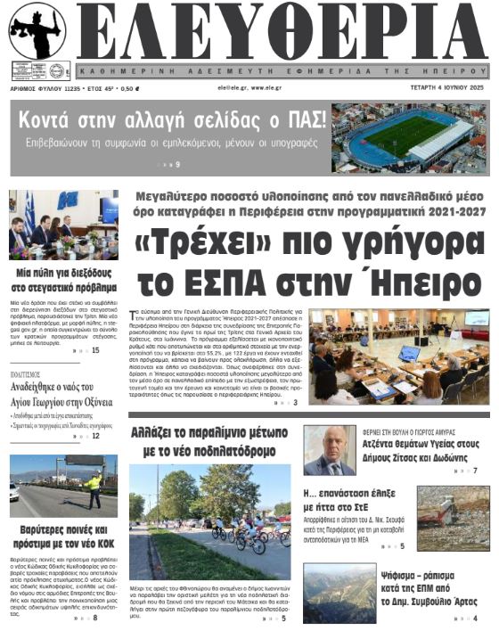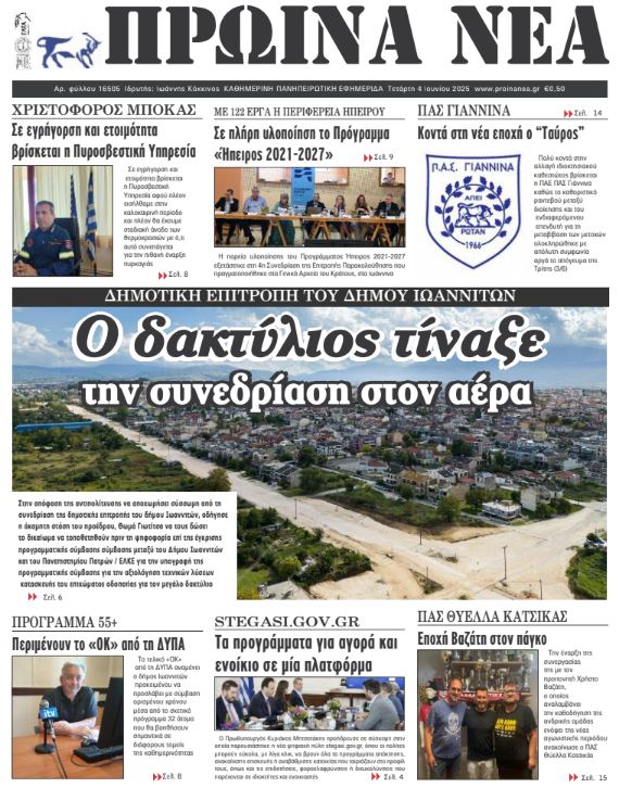 ΑρχικήΕΙΔΗΣΕΙΣΗΠΕΙΡΟΣ ΗΠΕΙΡΟΣ Τα πρωτοσέλιδα των γιαννιώτικων εφημερίδων 04.06.2025 0 FacebookTwitterWhatsAppEmailΤυπώνωViber Διαβάστε στα πρωτοσέλιδα των γιαννιώτικων εφημερίδων Τετάρτη 4 Ιουνίου 2025 FacebookTwitterWhatsAppEmailΤυπώνωViber Προηγούμενο άρθροΣπείρα εξαπάτησε τηλεφωνικά 30.000 πολίτες ανά την ΕυρώπηΕπόμενο άρθροΤα του Καίσαρος… ΣΤΗΝ ΙΔΙΑ ΚΑΤΗΓΟΡΙΑ Ανακοινώθηκε η ολοκλήρωση της εξαγοράς της Γαλακτοβιομηχανίας «ΔΩΔΩΝΗ» ΗΠΕΙΡΟΣ 20.11.2025 Ένταση στο Δημοτικό Συμβούλιο για τη μετατόπιση περιπτέρου στην κεντρική πλατεία ΗΠΕΙΡΟΣ 20.11.2025 Περιμένοντας λύση από την ελεγχόμενη στάθμευση ΗΠΕΙΡΟΣ 20.11.2025 Επικαλούνται τη συναίνεση, αλλά ενισχύουν τη σύγχυση ΗΠΕΙΡΟΣ 20.11.2025 Ζημιές από την κακοκαιρία στο Βαγκαλιάτι με πτώσεις δέντρων και κολώνας ΗΠΕΙΡΟΣ 20.11.2025 ΤΕΕ Ηπείρου: Αίτια, επιπτώσεις και στρατηγικές αντιμετώπισης της αιθαλομίχλης TOP STORIES 20.11.2025 ΜΗ ΧΑΣΕΤΕ Περιμένοντας λύση από την ελεγχόμενη στάθμευση Επικαλούνται τη συναίνεση, αλλά ενισχύουν τη σύγχυση ΤΕΕ Ηπείρου: Αίτια, επιπτώσεις και στρατηγικές αντιμετώπισης της αιθαλομίχλης Έντονες βροχοπτώσεις στην Ήπειρο – Δεκάδες περιστατικά για την Πυροσβεστική Έκτακτο δελτίο επιδείνωσης από την ΕΜΥ – Εντείνονται οι καταιγίδες από τη νύχτα ΔΗΜΟΦΙΛΗ Ενιαίο μέτωπο για νέο κλειστό κολυμβητήριο και γυμναστήριο Ανακάλεσε η ΚΕΔΕ την απόφαση για την κατανομή των 105 εκατ. ευρώ Ένταση στο Δημοτικό Συμβούλιο για τη μετατόπιση περιπτέρου στην κεντρική πλατεία Τσεχία: Δεκάδες τραυματίες από σύγκρουση τρένων Πλημμύρισε (ξανά) η οδός Καλομοίρη στο Κ. Νεοχωρόπουλο