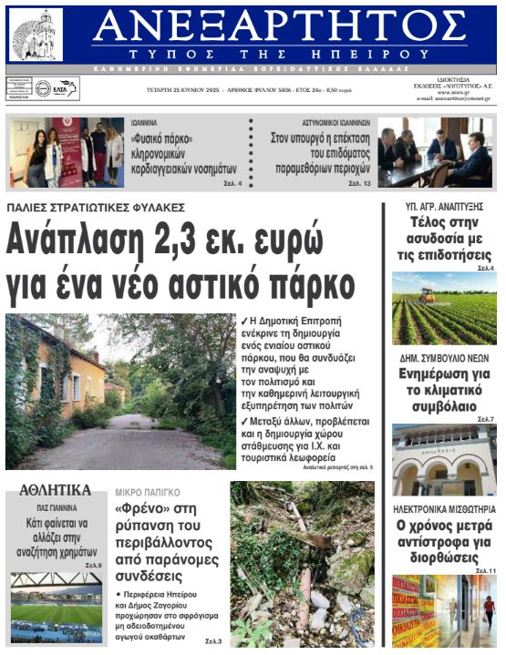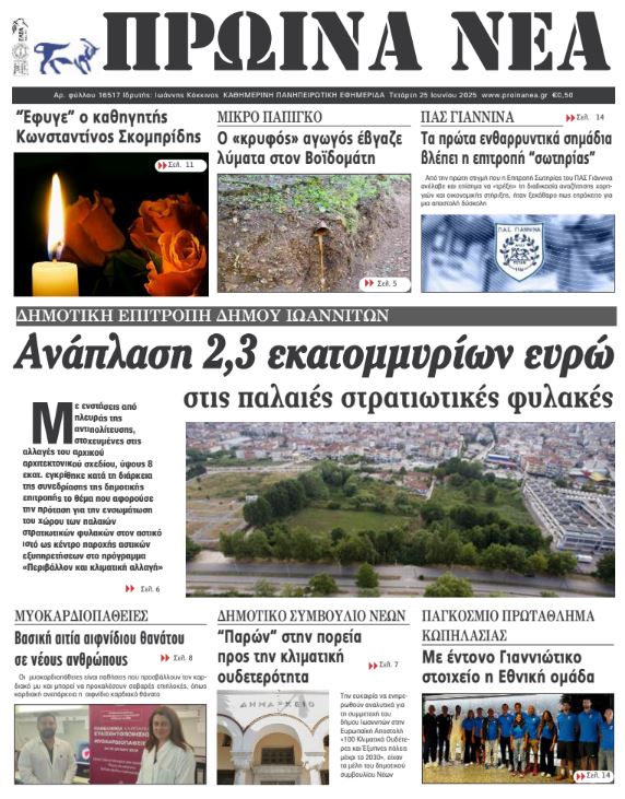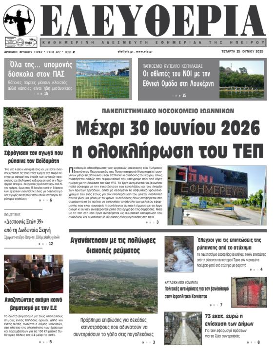 ΑρχικήΕΙΔΗΣΕΙΣΗΠΕΙΡΟΣ ΗΠΕΙΡΟΣ Τα πρωτοσέλιδα των γιαννιώτικων εφημερίδων 25.06.2025 0 FacebookTwitterWhatsAppEmailΤυπώνωViber Διαβάστε στα πρωτοσέλιδα των γιαννιώτικων εφημερίδων 25 Ιουνίου 2025 TagsΓΙΑΝΝΙΩΤΙΚΕΣ ΕΦΗΜΕΡΙΔΕΣΠΡΩΤΟΣΕΛΙΔΑ FacebookTwitterWhatsAppEmailΤυπώνωViber Προηγούμενο άρθροΕξαρθρώθηκαν δύο εγκληματικές οργανώσεις που δραστηριοποιούνταν στην αρχαιοκαπηλίαΕπόμενο άρθροΑνάπλαση 2,3 εκ. ευρώ για ένα νέο αστικό πάρκο ΣΧΕΤΙΚΑ ΑΡΘΡΑ Τα πρωτοσέλιδα των γιαννιώτικων εφημερίδων TOP STORIES 06.11.2025 Τα πρωτοσέλιδα των γιαννιώτικων εφημερίδων ΗΠΕΙΡΟΣ 05.11.2025 Τα πρωτοσέλιδα των γιαννιώτικων εφημερίδων ΗΠΕΙΡΟΣ 04.11.2025 Τα πρωτοσέλιδα των γιαννιώτικων εφημερίδων TOP STORIES 01.11.2025 Τα πρωτοσέλιδα των γιαννιώτικων εφημερίδων ΗΠΕΙΡΟΣ 31.10.2025 Τα πρωτοσέλιδα των γιαννιώτικων εφημερίδων ΗΠΕΙΡΟΣ 30.10.2025 ΣΤΗΝ ΙΔΙΑ ΚΑΤΗΓΟΡΙΑ Δύο ταυτοποιήσεις για κλοπές χρυσαφικών στην Άρτα ΗΠΕΙΡΟΣ 06.11.2025 Επιστροφή των εργαζομένων του «Γαλαξία» στις θέσεις τους ΗΠΕΙΡΟΣ 06.11.2025 Διαμαρτυρία των εργαζόμενων σε τουρισμό – επισιτισμό ΗΠΕΙΡΟΣ 06.11.2025 Καταγγελία της ΕΙΝΗ για τα «εντέλλεσθε» της 6ης ΥΠΕ ΗΠΕΙΡΟΣ 06.11.2025 Τα πρωτοσέλιδα των γιαννιώτικων εφημερίδων TOP STORIES 06.11.2025 «Άναψε πράσινο» για Σωφρονιστικό Κατάστημα στους Φιλιάτες ΗΠΕΙΡΟΣ 05.11.2025 ΜΗ ΧΑΣΕΤΕ Νέος Κώδικας Δήμων και ΔΕΥΑ στο συνέδριο της ΚΕΔΕ Υπεγράφη συμφωνία Energean, ExxonMobil και Helleniq Energy για γεώτρηση υδρογονανθράκων στο Ιόνιο Τα πρωτοσέλιδα των γιαννιώτικων εφημερίδων «Άναψε πράσινο» για Σωφρονιστικό Κατάστημα στους Φιλιάτες 206 πυρκαγιές με 61.000 καμένα στρέμματα στην Ήπειρο ΔΗΜΟΦΙΛΗ Ιταλία: Τροχαίο με σχολικό λεωφορείο στο Τορίνο -Τραυματίστηκαν μαθητές Καναδάς: θα θανατωθούν 300 στρουθοκάμηλοι που προσβλήθηκαν από τη γρίπη των πτηνών Τζούφη: Ο Γράμμος είναι περιοχή Natura που απαιτεί διαφάνεια και σεβασμό Ερώτηση του ΚΚΕ για τη χορήγηση επιδόματος σε στρατιωτικούς παραμεθόριων περιοχών Ο μεγαλύτερος ιστός αράχνης στον κόσμο βρέθηκε σε θειούχο σπήλαιο στα σύνορα Ελλάδας – Αλβανίας