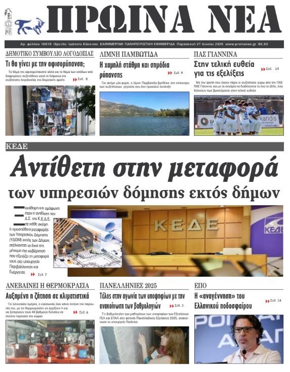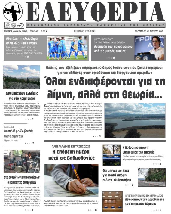 ΑρχικήΕΙΔΗΣΕΙΣΗΠΕΙΡΟΣ ΗΠΕΙΡΟΣ Τα πρωτοσέλιδα των γιαννιώτικων εφημερίδων 27.06.2025 0 FacebookTwitterWhatsAppEmailΤυπώνωViber Διαβάστε στα πρωτοσέλιδα των γιαννιώτικων εφημερίδων 27 Ιουνίου 2025 TagsΓΙΑΝΝΙΩΤΙΚΕΣ ΕΦΗΜΕΡΙΔΕΣΠΡΩΤΟΣΕΛΙΔΑ FacebookTwitterWhatsAppEmailΤυπώνωViber Προηγούμενο άρθροΚρήτη -Τροχαίο με νεκρό 38χρονο οδηγό μηχανήςΕπόμενο άρθροΓυμνή Αλήθεια ΣΧΕΤΙΚΑ ΑΡΘΡΑ Τα πρωτοσέλιδα των γιαννιώτικων εφημερίδων TOP STORIES 19.11.2025 Τα πρωτοσέλιδα των γιαννιώτικων εφημερίδων ΗΠΕΙΡΟΣ 18.11.2025 Τα πρωτοσέλιδα των γιαννιώτικων εφημερίδων ΗΠΕΙΡΟΣ 15.11.2025 Τα πρωτοσέλιδα των γιαννιώτικων εφημερίδων ΗΠΕΙΡΟΣ 14.11.2025 Τα πρωτοσέλιδα των γιαννιώτικων εφημερίδων ΗΠΕΙΡΟΣ 13.11.2025 Τα πρωτοσέλιδα των γιαννιώτικων εφημερίδων ΗΠΕΙΡΟΣ 12.11.2025 ΣΤΗΝ ΙΔΙΑ ΚΑΤΗΓΟΡΙΑ Αντλήσεις υδάτων και κλειστοί δρόμοι στη Θεσπρωτία ΗΠΕΙΡΟΣ 19.11.2025 Ζημιές σε ηλεκτρικές συσκευές από τον κεραυνό που έπεσε σε στέγη ΗΠΕΙΡΟΣ 19.11.2025 Επίσκεψη μελών του κινήματος ΝΙΚΗΣ στη Διεύθυνση Δευτεροβάθμιας Εκπαίδευσης ΗΠΕΙΡΟΣ 19.11.2025 Ισχυρή κακοκαιρία στην Ήπειρο – Ζημιές, κατολισθήσεις και ρεκόρ βροχόπτωσης ΗΠΕΙΡΟΣ 19.11.2025 Στην Ήπειρο τα μεγαλύτερα ύψη βροχής TOP STORIES 19.11.2025 ΑΔΕΔΥ Ιωαννίνων: Τα αποτελέσματα των εκλογών για τη νέα Εκτελεστική Γραμματεία ΗΠΕΙΡΟΣ 19.11.2025 ΜΗ ΧΑΣΕΤΕ Αντλήσεις υδάτων και κλειστοί δρόμοι στη Θεσπρωτία Ζημιές σε ηλεκτρικές συσκευές από τον κεραυνό που έπεσε σε στέγη Στην Ήπειρο τα μεγαλύτερα ύψη βροχής Νέες ρυθμίσεις για υπερχρεωμένους οφειλέτες, voucher για πρόληψη της οικονομικής κατάρρευσης Στο επίκεντρο ο ρόλος των νοσηλευτών ΔΗΜΟΦΙΛΗ Επίσκεψη μελών του κινήματος ΝΙΚΗΣ στη Διεύθυνση Δευτεροβάθμιας Εκπαίδευσης Ευρεία ρωσική επίθεση στη δυτική Ουκρανία – 10 νεκροί από πυραύλους και drones Ο Κυριάκος Πιερρακάκης υποψήφιος για την προεδρία του Eurogroup Το Πωγώνι φωτίζεται στο φως του κινηματογράφου Τουρισμός για Όλους 2025: Κληρώθηκαν οι δικαιούχοι της χαμηλής περιόδου