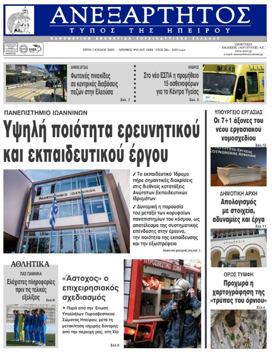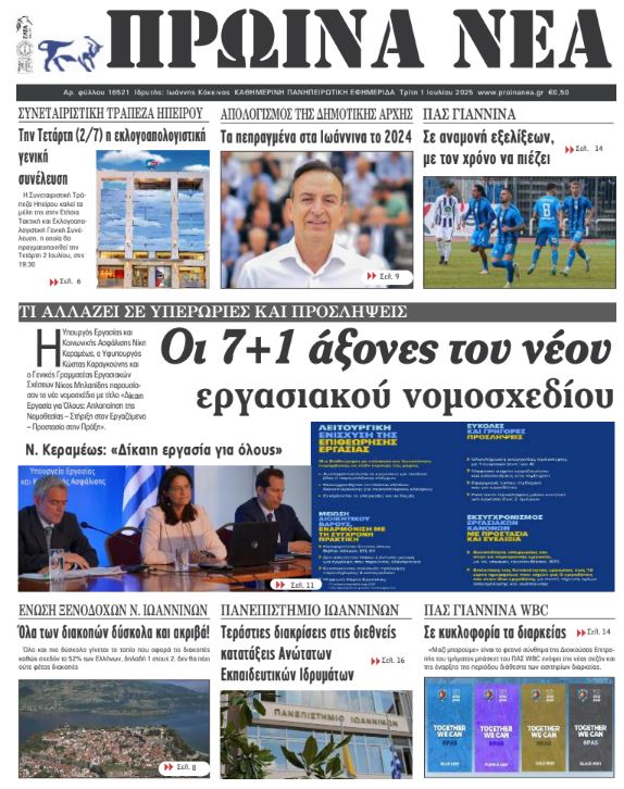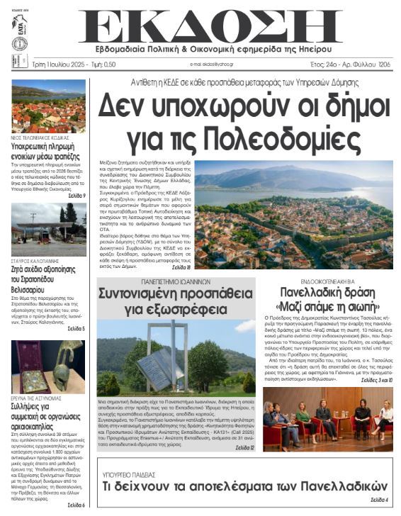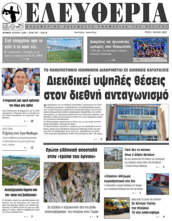 ΑρχικήΕΙΔΗΣΕΙΣΗΠΕΙΡΟΣ ΗΠΕΙΡΟΣ Τα πρωτοσέλιδα των γιαννιώτικων εφημερίδων 01.07.2025 0 FacebookTwitterWhatsAppEmailΤυπώνωViber Διαβάστε στα πρωτοσέλιδα των γιαννιώτικων εφημερίδων 1 Ιουλίου 2025 TagsΓΙΑΝΝΙΩΤΙΚΕΣ ΕΦΗΜΕΡΙΔΕΣΠΡΩΤΟΣΕΛΙΔΑ FacebookTwitterWhatsAppEmailΤυπώνωViber Προηγούμενο άρθροΜηχανογραφικό 2025: Οι τρεις βασικοί άξονες στη συμπλήρωσή τουΕπόμενο άρθροΣε κυκλοφορία τα διαρκείας του ΠΑΣ WBC ΣΧΕΤΙΚΑ ΑΡΘΡΑ Τα πρωτοσέλιδα των γιαννιώτικων εφημερίδων TOP STORIES 08.11.2025 Τα πρωτοσέλιδα των γιαννιώτικων εφημερίδων ΗΠΕΙΡΟΣ 07.11.2025 Τα πρωτοσέλιδα των γιαννιώτικων εφημερίδων ΗΠΕΙΡΟΣ 06.11.2025 Τα πρωτοσέλιδα των γιαννιώτικων εφημερίδων ΗΠΕΙΡΟΣ 05.11.2025 Τα πρωτοσέλιδα των γιαννιώτικων εφημερίδων ΗΠΕΙΡΟΣ 04.11.2025 Τα πρωτοσέλιδα των γιαννιώτικων εφημερίδων TOP STORIES 01.11.2025 ΣΤΗΝ ΙΔΙΑ ΚΑΤΗΓΟΡΙΑ Τα πρωτοσέλιδα των γιαννιώτικων εφημερίδων TOP STORIES 08.11.2025 Μαθητές του 5ου Γυμνασίου Ιωαννίνων στην κορυφή του Μιτσικελίου ΗΠΕΙΡΟΣ 07.11.2025 Επίτιμος Διδάκτορας του Τμήματος Φιλολογίας ο Γιώργος Κεχαγιόγλου ΗΠΕΙΡΟΣ 07.11.2025 Οι ναυαγοσωστικές δαπάνες «πνίγουν» τους δήμους ΗΠΕΙΡΟΣ 07.11.2025 Ενημερωτική ημερίδα στα Ιωάννινα για τη δωρεά και μεταμόσχευση οργάνων ΗΠΕΙΡΟΣ 07.11.2025 Εγκαίνια στο Κατάστημα Αναμνηστικών του Πανεπιστημίου Ιωαννίνων ΗΠΕΙΡΟΣ 07.11.2025 ΜΗ ΧΑΣΕΤΕ Τα πρωτοσέλιδα των γιαννιώτικων εφημερίδων Οι ναυαγοσωστικές δαπάνες «πνίγουν» τους δήμους Έκτακτο δελτίο επιδείνωσης από την ΕΜΥ – Πού θα βρέχει το επόμενο τριήμερο Μπαλωθιές τέλος στην Κρήτη – Τα μέτρα για την παράνομη οπλοκατοχή Χωρίς πινακίδες παραμένουν χιλιάδες δίκυκλα ΔΗΜΟΦΙΛΗ Γ. ΣΤΥΛΙΟΣ -Μείωση φόρων που ενισχύει το πραγματικό εισόδημα Κατέρρευσε στο β’ ημίχρονο ο ΠΑΣ απέναντι στον Ηρακλή Ιταλία: Αυξάνονται οι αιωνόβιοι στη χώρα -2.000 περισσότεροι σε σχέση με πέρυσι ΤΗΝ ΔΕΥΤΕΡΑ -Νομαρχιακή Συνδιάσκεψη του ΣΥΡΙΖΑ ΠΣ Ιωαννίνων Τα του Καίσαρος…