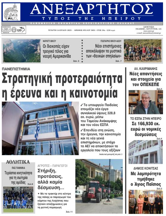ΑρχικήΕΙΔΗΣΕΙΣΗΠΕΙΡΟΣ ΗΠΕΙΡΟΣ Τα πρωτοσέλιδα των γιαννιώτικων εφημερίδων 16.07.2025 0 FacebookTwitterWhatsAppEmailΤυπώνωViber Διαβάστε στα πρωτοσέλιδα των γιαννιώτικων εφημερίδων 16 Ιουλίου 2025 TagsΓΙΑΝΝΙΩΤΙΚΕΣ ΕΦΗΜΕΡΙΔΕΣΠΡΩΤΟΣΕΛΙΔΑ FacebookTwitterWhatsAppEmailΤυπώνωViber Προηγούμενο άρθροΠέλλα: Ξέχασε να βάλει χειρόφρενο και παρασύρθηκε από το αυτοκίνητό τηςΕπόμενο άρθροΟΠΕΚΕΠΕ: Καταθέτει πρόταση εξεταστικής επιτροπής η κυβέρνηση ΣΧΕΤΙΚΑ ΑΡΘΡΑ Τα πρωτοσέλιδα των γιαννιώτικων εφημερίδων TOP STORIES 08.11.2025 Τα πρωτοσέλιδα των γιαννιώτικων εφημερίδων ΗΠΕΙΡΟΣ 07.11.2025 Τα πρωτοσέλιδα των γιαννιώτικων εφημερίδων ΗΠΕΙΡΟΣ 06.11.2025 Τα πρωτοσέλιδα των γιαννιώτικων εφημερίδων ΗΠΕΙΡΟΣ 05.11.2025 Τα πρωτοσέλιδα των γιαννιώτικων εφημερίδων ΗΠΕΙΡΟΣ 04.11.2025 Τα πρωτοσέλιδα των γιαννιώτικων εφημερίδων TOP STORIES 01.11.2025 ΣΤΗΝ ΙΔΙΑ ΚΑΤΗΓΟΡΙΑ Τα πρωτοσέλιδα των γιαννιώτικων εφημερίδων TOP STORIES 08.11.2025 Μαθητές του 5ου Γυμνασίου Ιωαννίνων στην κορυφή του Μιτσικελίου ΗΠΕΙΡΟΣ 07.11.2025 Επίτιμος Διδάκτορας του Τμήματος Φιλολογίας ο Γιώργος Κεχαγιόγλου ΗΠΕΙΡΟΣ 07.11.2025 Οι ναυαγοσωστικές δαπάνες «πνίγουν» τους δήμους ΗΠΕΙΡΟΣ 07.11.2025 Ενημερωτική ημερίδα στα Ιωάννινα για τη δωρεά και μεταμόσχευση οργάνων ΗΠΕΙΡΟΣ 07.11.2025 Εγκαίνια στο Κατάστημα Αναμνηστικών του Πανεπιστημίου Ιωαννίνων ΗΠΕΙΡΟΣ 07.11.2025 ΜΗ ΧΑΣΕΤΕ Τα πρωτοσέλιδα των γιαννιώτικων εφημερίδων Οι ναυαγοσωστικές δαπάνες «πνίγουν» τους δήμους Έκτακτο δελτίο επιδείνωσης από την ΕΜΥ – Πού θα βρέχει το επόμενο τριήμερο Μπαλωθιές τέλος στην Κρήτη – Τα μέτρα για την παράνομη οπλοκατοχή Χωρίς πινακίδες παραμένουν χιλιάδες δίκυκλα ΔΗΜΟΦΙΛΗ Γ. ΣΤΥΛΙΟΣ -Μείωση φόρων που ενισχύει το πραγματικό εισόδημα Τα του Καίσαρος… Η Ευρωπαϊκή Ένωση στηρίζει την καθαρή μετάβαση Τα πρωτοσέλιδα των γιαννιώτικων εφημερίδων Ιταλία: Αυξάνονται οι αιωνόβιοι στη χώρα -2.000 περισσότεροι σε σχέση με πέρυσι