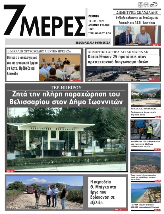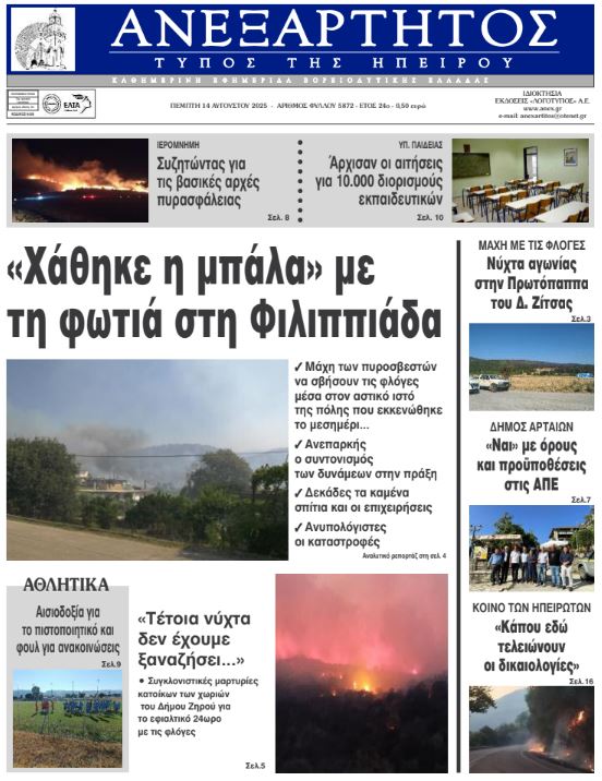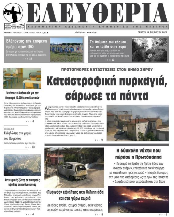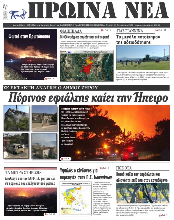 ΑρχικήΕΙΔΗΣΕΙΣΗΠΕΙΡΟΣ ΗΠΕΙΡΟΣ Τα πρωτοσέλιδα των γιαννιώτικων εφημερίδων 14.08.2025 0 FacebookTwitterWhatsAppEmailΤυπώνωViber Διαβάστε στα πρωτοσέλιδα των γιαννιώτικων εφημερίδων Πέμπτη 14 Αυγούστου 2025 TagsΓΙΑΝΝΙΩΤΙΚΕΣ ΕΦΗΜΕΡΙΔΕΣΠΡΩΤΟΣΕΛΙΔΑ FacebookTwitterWhatsAppEmailΤυπώνωViber Προηγούμενο άρθροΑνδρουλάκης: Η σκέψη μας σε κατοίκους, πυροσβέστες, πιλότους εναέριων μέσων και εθελοντέςΕπόμενο άρθροΤα του Καίσαρος… ΣΧΕΤΙΚΑ ΑΡΘΡΑ Τα πρωτοσέλιδα των γιαννιώτικων εφημερίδων TOP STORIES 05.11.2025 Τα πρωτοσέλιδα των γιαννιώτικων εφημερίδων ΗΠΕΙΡΟΣ 04.11.2025 Τα πρωτοσέλιδα των γιαννιώτικων εφημερίδων TOP STORIES 01.11.2025 Τα πρωτοσέλιδα των γιαννιώτικων εφημερίδων ΗΠΕΙΡΟΣ 31.10.2025 Τα πρωτοσέλιδα των γιαννιώτικων εφημερίδων ΗΠΕΙΡΟΣ 30.10.2025 Τα πρωτοσέλιδα των γιαννιώτικων εφημερίδων ΗΠΕΙΡΟΣ 28.10.2025 ΣΤΗΝ ΙΔΙΑ ΚΑΤΗΓΟΡΙΑ 206 πυρκαγιές με 61.000 καμένα στρέμματα στην Ήπειρο ΗΠΕΙΡΟΣ 05.11.2025 Κινητοποιήσεις για τα ΕΛΤΑ σε Μέτσοβο – Καναλάκι ΗΠΕΙΡΟΣ 05.11.2025 Αντιπαράθεση στη Ζίτσα για τη στάση της αντιπολίτευσης στο Δημοτικό Συμβούλιο ΗΠΕΙΡΟΣ 05.11.2025 Τμηματική διακοπή κυκλοφορίας στην 28ης Οκτωβρίου λόγω εργασιών διαγράμμισης ΗΠΕΙΡΟΣ 05.11.2025 Συνελήφθη αλλοδαπός στα Ιωάννινα για παράνομη κατοχή μαχαιριού ΗΠΕΙΡΟΣ 05.11.2025 Συνελήφθη οδηγός στα Ιωάννινα για επικίνδυνη οδήγηση και απείθεια ΗΠΕΙΡΟΣ 05.11.2025 ΜΗ ΧΑΣΕΤΕ 206 πυρκαγιές με 61.000 καμένα στρέμματα στην Ήπειρο Προτάσεις του ΤΕΕ για τη συνέχιση της λειτουργίας και των έργων της Εγνατίας Στα όριά του το ΠΓΝΙ με σχεδόν 500.000 ασθενείς μέσα στο 2025 Παραίτηση Σκλήκα μετά τη σφοδρή αντίδραση των βουλευτών Τα πρωτοσέλιδα των γιαννιώτικων εφημερίδων ΔΗΜΟΦΙΛΗ Πολιτικές εξελίξεις και προσυνεδριακός διάλογος Προτάσεις του ΤΕΕ για τη συνέχιση της λειτουργίας και των έργων της Εγνατίας 3ο Πανελλήνιο Συμπόσιο Ανόργανης Χημείας στο Πανεπιστήμιο Ιωαννίνων Τα του Καίσαρος… Συνελήφθη οδηγός στα Ιωάννινα για επικίνδυνη οδήγηση και απείθεια