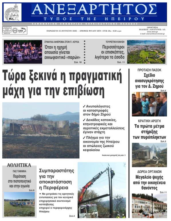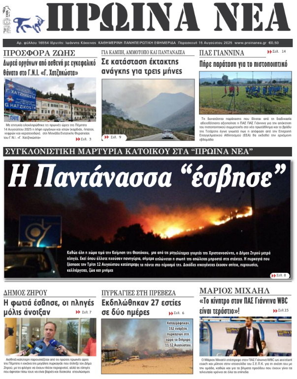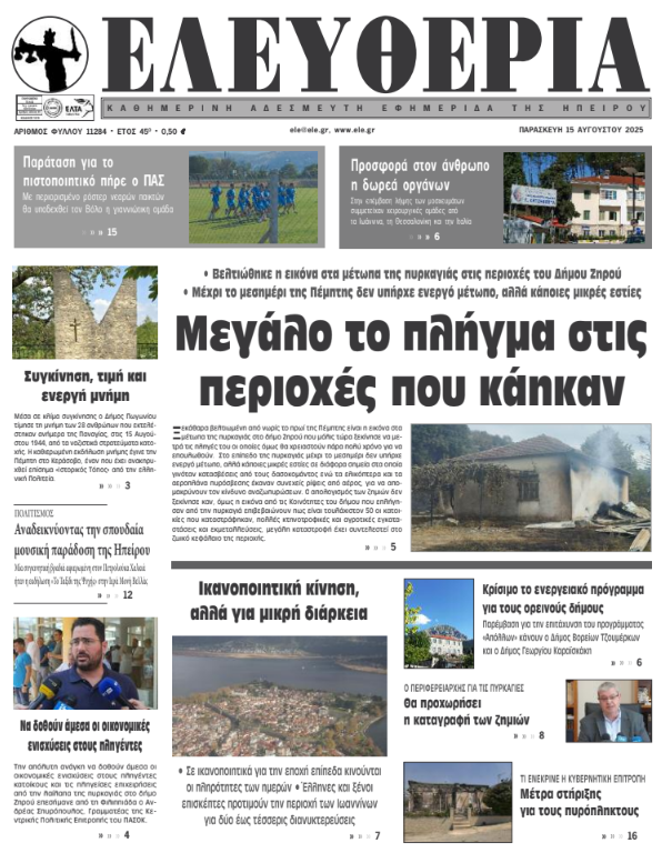 Διαβάστε στα πρωτοσέλιδα των γιαννιώτικων εφημερίδων Παρασκευή 15 Αυγούστου 2025