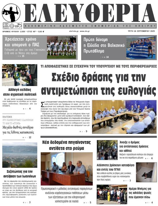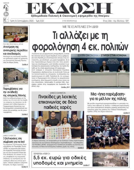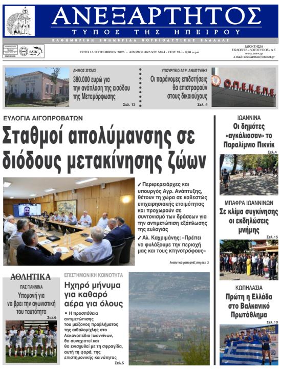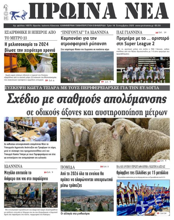 ΑρχικήΕΙΔΗΣΕΙΣΗΠΕΙΡΟΣ ΗΠΕΙΡΟΣ Τα πρωτοσέλιδα των γιαννιώτικων εφημερίδων 16.09.2025 0 FacebookTwitterWhatsAppEmailΤυπώνωViber Διαβάστε στα πρωτοσέλιδα των γιαννιώτικων εφημερίδων Τρίτη 16 Σεπτεμβρίου 2025 TagsΓΙΑΝΝΙΩΤΙΚΕΣ ΕΦΗΜΕΡΙΔΕΣΠΡΩΤΟΣΕΛΙΔΑ FacebookTwitterWhatsAppEmailΤυπώνωViber Προηγούμενο άρθροΗ ιχθυοπανίδα του ποταμού Αώου και η σημασία προστασίας του Επόμενο άρθροΑντίστροφη προσέγγιση για την έγκαιρη διάγνωση και πρόληψη της υπερχοληστερολαιμίας ΣΧΕΤΙΚΑ ΑΡΘΡΑ Τα πρωτοσέλιδα των γιαννιώτικων εφημερίδων ΗΠΕΙΡΟΣ 05.11.2025 Τα πρωτοσέλιδα των γιαννιώτικων εφημερίδων ΗΠΕΙΡΟΣ 04.11.2025 Τα πρωτοσέλιδα των γιαννιώτικων εφημερίδων TOP STORIES 01.11.2025 Τα πρωτοσέλιδα των γιαννιώτικων εφημερίδων ΗΠΕΙΡΟΣ 31.10.2025 Τα πρωτοσέλιδα των γιαννιώτικων εφημερίδων ΗΠΕΙΡΟΣ 30.10.2025 Τα πρωτοσέλιδα των γιαννιώτικων εφημερίδων ΗΠΕΙΡΟΣ 28.10.2025 ΣΤΗΝ ΙΔΙΑ ΚΑΤΗΓΟΡΙΑ «Άναψε πράσινο» για Σωφρονιστικό Κατάστημα στους Φιλιάτες ΗΠΕΙΡΟΣ 05.11.2025 206 πυρκαγιές με 61.000 καμένα στρέμματα στην Ήπειρο ΗΠΕΙΡΟΣ 05.11.2025 Κινητοποιήσεις για τα ΕΛΤΑ σε Μέτσοβο – Καναλάκι TOP STORIES 05.11.2025 Αντιπαράθεση στη Ζίτσα για τη στάση της αντιπολίτευσης στο Δημοτικό Συμβούλιο ΗΠΕΙΡΟΣ 05.11.2025 Δήμος Ζίτσας: Απόφαση σταθμός της δημοτική αρχής για τη συνέχιση της λειτουργίας των ΕΛ.ΤΑ. ΗΠΕΙΡΟΣ 05.11.2025 Τμηματική διακοπή κυκλοφορίας στην 28ης Οκτωβρίου λόγω εργασιών διαγράμμισης ΗΠΕΙΡΟΣ 05.11.2025 ΜΗ ΧΑΣΕΤΕ «Άναψε πράσινο» για Σωφρονιστικό Κατάστημα στους Φιλιάτες 206 πυρκαγιές με 61.000 καμένα στρέμματα στην Ήπειρο Κινητοποιήσεις για τα ΕΛΤΑ σε Μέτσοβο – Καναλάκι Δήμος Ζίτσας: Απόφαση σταθμός της δημοτική αρχής για τη συνέχιση της λειτουργίας των ΕΛ.ΤΑ. Προτάσεις του ΤΕΕ για τη συνέχιση της λειτουργίας και των έργων της Εγνατίας ΔΗΜΟΦΙΛΗ Στον αέρα το μέλλον του ΠΑΣ – Έκκληση για στήριξη ΟΠΕΚΕΠΕ: Το σχέδιο για τον εκσυγχρονισμό των επιδοτήσεων Παραίτηση Σκλήκα μετά τη σφοδρή αντίδραση των βουλευτών Αντιπαράθεση στη Ζίτσα για τη στάση της αντιπολίτευσης στο Δημοτικό Συμβούλιο Προσωπικός Αριθμός: Εκπνέει σήμερα η προθεσμία – Αυτόματη απόδοση από αύριο