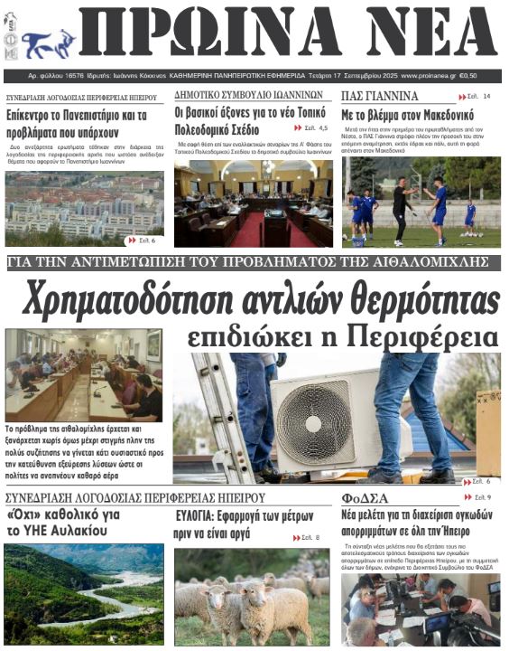 Διαβάστε στα πρωτοσέλιδα των γιαννιώτικων εφημερίδων Τετάρτη 17 Σεπτεμβρίου 2025