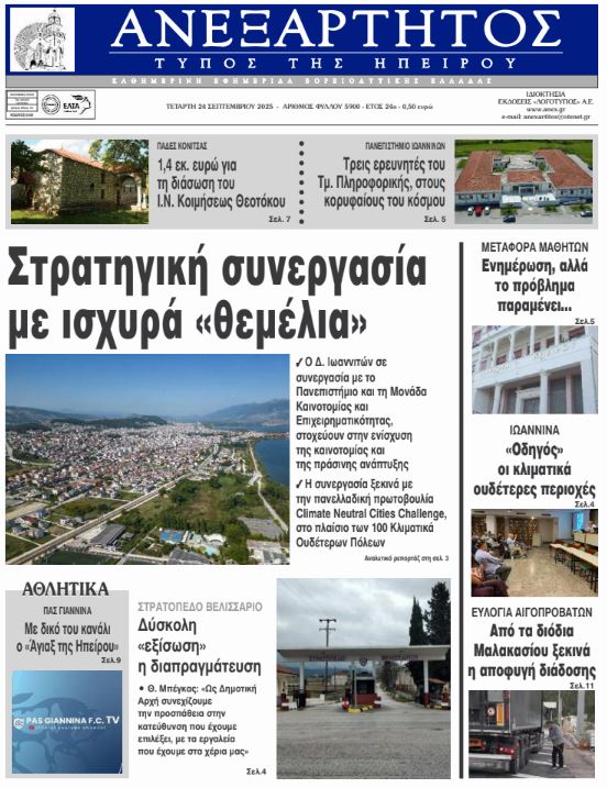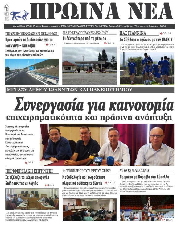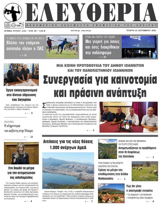 ΑρχικήΕΙΔΗΣΕΙΣΗΠΕΙΡΟΣ ΗΠΕΙΡΟΣ Τα πρωτοσέλιδα των γιαννιώτικων εφημερίδων 24.09.2025 0 FacebookTwitterWhatsAppEmailΤυπώνωViber Διαβάστε στα πρωτοσέλιδα των γιαννιώτικων εφημερίδων 24-9-2025 TagsΓΙΑΝΝΙΩΤΙΚΕΣ ΕΦΗΜΕΡΙΔΕΣΠΡΩΤΟΣΕΛΙΔΑ FacebookTwitterWhatsAppEmailΤυπώνωViber Προηγούμενο άρθροΣτη φυλακή ο 32χρονος που επιτέθηκε σε τρεις γυναίκες στο ΑιγάλεωΕπόμενο άρθροΠΑΝΕΠΙΣΤΗΜΙΟ ΙΩΑΝΝΙΝΩΝ -Τρεις ερευνητές του Τμ. Πληροφορικής, στους κορυφαίους του κόσμου ΣΧΕΤΙΚΑ ΑΡΘΡΑ Τα πρωτοσέλιδα των γιαννιώτικων εφημερίδων TOP STORIES 08.11.2025 Τα πρωτοσέλιδα των γιαννιώτικων εφημερίδων ΗΠΕΙΡΟΣ 07.11.2025 Τα πρωτοσέλιδα των γιαννιώτικων εφημερίδων ΗΠΕΙΡΟΣ 06.11.2025 Τα πρωτοσέλιδα των γιαννιώτικων εφημερίδων ΗΠΕΙΡΟΣ 05.11.2025 Τα πρωτοσέλιδα των γιαννιώτικων εφημερίδων ΗΠΕΙΡΟΣ 04.11.2025 Τα πρωτοσέλιδα των γιαννιώτικων εφημερίδων TOP STORIES 01.11.2025 ΣΤΗΝ ΙΔΙΑ ΚΑΤΗΓΟΡΙΑ Παρέλαβε δέμα με ναρκωτικά από θυρίδα ταχυμεταφορών ΗΠΕΙΡΟΣ 10.11.2025 Κοινό των Ηπειρωτών: Ανάγκη για πλήρη διαφάνεια στις παρεμβάσεις στον Γράμμο ΗΠΕΙΡΟΣ 10.11.2025 Μεγάλα προβλήματα από την κακοκαιρία σε Φιλιππιάδα, Πρέβεζα και Βόνιτσα ΗΠΕΙΡΟΣ 10.11.2025 Σύλληψη σε κατάστημα στα Ιωάννινα για διάθεση αλκοόλ σε ανηλίκους ΗΠΕΙΡΟΣ 10.11.2025 Συνελήφθη οδηγός στην Ιόνια Οδό υπό την επήρεια αλκοόλ ΗΠΕΙΡΟΣ 10.11.2025 Στις 22 Νοεμβρίου η τελετή ενθρόνισης του Μητροπολίτη Κόνιτσας ΗΠΕΙΡΟΣ 09.11.2025 ΜΗ ΧΑΣΕΤΕ Συντάξεις Δεκεμβρίου: Πότε θα καταβληθούν Ο «χάρτης» των πληρωμών από τον e-ΕΦΚΑ και τη ΔΥΠΑ έως την Παρασκευή 14 Νοεμβρίου Η Ελλάδα πρώτη στην ΕΕ σε πολίτες χωρίς αναγκαία ιατρική περίθαλψη Μεγάλα προβλήματα από την κακοκαιρία σε Φιλιππιάδα, Πρέβεζα και Βόνιτσα Ξεκινούν οι αιτήσεις για το επίδομα θέρμανσης ΔΗΜΟΦΙΛΗ Ήττα στις Σέρρες για τον ΠΑΣ από τον Πανσερραϊκό (70-66 ) Μεγάλα προβλήματα από την κακοκαιρία σε Φιλιππιάδα, Πρέβεζα και Βόνιτσα 4 αλλαγές στην καθημερινότητα για πιο υγιές έντερο Η Ελλάδα στις χώρες με τον χαμηλότερο πληθωρισμό τροφίμων στην ΕΕ Παρέλαβε δέμα με ναρκωτικά από θυρίδα ταχυμεταφορών