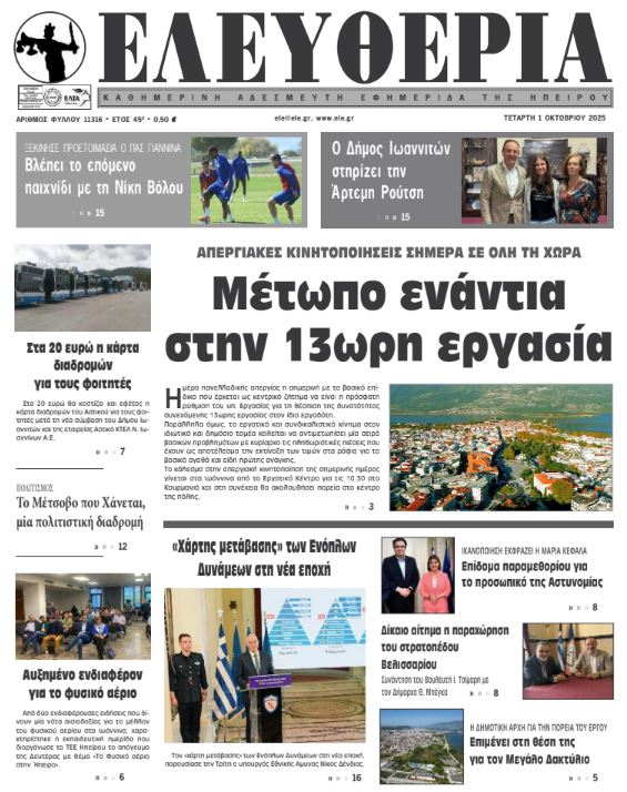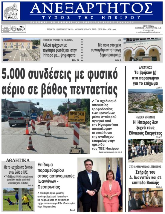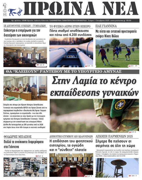 ΑρχικήΕΙΔΗΣΕΙΣΗΠΕΙΡΟΣ ΗΠΕΙΡΟΣ Τα πρωτοσέλιδα των γιαννιώτικων εφημερίδων 01.10.2025 0 FacebookTwitterWhatsAppEmailΤυπώνωViber Διαβάστε στα πρωτοσέλιδα των γιαννιώτικων εφημερίδων Τετάρτη 1 Οκτωβρίου 2025 TagsΓΙΑΝΝΙΩΤΙΚΕΣ ΕΦΗΜΕΡΙΔΕΣΠΡΩΤΟΣΕΛΙΔΑ FacebookTwitterWhatsAppEmailΤυπώνωViber Προηγούμενο άρθροΓ. ΑΜΥΡΑΣ -Μείωση 50% του ελάχιστου εισοδήματος για τους ιδιοκτήτες σχολικών κυλικείωνΕπόμενο άρθροTransboundary River Forum: Ένας ποταμός, δύο χώρες. Ένα βήμα πιο κοντά στη δημιουργία του πρώτου Διασυνοριακού Πάρκου Άγριου Ποταμού στην Ευρώπη, Αώου/Vjosa ΣΧΕΤΙΚΑ ΑΡΘΡΑ Τα πρωτοσέλιδα των γιαννιώτικων εφημερίδων TOP STORIES 01.11.2025 Τα πρωτοσέλιδα των γιαννιώτικων εφημερίδων ΗΠΕΙΡΟΣ 31.10.2025 Τα πρωτοσέλιδα των γιαννιώτικων εφημερίδων ΗΠΕΙΡΟΣ 30.10.2025 Τα πρωτοσέλιδα των γιαννιώτικων εφημερίδων ΗΠΕΙΡΟΣ 28.10.2025 Τα πρωτοσέλιδα των γιαννιώτικων εφημερίδων ΗΠΕΙΡΟΣ 25.10.2025 Τα πρωτοσέλιδα των γιαννιώτικων εφημερίδων ΗΠΕΙΡΟΣ 24.10.2025 ΣΤΗΝ ΙΔΙΑ ΚΑΤΗΓΟΡΙΑ Άρτα: Συνελήφθη δύο συνεχόμενες ημέρες να οδηγεί χωρίς άδεια ΗΠΕΙΡΟΣ 03.11.2025 Δικογραφία σε βάρος τριών ανηλίκων για φθορές σε σχολείο ΗΠΕΙΡΟΣ 03.11.2025 Στάση εργασίας της ΑΔΕΔΥ στα Ιωάννινα την Πέμπτη 6 Νοεμβρίου ΗΠΕΙΡΟΣ 03.11.2025 Κυκλοφοριακές ρυθμίσεις στην Ιόνια Οδό στις 4 και 5 Νοεμβρίου ΗΠΕΙΡΟΣ 03.11.2025 Ιωάννινα: Σύλληψη καταστηματάρχη για διάθεση αλκοόλ σε ανήλικους ΗΠΕΙΡΟΣ 03.11.2025 Άρτα: Σύλληψη οδηγού χωρίς άδεια – Παραβίασε κόκκινο φανάρι με μοτοσικλέτα ΗΠΕΙΡΟΣ 03.11.2025 ΜΗ ΧΑΣΕΤΕ Οι πληρωμές από e-ΕΦΚΑ και ΔΥΠΑ έως τις 7 Νοεμβρίου Βροχές και ήπιες θερμοκρασίες – Φθινοπωρινό ξεκίνημα για την εβδομάδα ΕΛΤΑ: Κλειστά δεκάδες καταστήματα από σήμερα – Η λίστα ανά περιοχή IRIS: Παράταση ενός μήνα και υποχρεωτική εφαρμογή από 1η Δεκεμβρίου Χρυσό μετάλλιο για την ομάδα iGEM Ioannina 2025 στο Παρίσι – Καινοτόμο έργο για τη διάσωση του ελληνικού πλατάνου ΔΗΜΟΦΙΛΗ Πέθανε η σύζυγος του Νότη Σφακιανάκη ΕΛΤΑ: Κλειστά δεκάδες καταστήματα από σήμερα – Η λίστα ανά περιοχή Ξεκινούν οι πρώτες κλήσεις από κάμερες – Πού βλέπουν οι πολίτες τα πρόστιμα Δικογραφία σε βάρος τριών ανηλίκων για φθορές σε σχολείο Μαρινάκης για ΕΛΤΑ: Άστοχος ο επικοινωνιακός χειρισμός από τη διοίκηση