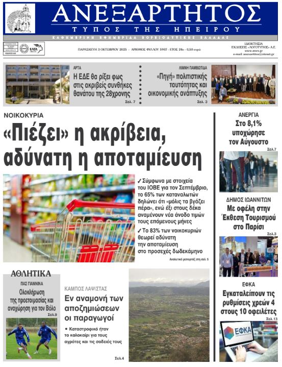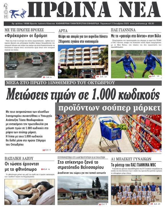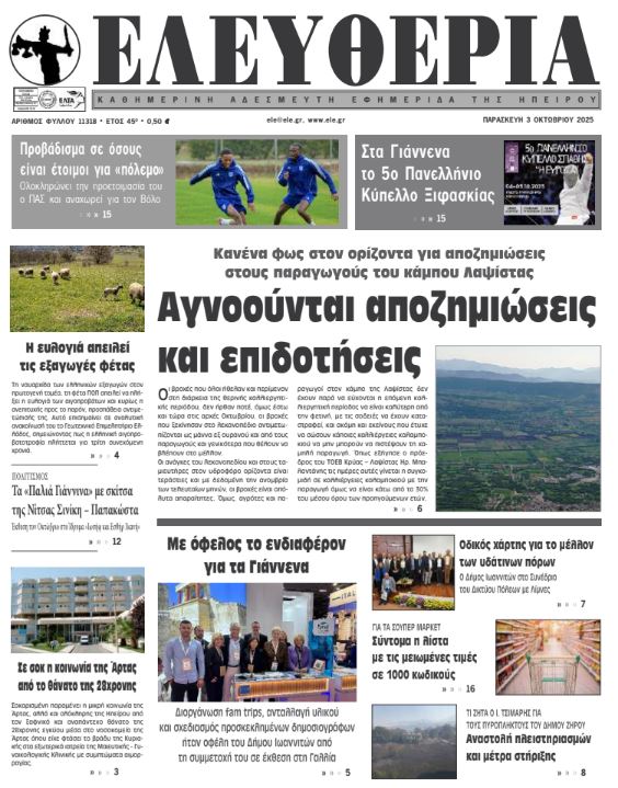ΑρχικήΕΙΔΗΣΕΙΣΗΠΕΙΡΟΣ ΗΠΕΙΡΟΣ Τα πρωτοσέλιδα των γιαννιώτικων εφημερίδων 03.10.2025 0 FacebookTwitterWhatsAppEmailΤυπώνωViber Διαβάστε στα πρωτοσέλιδα των γιαννιώτικων εφημερίδων Παρασκευή 3 Οκτωβρίου 2025 TagsΓΙΑΝΝΙΩΤΙΚΕΣ ΕΦΗΜΕΡΙΔΕΣΠΡΩΤΟΣΕΛΙΔΑ FacebookTwitterWhatsAppEmailΤυπώνωViber Προηγούμενο άρθροΠαρατείνεται η προθεσμία αιτήσεων για θερμοκήπια και στέγαστρα φυτικής παραγωγήςΕπόμενο άρθροΘάνατος 28χρονης εγκύου στην Άρτα – Ερωτήματα για τη χορήγηση αντιβιοτικού και τα πρωτόκολλα ασφαλείας ΣΧΕΤΙΚΑ ΑΡΘΡΑ Τα πρωτοσέλιδα των γιαννιώτικων εφημερίδων TOP STORIES 14.11.2025 Τα πρωτοσέλιδα των γιαννιώτικων εφημερίδων ΗΠΕΙΡΟΣ 13.11.2025 Τα πρωτοσέλιδα των γιαννιώτικων εφημερίδων ΗΠΕΙΡΟΣ 12.11.2025 Τα πρωτοσέλιδα των γιαννιώτικων εφημερίδων ΗΠΕΙΡΟΣ 11.11.2025 Τα πρωτοσέλιδα των γιαννιώτικων εφημερίδων TOP STORIES 08.11.2025 Τα πρωτοσέλιδα των γιαννιώτικων εφημερίδων ΗΠΕΙΡΟΣ 07.11.2025 ΣΤΗΝ ΙΔΙΑ ΚΑΤΗΓΟΡΙΑ Άρτα: Σύλληψη για επικίνδυνη οδήγηση και σωματική βλάβη από αμέλεια ΗΠΕΙΡΟΣ 14.11.2025 Συνελήφθη ημεδαπός στα Ιωάννινα για διακεκριμένες κλοπές ΗΠΕΙΡΟΣ 14.11.2025 Ενιαίο αστικό πάρκο στις παλιές στρατιωτικές φυλακές ΗΠΕΙΡΟΣ 14.11.2025 Τα πρωτοσέλιδα των γιαννιώτικων εφημερίδων TOP STORIES 14.11.2025 Διεθνές Γραφείο του Πανεπιστημίου Ιωαννίνων στη Νέα Υόρκη ΗΠΕΙΡΟΣ 14.11.2025 Ανακοινώσεις του Δημάρχου Αρταίων Χριστ. Σιαφάκα στο Δημοτικό Συμβούλιο ΗΠΕΙΡΟΣ 13.11.2025 ΜΗ ΧΑΣΕΤΕ Ενιαίο αστικό πάρκο στις παλιές στρατιωτικές φυλακές Τα πρωτοσέλιδα των γιαννιώτικων εφημερίδων Επιχείρηση της Αστυνομίας Ιωαννίνων στον Πειραιά – Σύλληψη για ναρκωτικά και οπλισμό Δένδρο στην πλατεία, συναυλία στο Πνευματικό Κέντρο; «Λεόντειοι όροι» στη σύμβαση για τα LED ΔΗΜΟΦΙΛΗ Αποφασισμένοι να τα αλλάξουν όλα Πιερρακάκης: Στόχος να υποχωρήσει το ΑΕΠ κάτω από το 120% έως το 2030 Άρτα: Σύλληψη για επικίνδυνη οδήγηση και σωματική βλάβη από αμέλεια Η Ελλάδα θα χάσει 2 εκατ. εργαζόμενους έως το 2050 Εκπτώσεις έως και 50% στα ακτοπλοϊκά εισιτήρια των αναπληρωτών εκπαιδευτικών