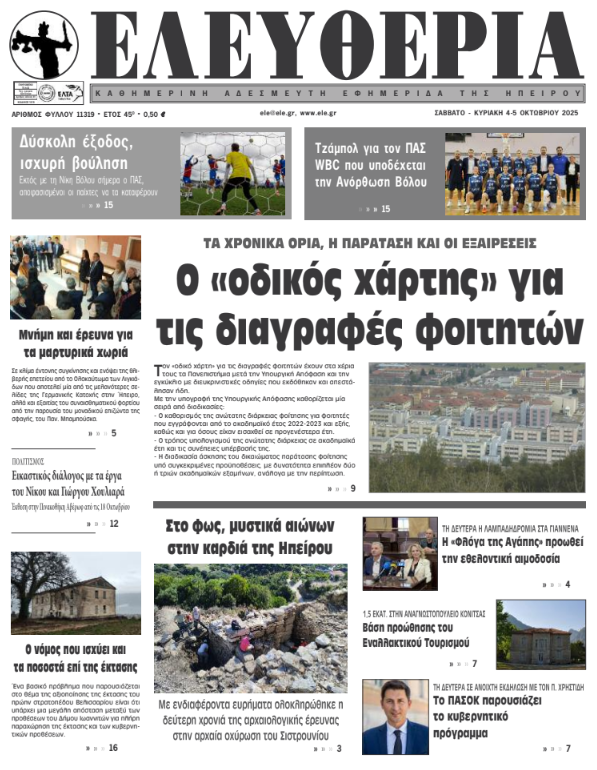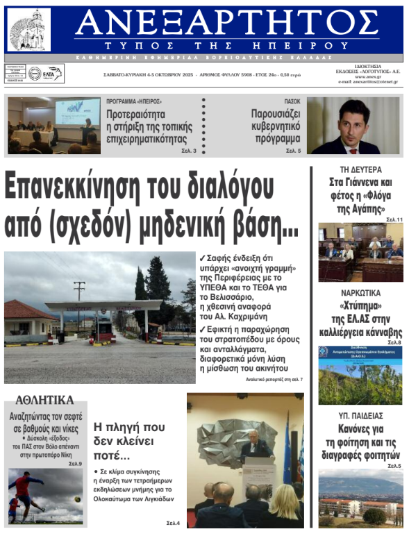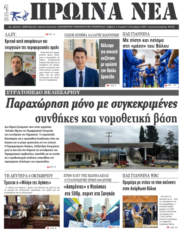 ΑρχικήΕΙΔΗΣΕΙΣΗΠΕΙΡΟΣ ΗΠΕΙΡΟΣ Τα πρωτοσέλιδα των γιαννιώτικων εφημερίδων 04.10.2025 0 FacebookTwitterWhatsAppEmailΤυπώνωViber Διαβάστε στα πρωτοσέλιδα των γιαννιώτικων εφημερίδων 4-5 Οκτωβρίου 2025 TagsΓΙΑΝΝΙΩΤΙΚΕΣ ΕΦΗΜΕΡΙΔΕΣΠΡΩΤΟΣΕΛΙΔΑ FacebookTwitterWhatsAppEmailΤυπώνωViber Προηγούμενο άρθροΚυκλοφοριακές ρυθμίσεις στην Ιόνια ΟδόΕπόμενο άρθροΔε θα σταματήσει η νομική διεκδίκηση για τις γερμανικές αποζημιώσεις ΣΧΕΤΙΚΑ ΑΡΘΡΑ Τα πρωτοσέλιδα των γιαννιώτικων εφημερίδων TOP STORIES 29.11.2025 Τα πρωτοσέλιδα των γιαννιώτικων εφημερίδων ΗΠΕΙΡΟΣ 28.11.2025 Τα πρωτοσέλιδα των γιαννιώτικων εφημερίδων ΗΠΕΙΡΟΣ 27.11.2025 Τα πρωτοσέλιδα των γιαννιώτικων εφημερίδων ΗΠΕΙΡΟΣ 26.11.2025 Τα πρωτοσέλιδα των γιαννιώτικων εφημερίδων ΗΠΕΙΡΟΣ 25.11.2025 Τα πρωτοσέλιδα των γιαννιώτικων εφημερίδων ΗΠΕΙΡΟΣ 22.11.2025 ΣΤΗΝ ΙΔΙΑ ΚΑΤΗΓΟΡΙΑ Τα πρωτοσέλιδα των γιαννιώτικων εφημερίδων TOP STORIES 29.11.2025 Προμήθεια εξοπλισμού σε εκπαιδευτικές δομές της Ηπείρου ΗΠΕΙΡΟΣ 29.11.2025 Γ.Ν.Ι. “Γ.ΧΑΤΖΗΚΩΣΤΑ” -Εισροή υδάτων από την οροφή σε δύο χειρουργικές αίθουσες ΗΠΕΙΡΟΣ 29.11.2025 Διαγωνισμός για έργα ενεργειακής αναβάθμισης στο ΠΓΝΙ ΗΠΕΙΡΟΣ 28.11.2025 Εισροή νερού σε δύο χειρουργικές αίθουσες στο νοσοκομείο «Χατζηκώστα» ΗΠΕΙΡΟΣ 28.11.2025 Άρτα: Αλλοδαπός έκλεψε 850 ευρώ από ηλικιωμένο ΗΠΕΙΡΟΣ 28.11.2025 ΜΗ ΧΑΣΕΤΕ Τα πρωτοσέλιδα των γιαννιώτικων εφημερίδων Σήμερα η επιστροφή ενοικίου στους δικαιούχους Σήμερα η «Black Friday»: Τι πρέπει να προσέξετε στις αγορές σας Νέες κατολισθήσεις στα Τζουμέρκα μετά την κακοκαιρία Εμφανίστηκε ξανά η εποχική λίμνη Βρέλλη ΔΗΜΟΦΙΛΗ Γ.Ν.Ι. “Γ.ΧΑΤΖΗΚΩΣΤΑ” -Εισροή υδάτων από την οροφή σε δύο χειρουργικές αίθουσες Προμήθεια εξοπλισμού σε εκπαιδευτικές δομές της Ηπείρου Τα πρωτοσέλιδα των γιαννιώτικων εφημερίδων 15 Δεκεμβρίου οι εξετάσεις για άδεια φαρμακοποιού Η επιστροφή ενοικίου σε 10 +1 ερωτήσεις και απαντήσεις