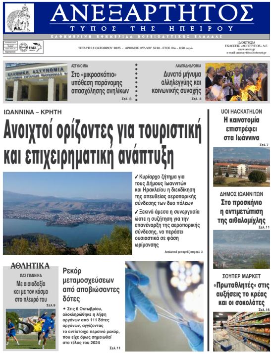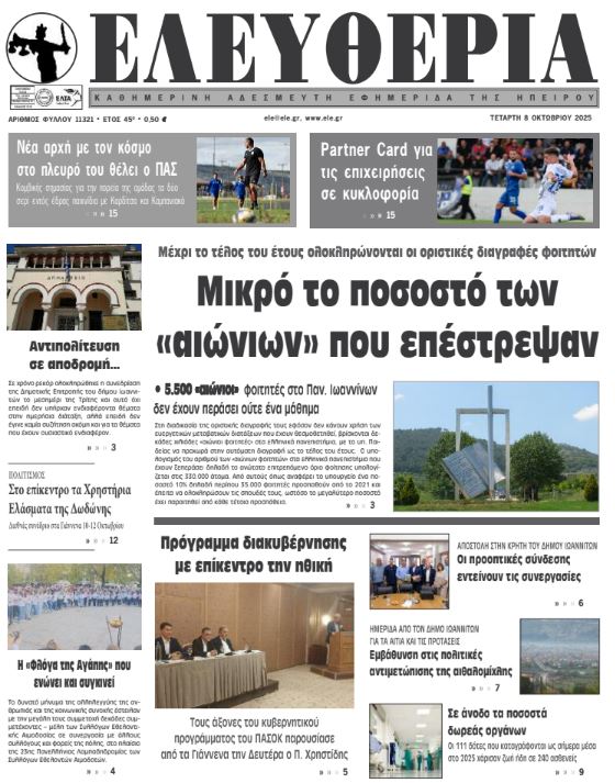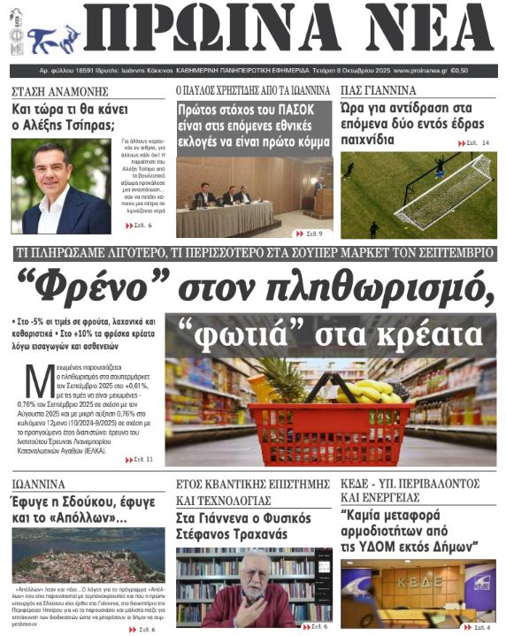 ΑρχικήΕΙΔΗΣΕΙΣΗΠΕΙΡΟΣ ΗΠΕΙΡΟΣ Τα πρωτοσέλιδα των γιαννιώτικων εφημερίδων 08.10.2025 0 FacebookTwitterWhatsAppEmailΤυπώνωViber Διαβάστε στα πρωτοσέλιδα των γιαννιώτικων εφημερίδων Τετάρτη 8 Οκτωβρίου 2025 TagsΓΙΑΝΝΙΩΤΙΚΕΣ ΕΦΗΜΕΡΙΔΕΣΠΡΩΤΟΣΕΛΙΔΑ FacebookTwitterWhatsAppEmailΤυπώνωViber Προηγούμενο άρθροΟικονομικός αντίκτυπος των στοιχηματικών τάσεων σε ειδησεογραφικές πλατφόρμεςΕπόμενο άρθροΛιγοστοί οι «αιώνιοι φοιτητές» που επέστρεψαν στις σπουδές τους ΣΧΕΤΙΚΑ ΑΡΘΡΑ Τα πρωτοσέλιδα των γιαννιώτικων εφημερίδων ΗΠΕΙΡΟΣ 04.11.2025 Τα πρωτοσέλιδα των γιαννιώτικων εφημερίδων TOP STORIES 01.11.2025 Τα πρωτοσέλιδα των γιαννιώτικων εφημερίδων ΗΠΕΙΡΟΣ 31.10.2025 Τα πρωτοσέλιδα των γιαννιώτικων εφημερίδων ΗΠΕΙΡΟΣ 30.10.2025 Τα πρωτοσέλιδα των γιαννιώτικων εφημερίδων ΗΠΕΙΡΟΣ 28.10.2025 Τα πρωτοσέλιδα των γιαννιώτικων εφημερίδων ΗΠΕΙΡΟΣ 25.10.2025 ΣΤΗΝ ΙΔΙΑ ΚΑΤΗΓΟΡΙΑ Για «συντήρηση» του δρόμου στο Γράμμο τα ερπυστριοφόρα του Στρατού ΗΠΕΙΡΟΣ 04.11.2025 Η ΠΕΝΤΕ Α.Ε. απαντά στις καταγγελίες και υπερασπίζεται τη διαφάνεια στη συμφωνία με την «ΠΑΠΑΓΕΩΡΓΙΟΥ» ΗΠΕΙΡΟΣ 04.11.2025 Νέα δημοτική αγορά και παρεμβάσεις αναβάθμισης στην Αγία Μαρίνα ΗΠΕΙΡΟΣ 04.11.2025 Συμβολικές κινητοποιήσεις σε Μέτσοβο και Πωγώνι για τα καταστήματα ΕΛΤΑ ΗΠΕΙΡΟΣ 04.11.2025 Κινητοποίηση για τη διατήρηση του καταστήματος των ΕΛΤΑ Πραμάντων ΗΠΕΙΡΟΣ 04.11.2025 Κανένα θανατηφόρο τροχαίο φέτος τον Οκτώβριο TOP STORIES 04.11.2025 ΜΗ ΧΑΣΕΤΕ Για «συντήρηση» του δρόμου στο Γράμμο τα ερπυστριοφόρα του Στρατού Νέα δημοτική αγορά και παρεμβάσεις αναβάθμισης στην Αγία Μαρίνα Κανένα θανατηφόρο τροχαίο φέτος τον Οκτώβριο Ανοίγει η πλατφόρμα για το επίδομα θέρμανσης ΕΛΤΑ – Τρίμηνη αναστολή και κινητοποιήσεις στην Ήπειρο ΔΗΜΟΦΙΛΗ Πέθανε ο πρώην αντιπρόεδρος των ΗΠΑ Ντικ Τσέινι Ανοίγει η πλατφόρμα για το επίδομα θέρμανσης Τα πρωτοσέλιδα των γιαννιώτικων εφημερίδων Εκδήλωση για τα παραδοσιακά επαγγέλματα της Ηπείρου στο Ευρωπαϊκό Κοινοβούλιο Πανσέληνος Νοεμβρίου: Πότε θα απολαύσουμε το «Φεγγάρι του Κάστορα»