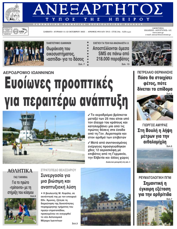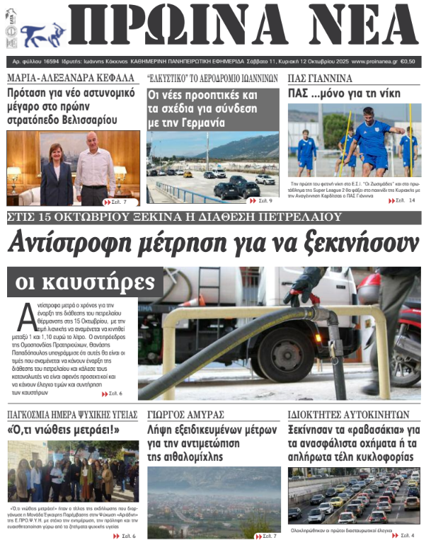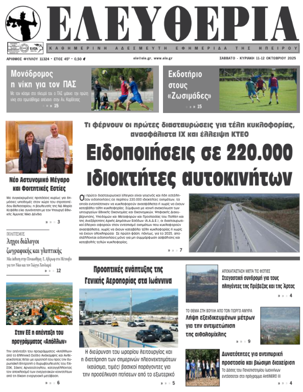 ΑρχικήΕΙΔΗΣΕΙΣΗΠΕΙΡΟΣ ΗΠΕΙΡΟΣ Τα πρωτοσέλιδα των γιαννιώτικων εφημερίδων 11.10.2025 0 FacebookTwitterWhatsAppEmailΤυπώνωViber Διαβάστε στα πρωτοσέλιδα των γιαννιώτικων εφημερίδων 11-12 Οκτωβρίου 2025 TagsΓΙΑΝΝΙΩΤΙΚΕΣ ΕΦΗΜΕΡΙΔΕΣΠΡΩΤΟΣΕΛΙΔΑ FacebookTwitterWhatsAppEmailΤυπώνωViber Προηγούμενο άρθροΞεκίνησαν τα «ραβασάκια» για τα ανασφάλιστα οχήματα ή τα απλήρωτα τέλη κυκλοφορίαςΕπόμενο άρθροΜονόδρομος η νίκη για τον ΠΑΣ ΣΧΕΤΙΚΑ ΑΡΘΡΑ Τα πρωτοσέλιδα των γιαννιώτικων εφημερίδων ΗΠΕΙΡΟΣ 05.11.2025 Τα πρωτοσέλιδα των γιαννιώτικων εφημερίδων ΗΠΕΙΡΟΣ 04.11.2025 Τα πρωτοσέλιδα των γιαννιώτικων εφημερίδων TOP STORIES 01.11.2025 Τα πρωτοσέλιδα των γιαννιώτικων εφημερίδων ΗΠΕΙΡΟΣ 31.10.2025 Τα πρωτοσέλιδα των γιαννιώτικων εφημερίδων ΗΠΕΙΡΟΣ 30.10.2025 Τα πρωτοσέλιδα των γιαννιώτικων εφημερίδων ΗΠΕΙΡΟΣ 28.10.2025 ΣΤΗΝ ΙΔΙΑ ΚΑΤΗΓΟΡΙΑ «Άναψε πράσινο» για Σωφρονιστικό Κατάστημα στους Φιλιάτες ΗΠΕΙΡΟΣ 05.11.2025 206 πυρκαγιές με 61.000 καμένα στρέμματα στην Ήπειρο ΗΠΕΙΡΟΣ 05.11.2025 Κινητοποιήσεις για τα ΕΛΤΑ σε Μέτσοβο – Καναλάκι TOP STORIES 05.11.2025 Αντιπαράθεση στη Ζίτσα για τη στάση της αντιπολίτευσης στο Δημοτικό Συμβούλιο ΗΠΕΙΡΟΣ 05.11.2025 Δήμος Ζίτσας: Απόφαση σταθμός της δημοτική αρχής για τη συνέχιση της λειτουργίας των ΕΛ.ΤΑ. ΗΠΕΙΡΟΣ 05.11.2025 Τμηματική διακοπή κυκλοφορίας στην 28ης Οκτωβρίου λόγω εργασιών διαγράμμισης ΗΠΕΙΡΟΣ 05.11.2025 ΜΗ ΧΑΣΕΤΕ «Άναψε πράσινο» για Σωφρονιστικό Κατάστημα στους Φιλιάτες 206 πυρκαγιές με 61.000 καμένα στρέμματα στην Ήπειρο Κινητοποιήσεις για τα ΕΛΤΑ σε Μέτσοβο – Καναλάκι Δήμος Ζίτσας: Απόφαση σταθμός της δημοτική αρχής για τη συνέχιση της λειτουργίας των ΕΛ.ΤΑ. Προτάσεις του ΤΕΕ για τη συνέχιση της λειτουργίας και των έργων της Εγνατίας ΔΗΜΟΦΙΛΗ Προσωπικός Αριθμός: Εκπνέει σήμερα η προθεσμία – Αυτόματη απόδοση από αύριο Γαλλία: Αυτοκίνητο έπεσε σε πλήθος στο νησί Ολερόν Κινητοποιήσεις για τα ΕΛΤΑ σε Μέτσοβο – Καναλάκι Προτάσεις του ΤΕΕ για τη συνέχιση της λειτουργίας και των έργων της Εγνατίας 206 πυρκαγιές με 61.000 καμένα στρέμματα στην Ήπειρο