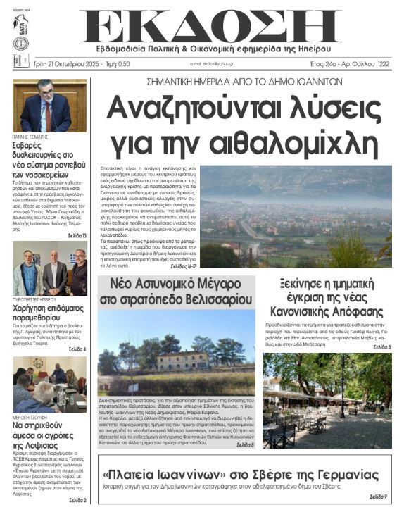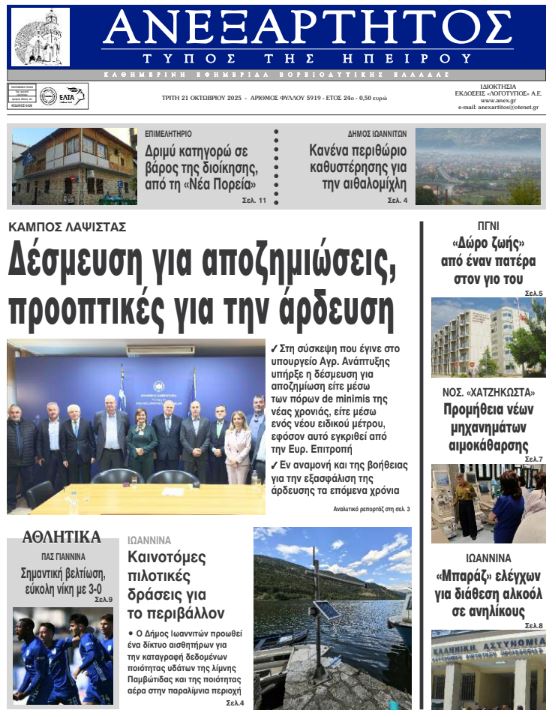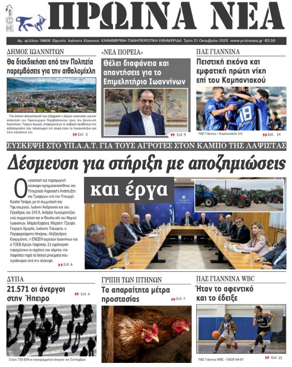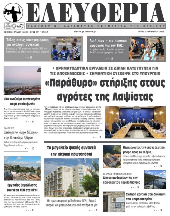 ΑρχικήΕΙΔΗΣΕΙΣΗΠΕΙΡΟΣ ΗΠΕΙΡΟΣ Τα πρωτοσέλιδα των γιαννιώτικων εφημερίδων 21.10.2025 0 FacebookTwitterWhatsAppEmailΤυπώνωViber Διαβάστε στα πρωτοσέλιδα των γιαννιώτικων εφημερίδων Τρίτη 21 Οκτωβρίου 2025 TagsΓΙΑΝΝΙΩΤΙΚΕΣ ΕΦΗΜΕΡΙΔΕΣΠΡΩΤΟΣΕΛΙΔΑ FacebookTwitterWhatsAppEmailΤυπώνωViber Προηγούμενο άρθροΔανία: Διάσημη εταιρεία ζυθοποιίας παρουσίασε τη μικρότερη μπύρα στον κόσμοΕπόμενο άρθροΤα του Καίσαρος… ΣΧΕΤΙΚΑ ΑΡΘΡΑ Τα πρωτοσέλιδα των γιαννιώτικων εφημερίδων TOP STORIES 14.11.2025 Τα πρωτοσέλιδα των γιαννιώτικων εφημερίδων ΗΠΕΙΡΟΣ 13.11.2025 Τα πρωτοσέλιδα των γιαννιώτικων εφημερίδων ΗΠΕΙΡΟΣ 12.11.2025 Τα πρωτοσέλιδα των γιαννιώτικων εφημερίδων ΗΠΕΙΡΟΣ 11.11.2025 Τα πρωτοσέλιδα των γιαννιώτικων εφημερίδων TOP STORIES 08.11.2025 Τα πρωτοσέλιδα των γιαννιώτικων εφημερίδων ΗΠΕΙΡΟΣ 07.11.2025 ΣΤΗΝ ΙΔΙΑ ΚΑΤΗΓΟΡΙΑ Παγκόσμια Ημέρα Προωρότητας: Μήνυμα ευαισθητοποίησης από το «Χατζηκώστα» και τον Δήμο Ιωαννιτών ΗΠΕΙΡΟΣ 14.11.2025 Ηγουμενίτσα: Κατασχέθηκαν πάνω από 350 κιλά κάνναβης σε κοινή επιχείρηση Λιμενικού και Δίωξης ΗΠΕΙΡΟΣ 14.11.2025 Άρτα: Σύλληψη για επικίνδυνη οδήγηση και σωματική βλάβη από αμέλεια ΗΠΕΙΡΟΣ 14.11.2025 Συνελήφθη ημεδαπός στα Ιωάννινα για διακεκριμένες κλοπές ΗΠΕΙΡΟΣ 14.11.2025 Ενιαίο αστικό πάρκο στις παλιές στρατιωτικές φυλακές ΗΠΕΙΡΟΣ 14.11.2025 Τα πρωτοσέλιδα των γιαννιώτικων εφημερίδων TOP STORIES 14.11.2025 ΜΗ ΧΑΣΕΤΕ Ενιαίο αστικό πάρκο στις παλιές στρατιωτικές φυλακές Τα πρωτοσέλιδα των γιαννιώτικων εφημερίδων Επιχείρηση της Αστυνομίας Ιωαννίνων στον Πειραιά – Σύλληψη για ναρκωτικά και οπλισμό Δένδρο στην πλατεία, συναυλία στο Πνευματικό Κέντρο; «Λεόντειοι όροι» στη σύμβαση για τα LED ΔΗΜΟΦΙΛΗ Υπερθέρμανση του πλανήτη και αυξημένοι θάνατοι παγκοσμίως από τη ζέστη Σαρώνουν τα μπλόκα του νέου ΚΟΚ Συνελήφθη ημεδαπός στα Ιωάννινα για διακεκριμένες κλοπές Η Ελλάδα θα χάσει 2 εκατ. εργαζόμενους έως το 2050 Παγκόσμια Ημέρα Προωρότητας: Μήνυμα ευαισθητοποίησης από το «Χατζηκώστα» και τον Δήμο Ιωαννιτών
