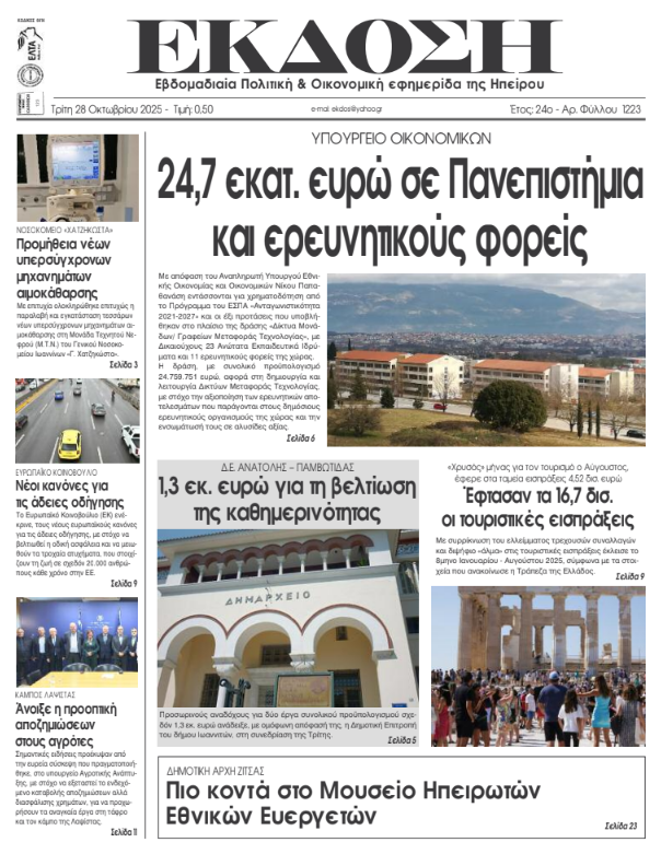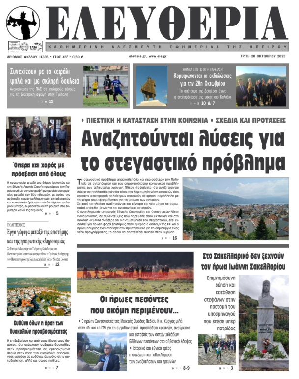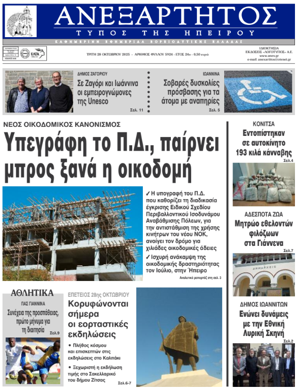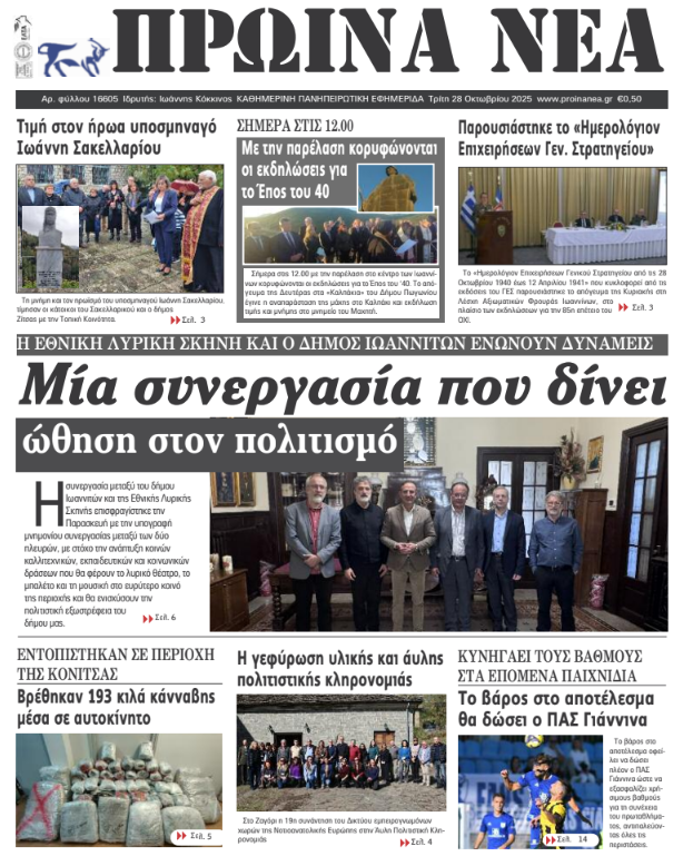 ΑρχικήTOP STORIES TOP STORIESΗΠΕΙΡΟΣ Τα πρωτοσέλιδα των γιαννιώτικων εφημερίδων 28.10.2025 0 FacebookTwitterWhatsAppEmailΤυπώνωViber Διαβάστε στα πρωτοσέλιδα των γιαννιώτικων εφημερίδων Τρίτη 28 Οκτωβρίου 2025 TagsΓΙΑΝΝΙΩΤΙΚΕΣ ΕΦΗΜΕΡΙΔΕΣΠΡΩΤΟΣΕΛΙΔΑ FacebookTwitterWhatsAppEmailΤυπώνωViber Προηγούμενο άρθροΚρήτη: Στη ΜΕΘ 11χρονος μετά από ατύχημα με ηλεκτρικό πατίνιΕπόμενο άρθροΤα του Καίσαρος… ΣΧΕΤΙΚΑ ΑΡΘΡΑ Τα πρωτοσέλιδα των γιαννιώτικων εφημερίδων ΗΠΕΙΡΟΣ 25.10.2025 Τα πρωτοσέλιδα των γιαννιώτικων εφημερίδων ΗΠΕΙΡΟΣ 24.10.2025 Τα πρωτοσέλιδα των γιαννιώτικων εφημερίδων ΗΠΕΙΡΟΣ 23.10.2025 Τα πρωτοσέλιδα των γιαννιώτικων εφημερίδων ΗΠΕΙΡΟΣ 22.10.2025 Τα πρωτοσέλιδα των γιαννιώτικων εφημερίδων ΗΠΕΙΡΟΣ 21.10.2025 Τα πρωτοσέλιδα των γιαννιώτικων εφημερίδων TOP STORIES 18.10.2025 ΣΤΗΝ ΙΔΙΑ ΚΑΤΗΓΟΡΙΑ Με λαμπρότητα η παρέλαση για την επέτειο του «ΟΧΙ» ΗΠΕΙΡΟΣ 28.10.2025 Οι εκδηλώσεις για την 28η Οκτωβρίου στα Ιωάννινα ΗΠΕΙΡΟΣ 28.10.2025 ΝΟΣΟΚΟΜΕΙΟ «ΧΑΤΖΗΚΩΣΤΑ» -Ενημέρωση για την πρόληψη του καρκίνου του μαστού ΗΠΕΙΡΟΣ 28.10.2025 Οι ήρωες πεσόντες που ακόμη περιμένουν… ΗΠΕΙΡΟΣ 27.10.2025 Νέες κινητοποιήσεις ενόψει για τους ΣΟΧ στην καθαριότητα του ΠΓΝΙ ΗΠΕΙΡΟΣ 27.10.2025 Παρουσιάστηκε στη ΛΑΦΙ το «Ημερολόγιον Επιχειρήσεων Γεν. Στρατηγείου» ΗΠΕΙΡΟΣ 27.10.2025 ΜΗ ΧΑΣΕΤΕ Με λαμπρότητα η παρέλαση για την επέτειο του «ΟΧΙ» Οι ήρωες πεσόντες που ακόμη περιμένουν… Εντοπίστηκαν 193 κιλά κάνναβης σε εγκαταλελειμμένο όχημα Στο Σακελλαρικό δεν ξεχνούν τον ήρωα Ιωάννη Σακελλαρίου Τι αλλάζει με τα εμβόλια για γρίπη, κορωνοϊό, HPV και RSV ΔΗΜΟΦΙΛΗ Οι εκδηλώσεις για την 28η Οκτωβρίου στα Ιωάννινα ΤΟΝ ΣΕΠΤΕΜΒΡΙΟ -Αυξήθηκαν τα δάνεια, μειώθηκαν οι καταθέσεις Τα του Καίσαρος… Τι ισχύει για τις οικοδομικές άδειες -Υπεγράφη το Προεδρικό Διάταγμα Κρήτη: Στη ΜΕΘ 11χρονος μετά από ατύχημα με ηλεκτρικό πατίνι