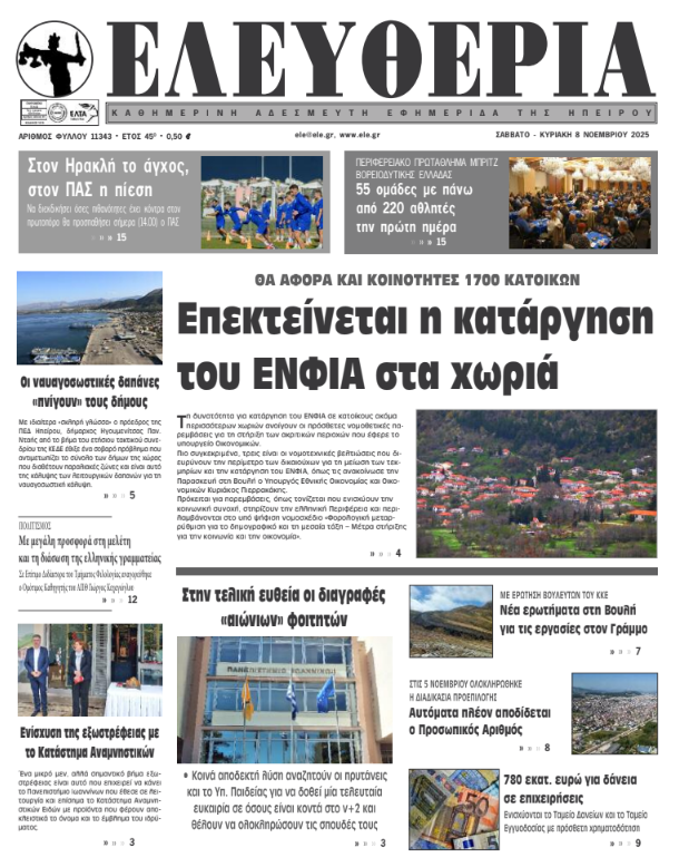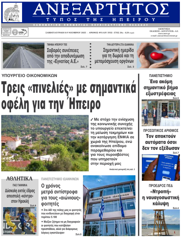 ΑρχικήTOP STORIES TOP STORIESΗΠΕΙΡΟΣ Τα πρωτοσέλιδα των γιαννιώτικων εφημερίδων 08.11.2025 0 FacebookTwitterWhatsAppEmailΤυπώνωViber Διαβάστε στα πρωτοσέλιδα των γιαννιώτικων εφημερίδων 8-9 Νοεμβρίου 2025 TagsΓΙΑΝΝΙΩΤΙΚΕΣ ΕΦΗΜΕΡΙΔΕΣΠΡΩΤΟΣΕΛΙΔΑ FacebookTwitterWhatsAppEmailΤυπώνωViber Προηγούμενο άρθροΓ. ΣΤΥΛΙΟΣ -Μείωση φόρων που ενισχύει το πραγματικό εισόδημαΕπόμενο άρθροΤα του Καίσαρος… ΣΧΕΤΙΚΑ ΑΡΘΡΑ Τα πρωτοσέλιδα των γιαννιώτικων εφημερίδων ΗΠΕΙΡΟΣ 07.11.2025 Τα πρωτοσέλιδα των γιαννιώτικων εφημερίδων ΗΠΕΙΡΟΣ 06.11.2025 Τα πρωτοσέλιδα των γιαννιώτικων εφημερίδων ΗΠΕΙΡΟΣ 05.11.2025 Τα πρωτοσέλιδα των γιαννιώτικων εφημερίδων ΗΠΕΙΡΟΣ 04.11.2025 Τα πρωτοσέλιδα των γιαννιώτικων εφημερίδων TOP STORIES 01.11.2025 Τα πρωτοσέλιδα των γιαννιώτικων εφημερίδων ΗΠΕΙΡΟΣ 31.10.2025 ΣΤΗΝ ΙΔΙΑ ΚΑΤΗΓΟΡΙΑ Μαθητές του 5ου Γυμνασίου Ιωαννίνων στην κορυφή του Μιτσικελίου ΗΠΕΙΡΟΣ 07.11.2025 Επίτιμος Διδάκτορας του Τμήματος Φιλολογίας ο Γιώργος Κεχαγιόγλου ΗΠΕΙΡΟΣ 07.11.2025 Οι ναυαγοσωστικές δαπάνες «πνίγουν» τους δήμους ΗΠΕΙΡΟΣ 07.11.2025 Ενημερωτική ημερίδα στα Ιωάννινα για τη δωρεά και μεταμόσχευση οργάνων ΗΠΕΙΡΟΣ 07.11.2025 Εγκαίνια στο Κατάστημα Αναμνηστικών του Πανεπιστημίου Ιωαννίνων ΗΠΕΙΡΟΣ 07.11.2025 Εντοπίστηκε πεζοπόρος που είχε χάσει τον προσανατολισμό του στο Ανήλιο Μετσόβου ΗΠΕΙΡΟΣ 07.11.2025 ΜΗ ΧΑΣΕΤΕ Οι ναυαγοσωστικές δαπάνες «πνίγουν» τους δήμους Έκτακτο δελτίο επιδείνωσης από την ΕΜΥ – Πού θα βρέχει το επόμενο τριήμερο Μπαλωθιές τέλος στην Κρήτη – Τα μέτρα για την παράνομη οπλοκατοχή Χωρίς πινακίδες παραμένουν χιλιάδες δίκυκλα Ενστάσεις δικυκλιστών για τις θερμοπλαστικές διαβάσεις ΔΗΜΟΦΙΛΗ ΤΗΝ ΔΕΥΤΕΡΑ -Νομαρχιακή Συνδιάσκεψη του ΣΥΡΙΖΑ ΠΣ Ιωαννίνων Η Ευρωπαϊκή Ένωση στηρίζει την καθαρή μετάβαση Κατέρρευσε στο β’ ημίχρονο ο ΠΑΣ απέναντι στον Ηρακλή Ιταλία: Αυξάνονται οι αιωνόβιοι στη χώρα -2.000 περισσότεροι σε σχέση με πέρυσι Γ. ΣΤΥΛΙΟΣ -Μείωση φόρων που ενισχύει το πραγματικό εισόδημα
